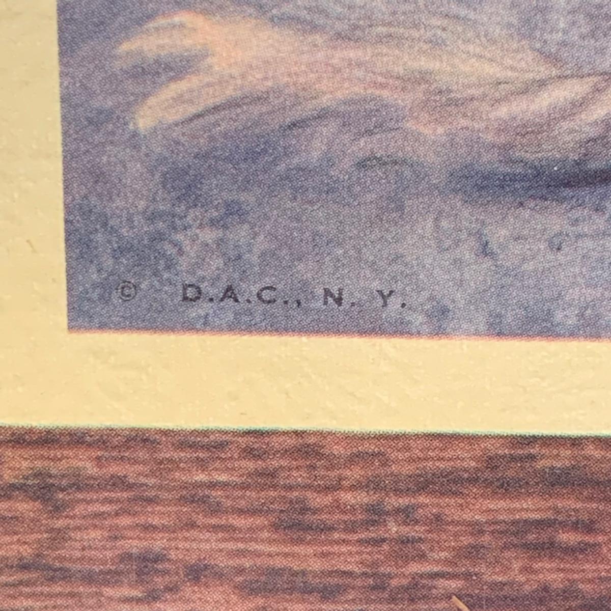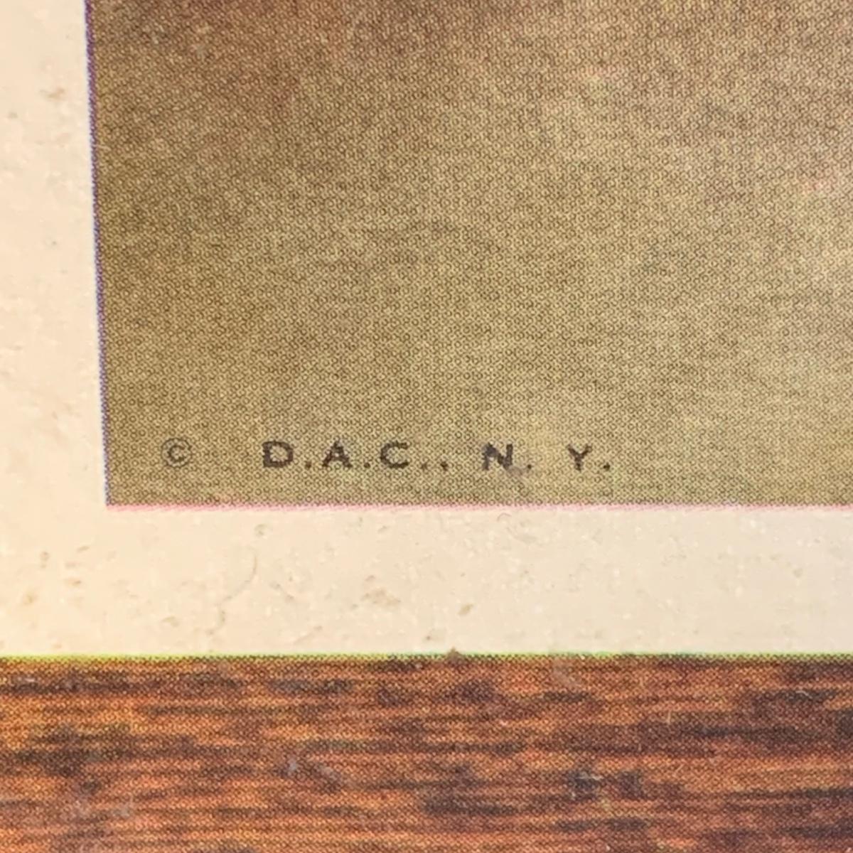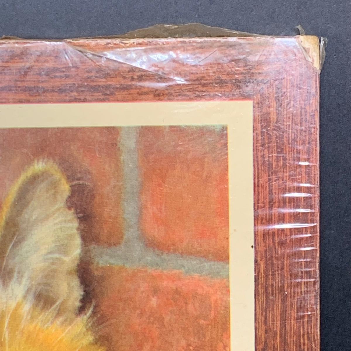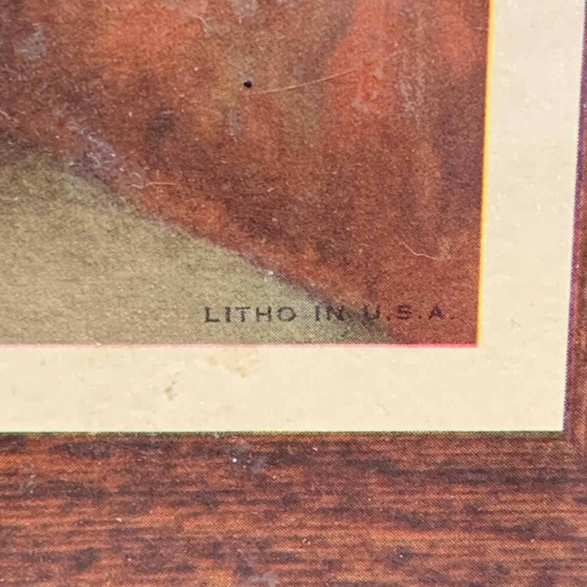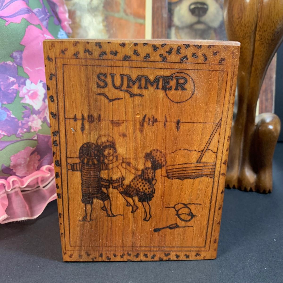LOT 58R: Vintage Sad "Big Eyes" Cat & Dog Wall Lithograph Plaques 11"x9.25", MCM Siamese Cat Sculpture 12”, Big Eyed Musical Doll Playing Raindrops & Wooden 4-Seasons Bank