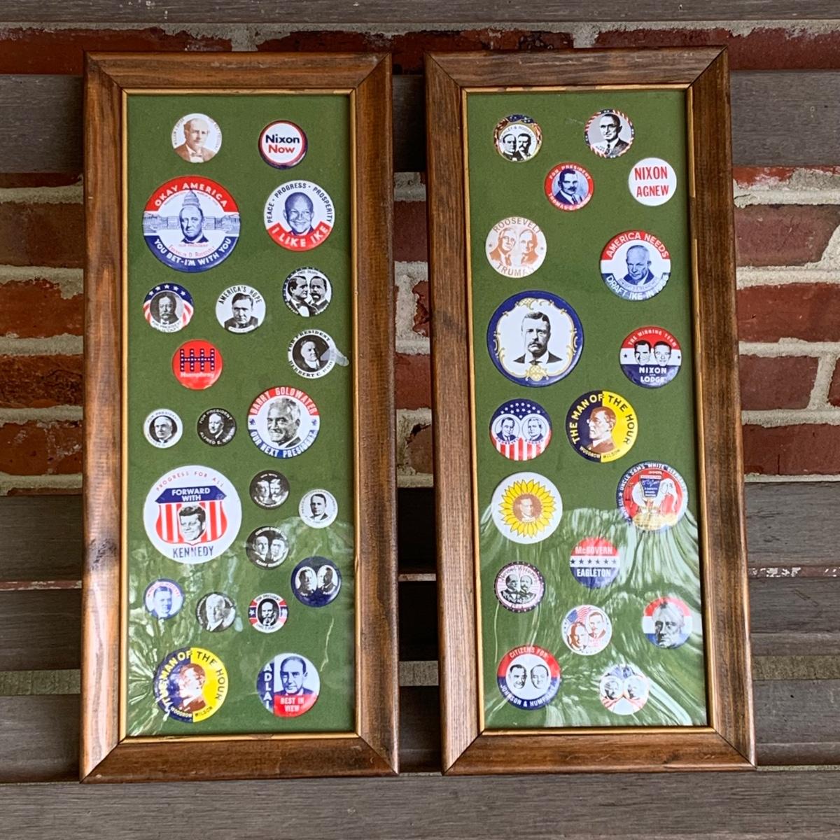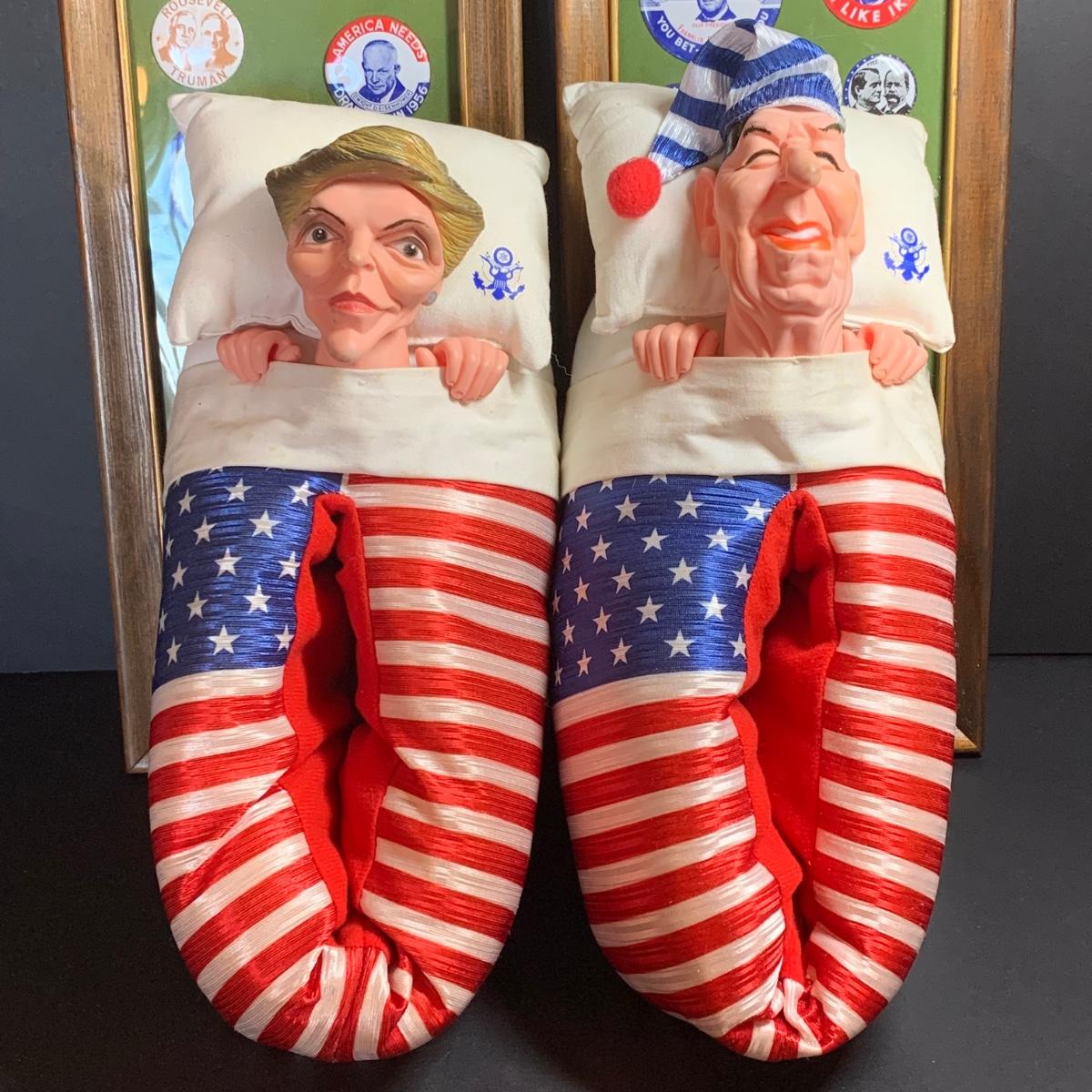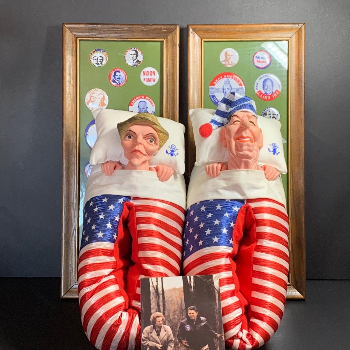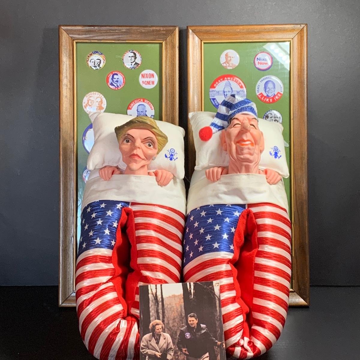 LOT 65R: Framed Political Buttons, President Ronald Regan & Nancy Regan Sleepers (Large) along w/President Reagan & Priime Minister Thatcher Postcard