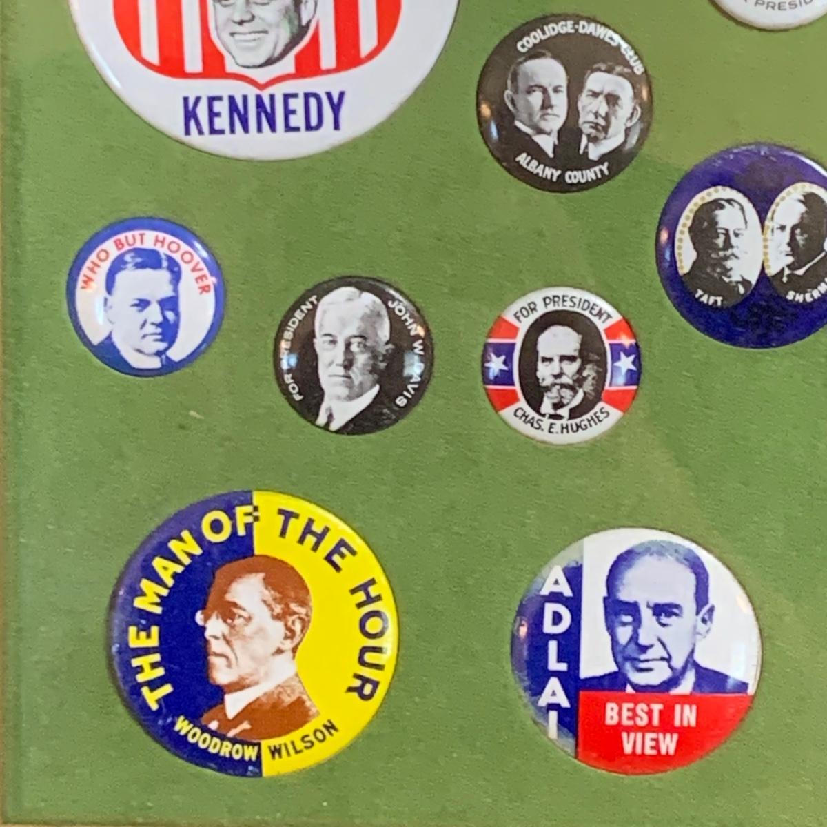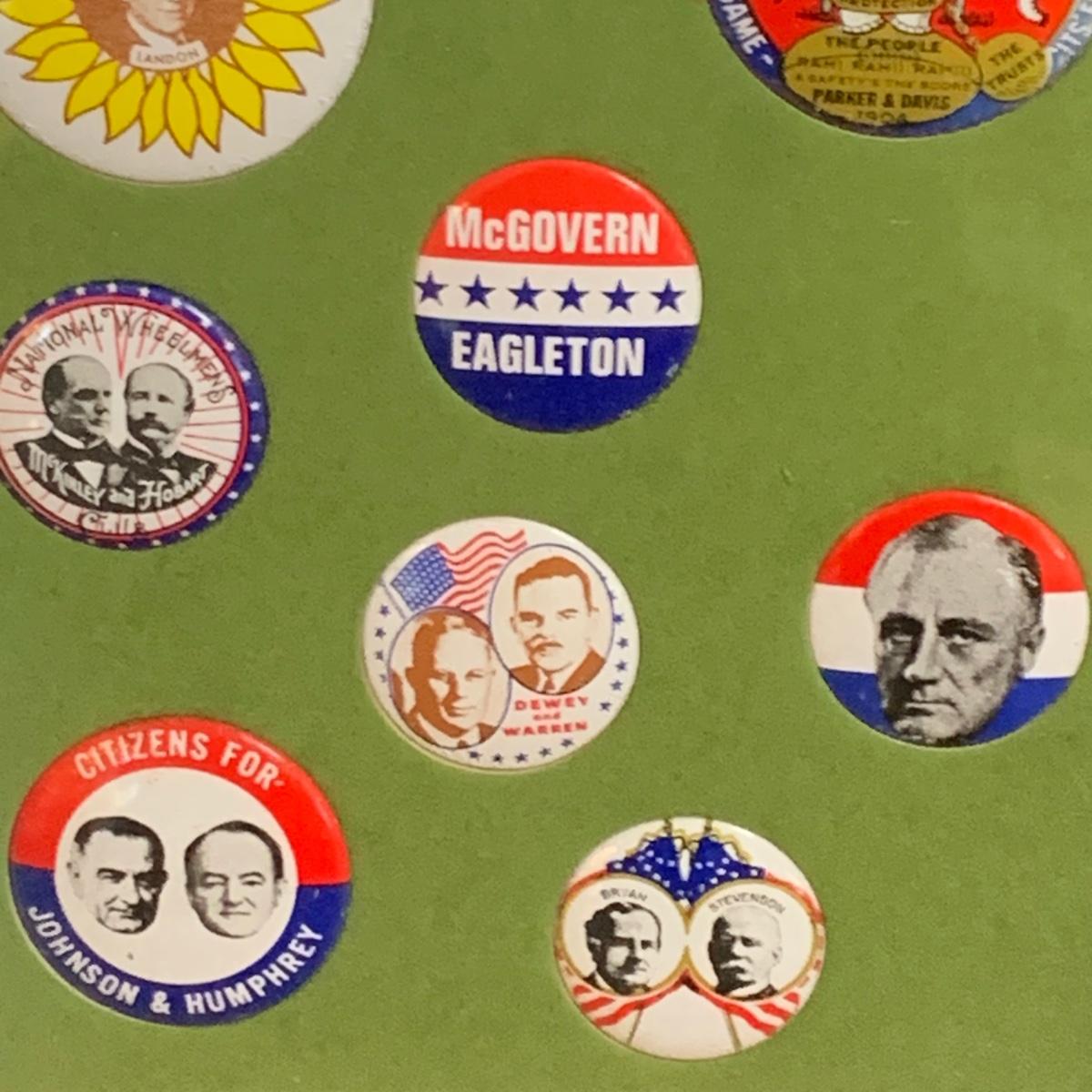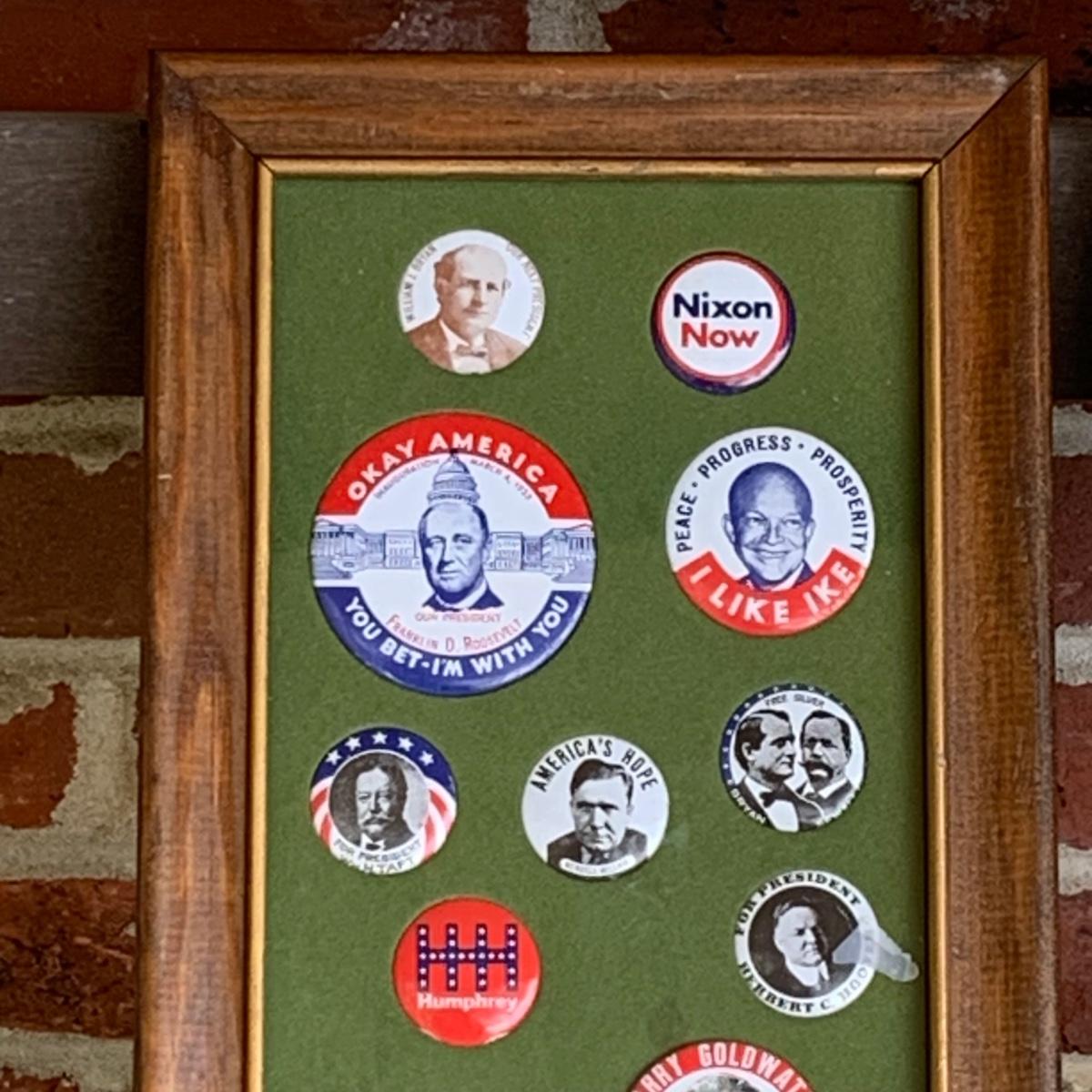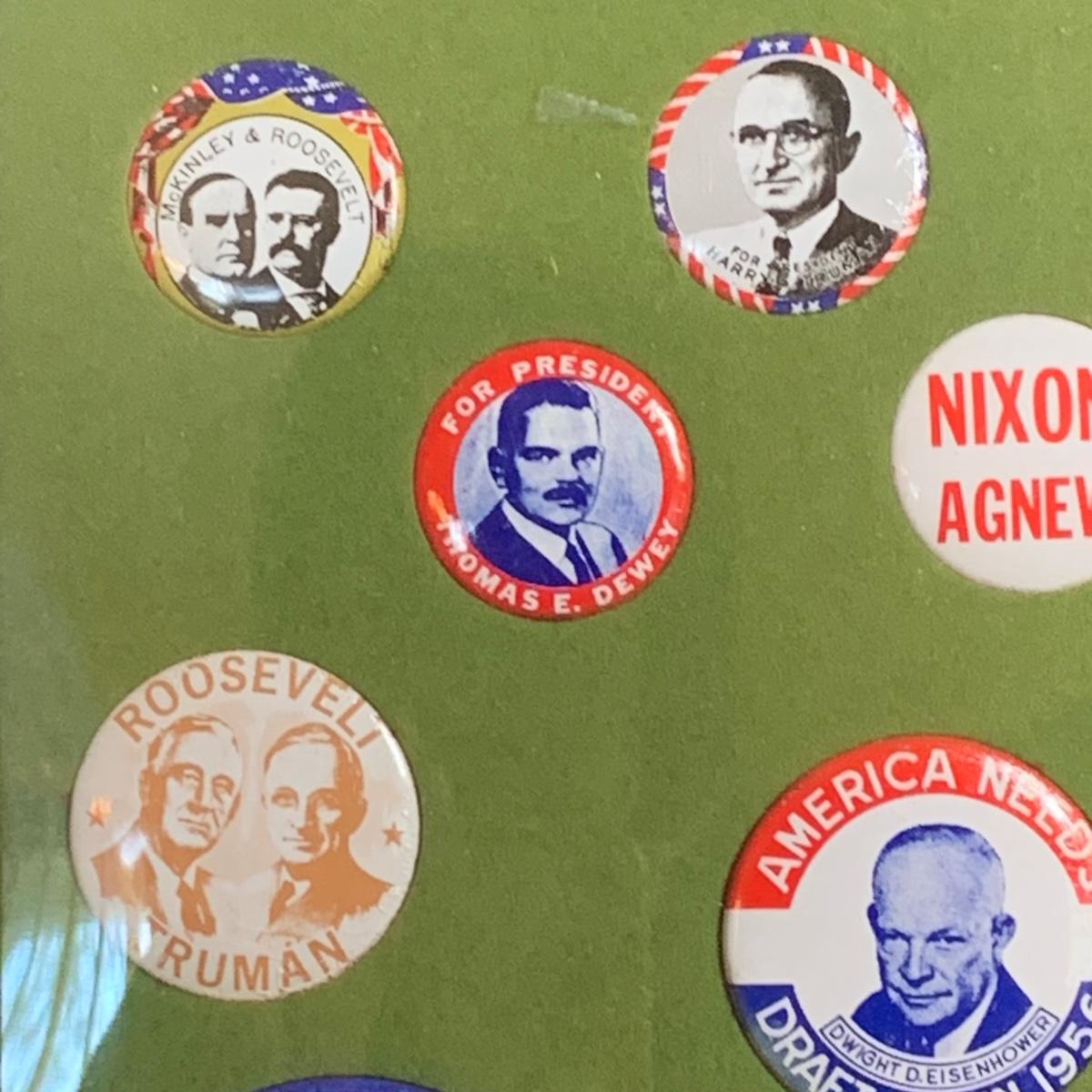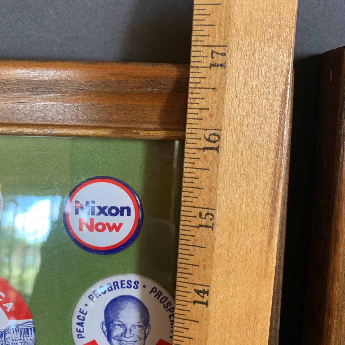 LOT 65R: Framed Political Buttons, President Ronald Regan & Nancy Regan Sleepers (Large) along w/President Reagan & Priime Minister Thatcher Postcard