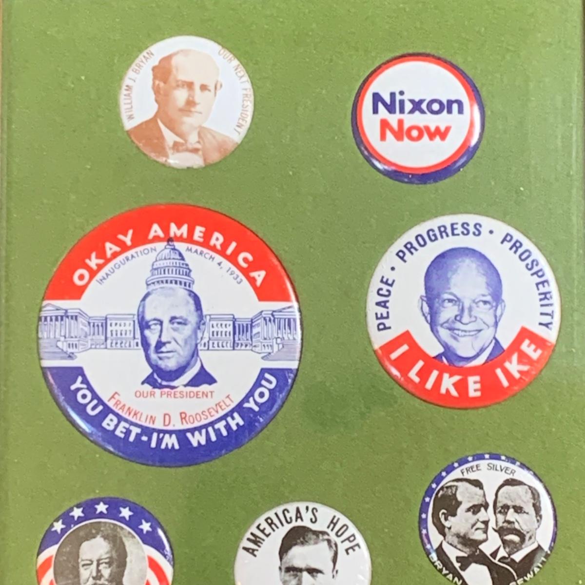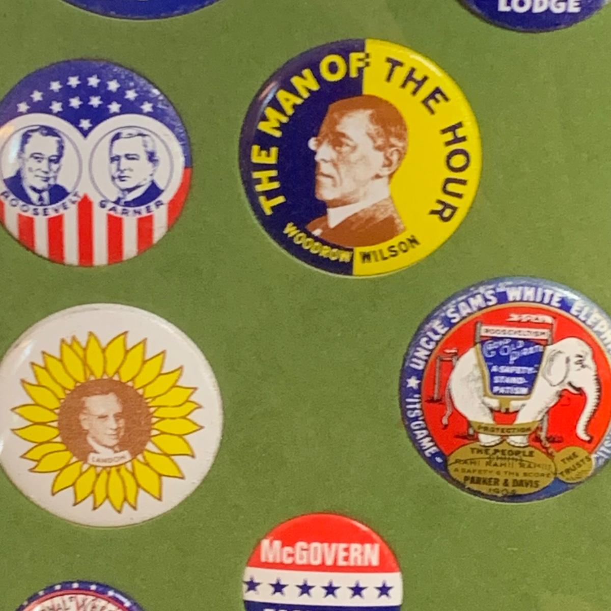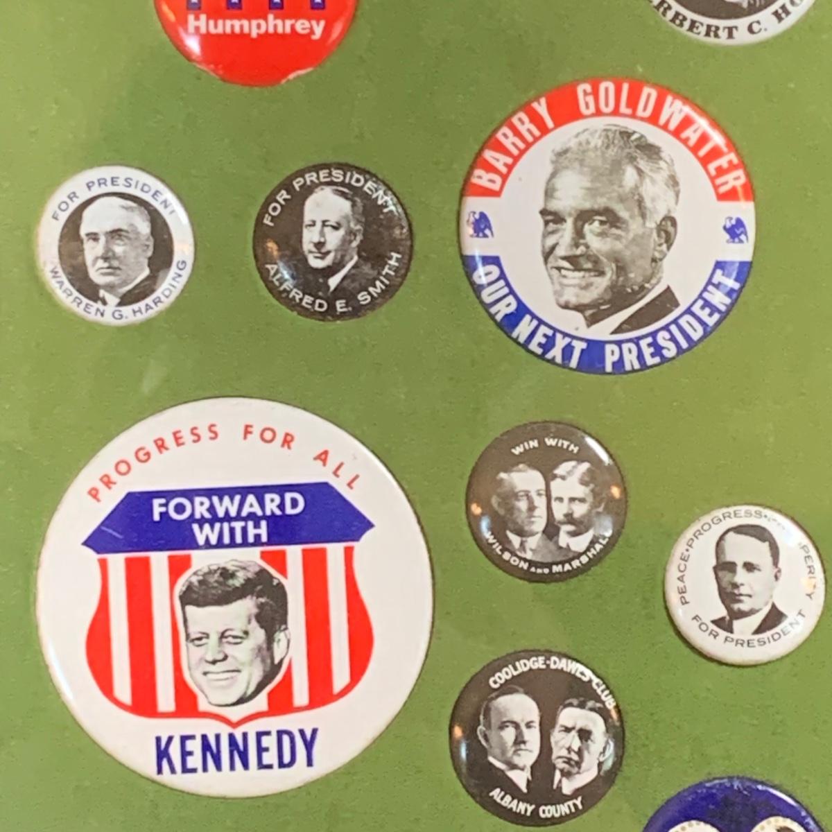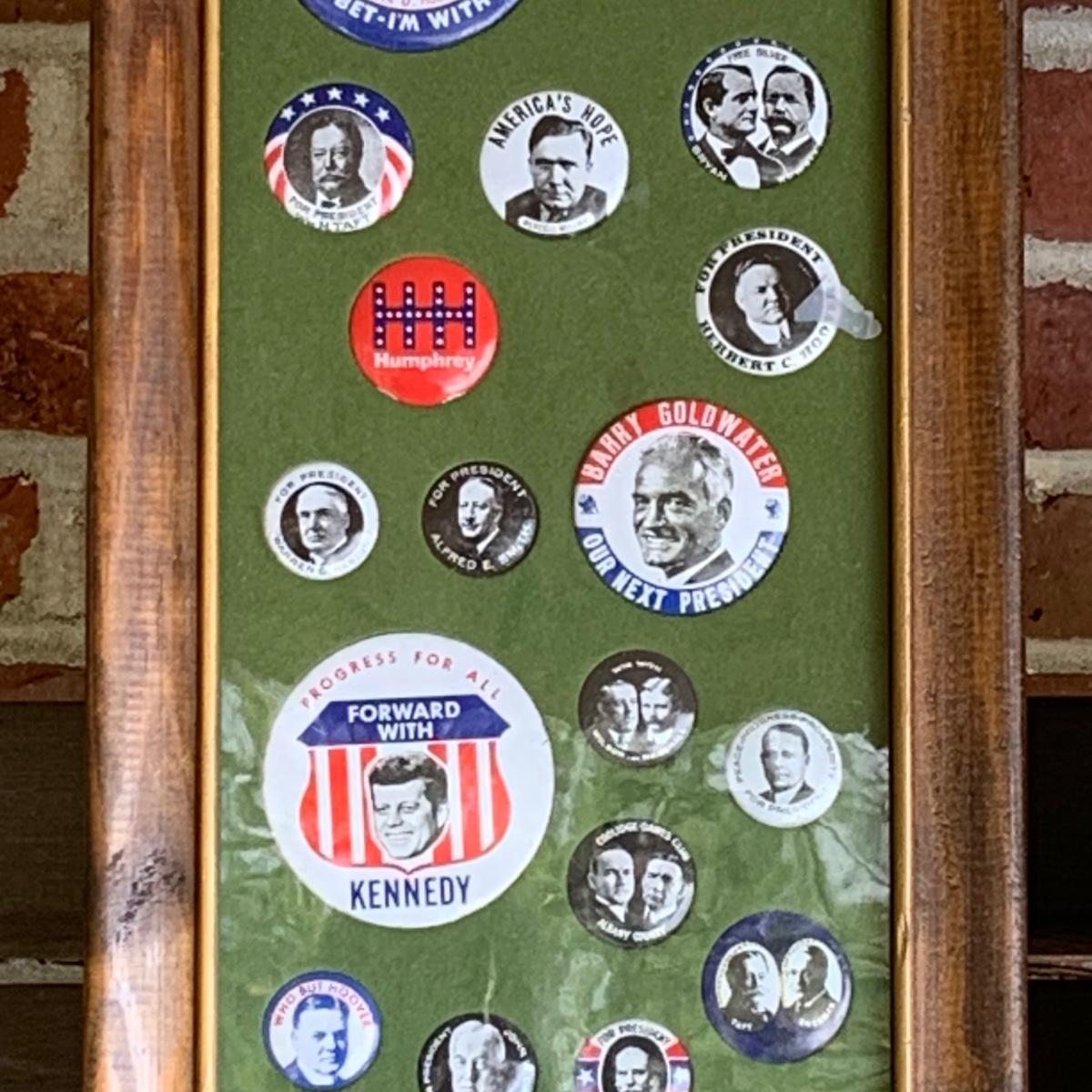 LOT 65R: Framed Political Buttons, President Ronald Regan & Nancy Regan Sleepers (Large) along w/President Reagan & Priime Minister Thatcher Postcard