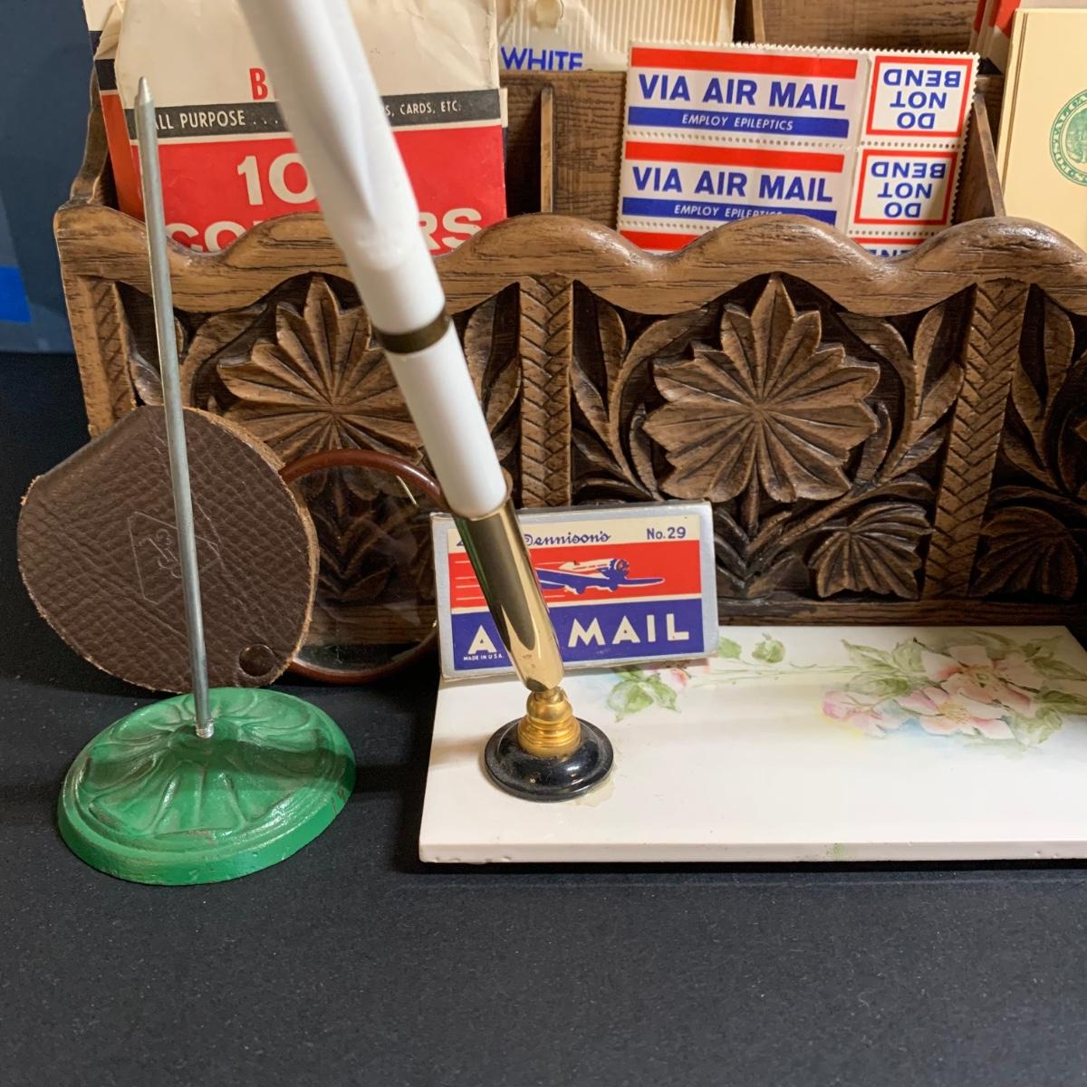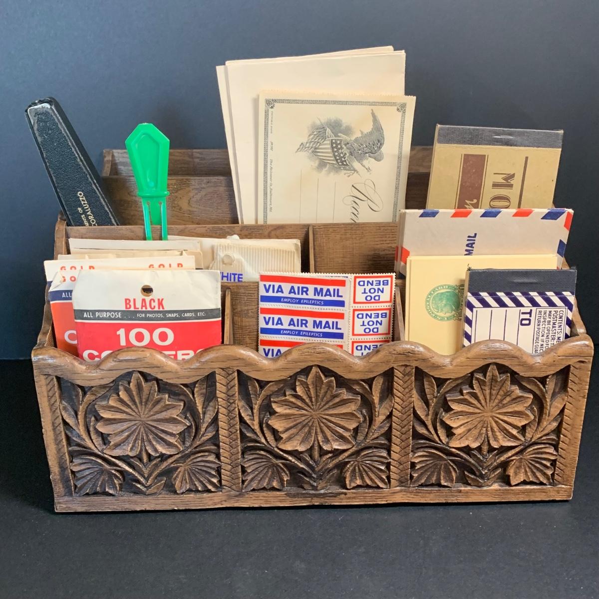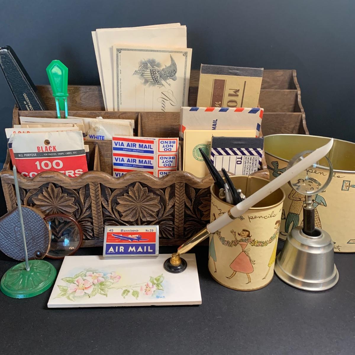 LOT 67R: Vintage Faux Carved Desk Organizers, Vtg. Pewter Inkwell and Desk Accessories