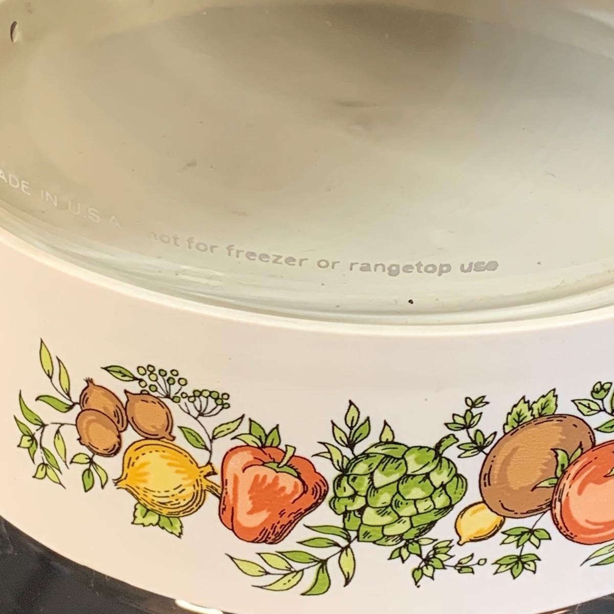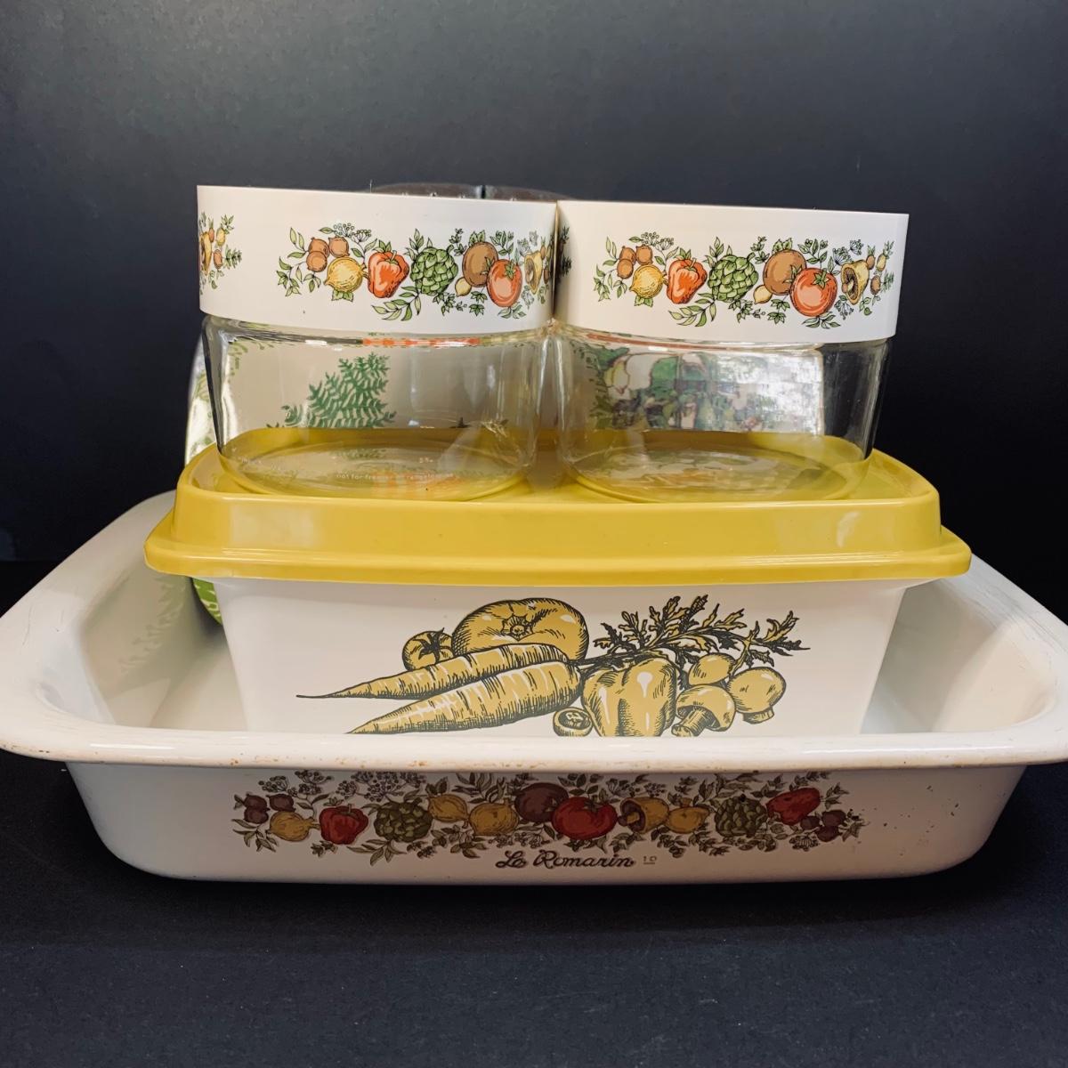 LOT 69R: Corning Ware Nature's Bounty 2qt. Casserole w/Refrigerator Lid, Corning Ware Spice of Life Casserole & Storage Jars, Vegetable Trivets