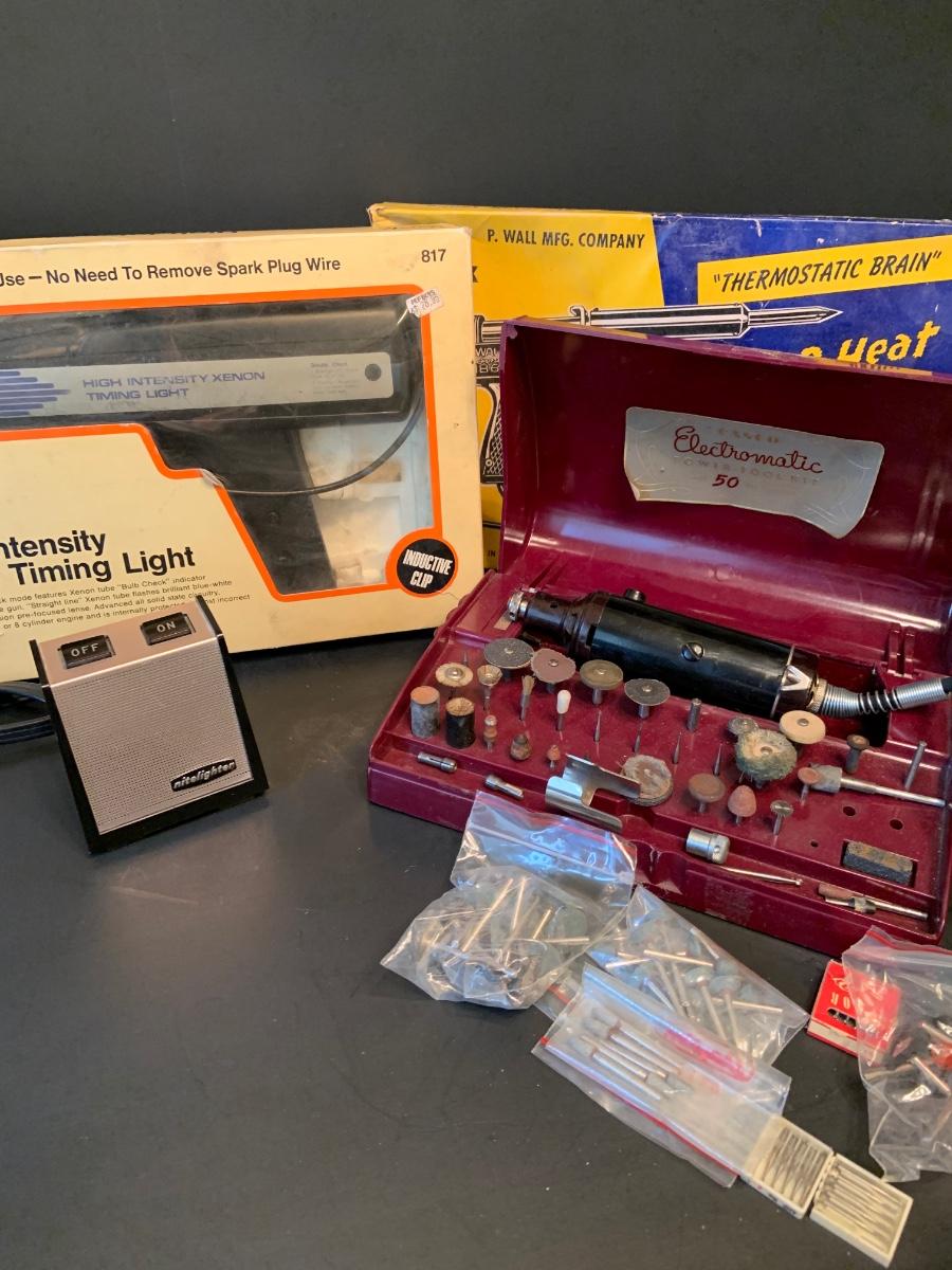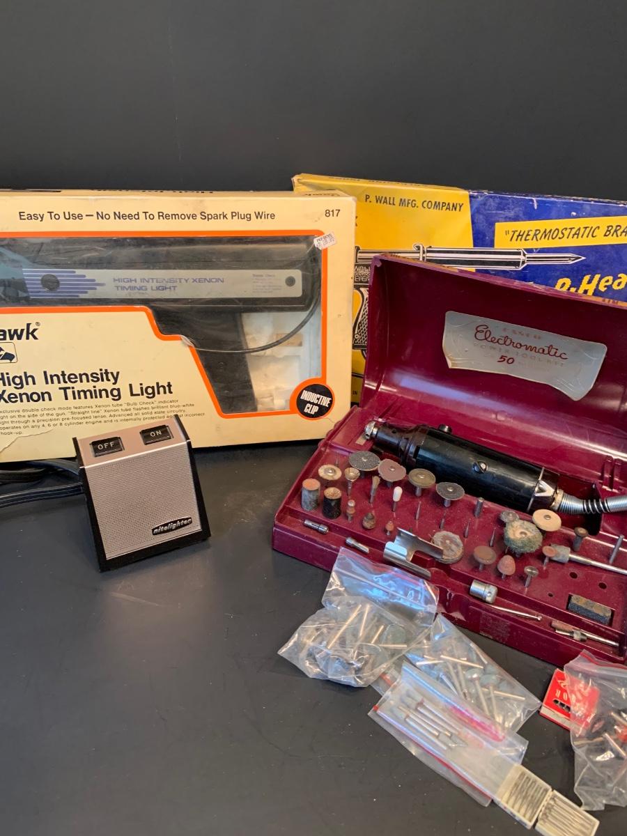 LOT:109G: Vintage Tools Including Hawk High Intensity Xenon Timing Light; Trig-R-Heat Sodering Irons, Casco Electronatic Power Tool Kit and More