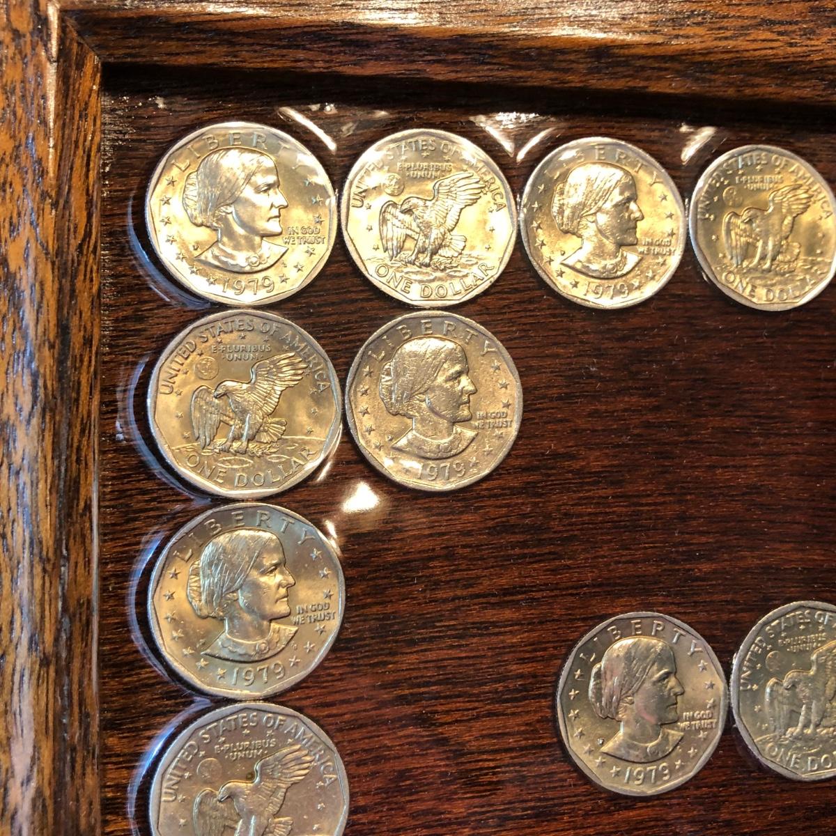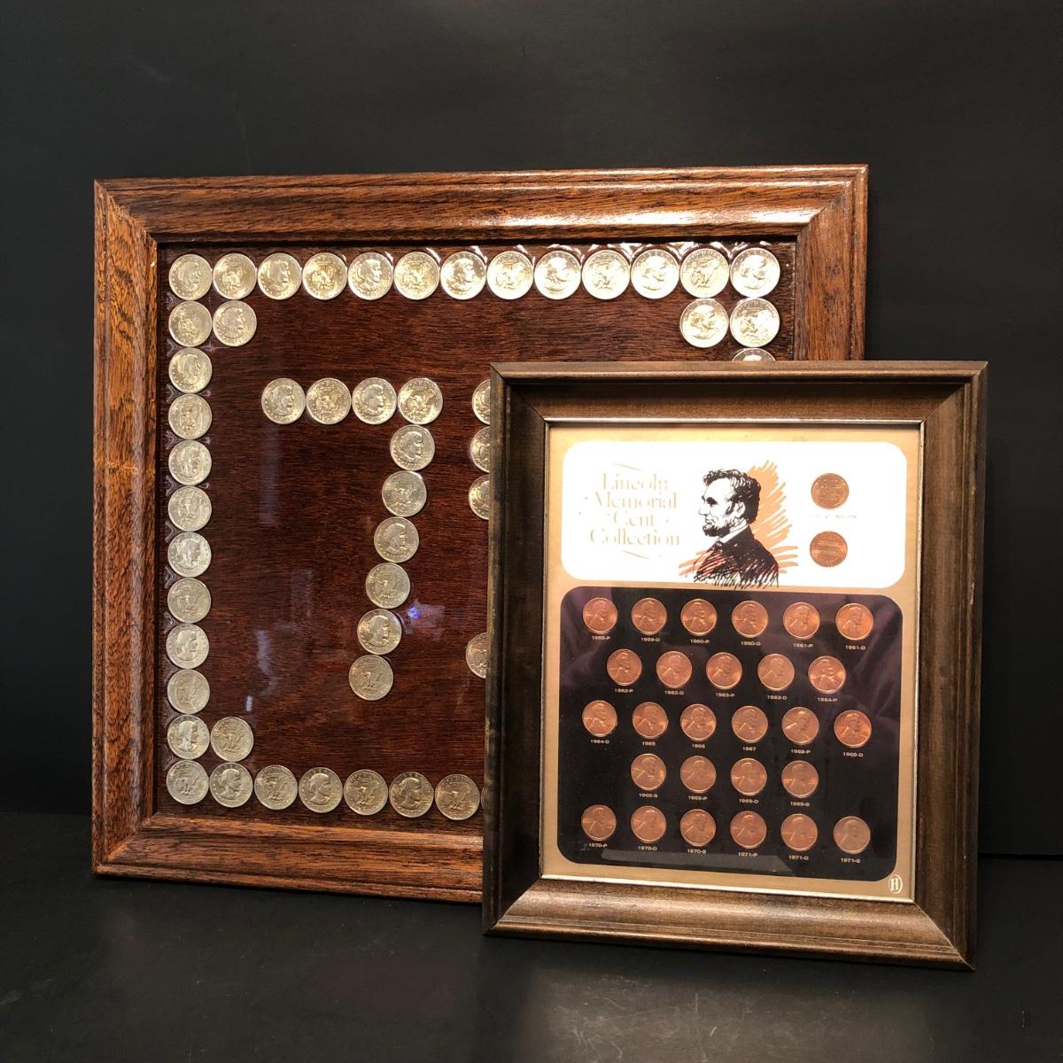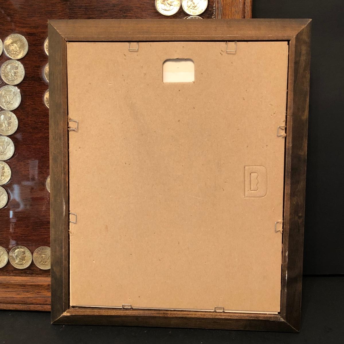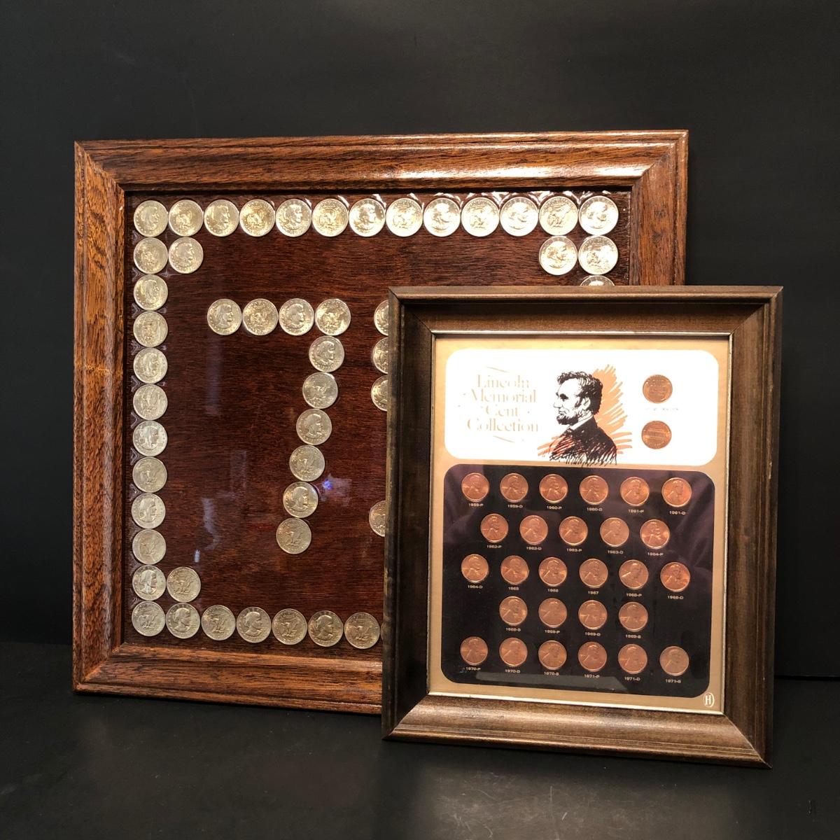 Framed pennies measure 10 x 12 and framed dollar coins 17 x 16. Susan B. Anthony Coins are fixed to the frame with apoxy & may or may not be able to be removed. Pennies are under glass in the frame.