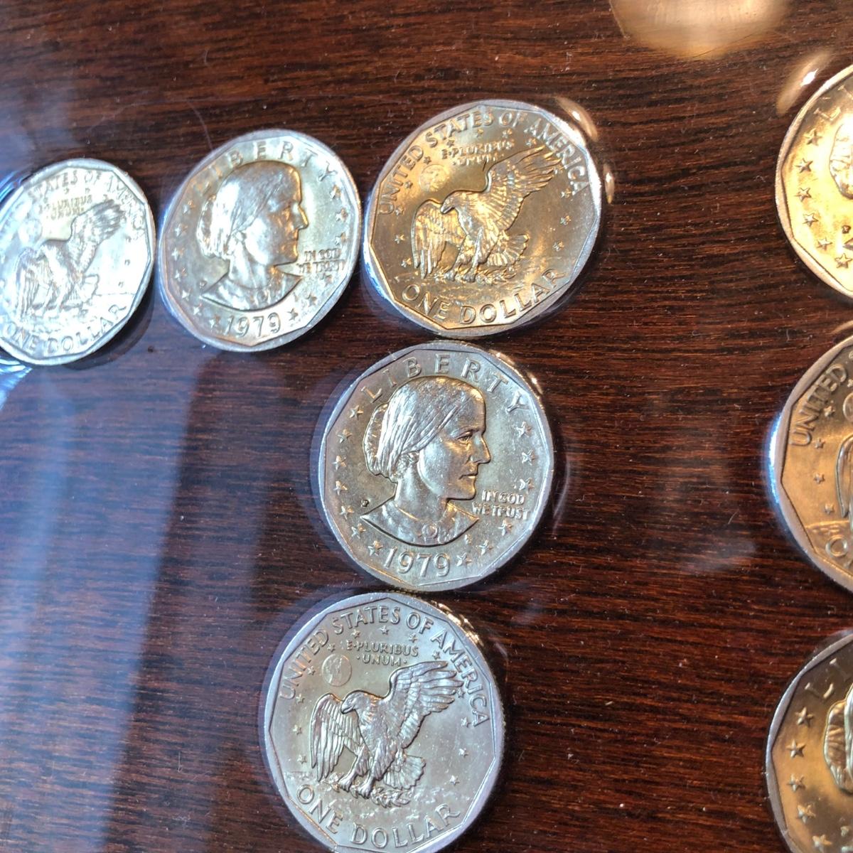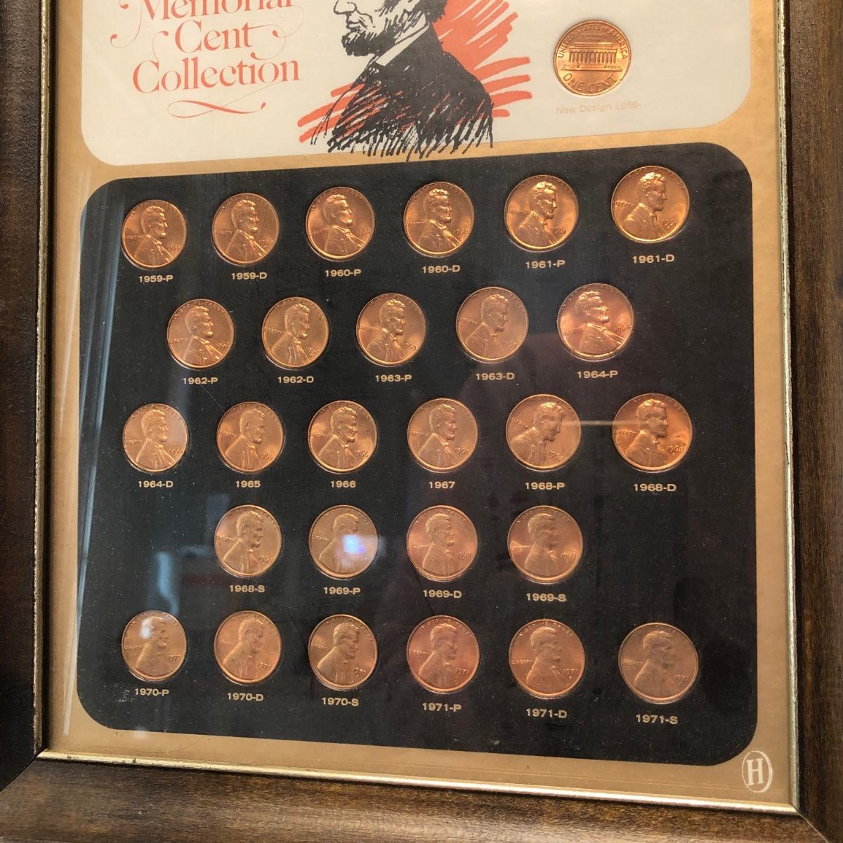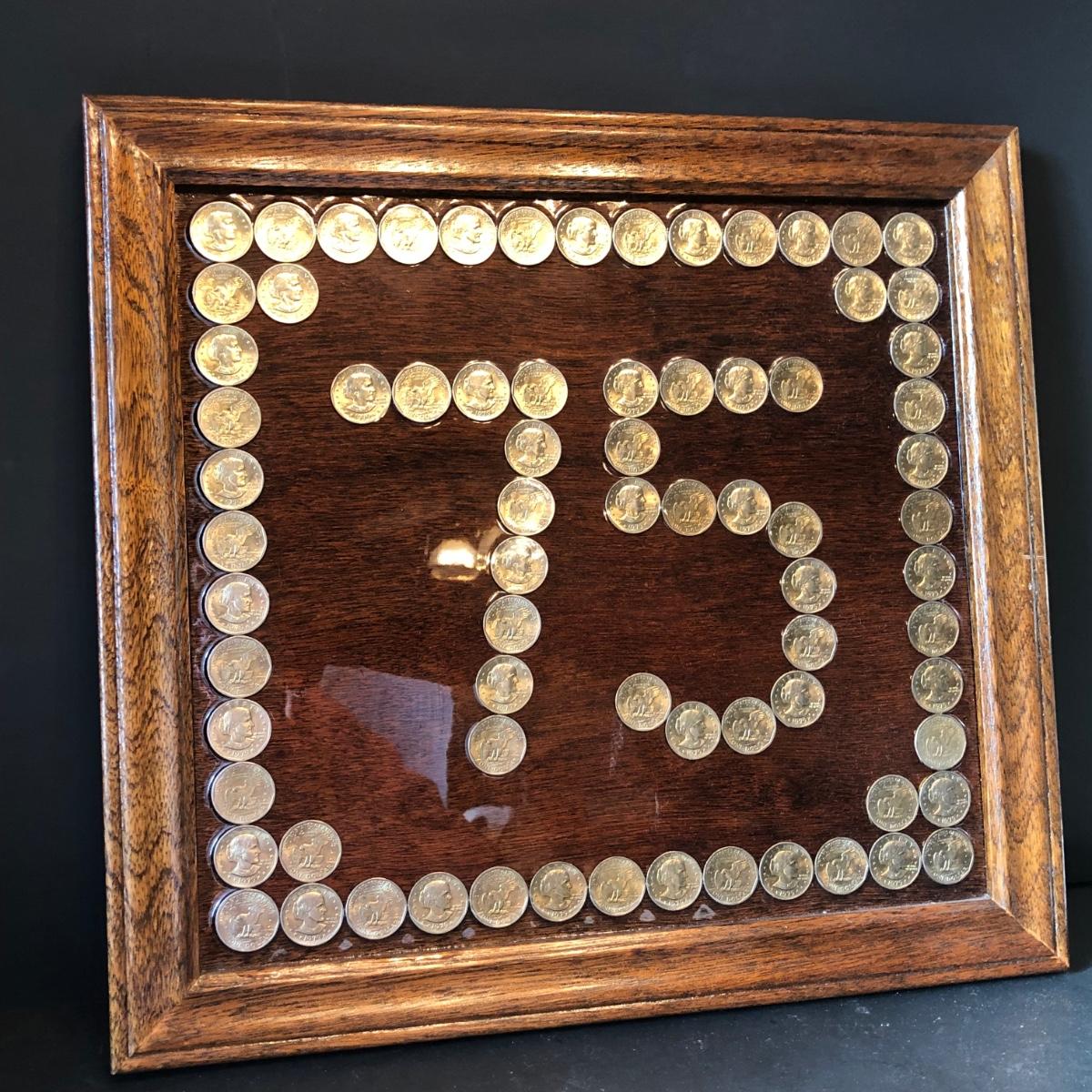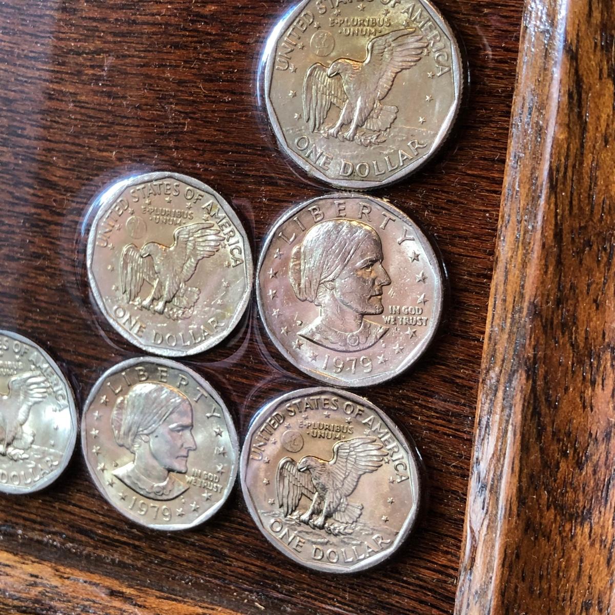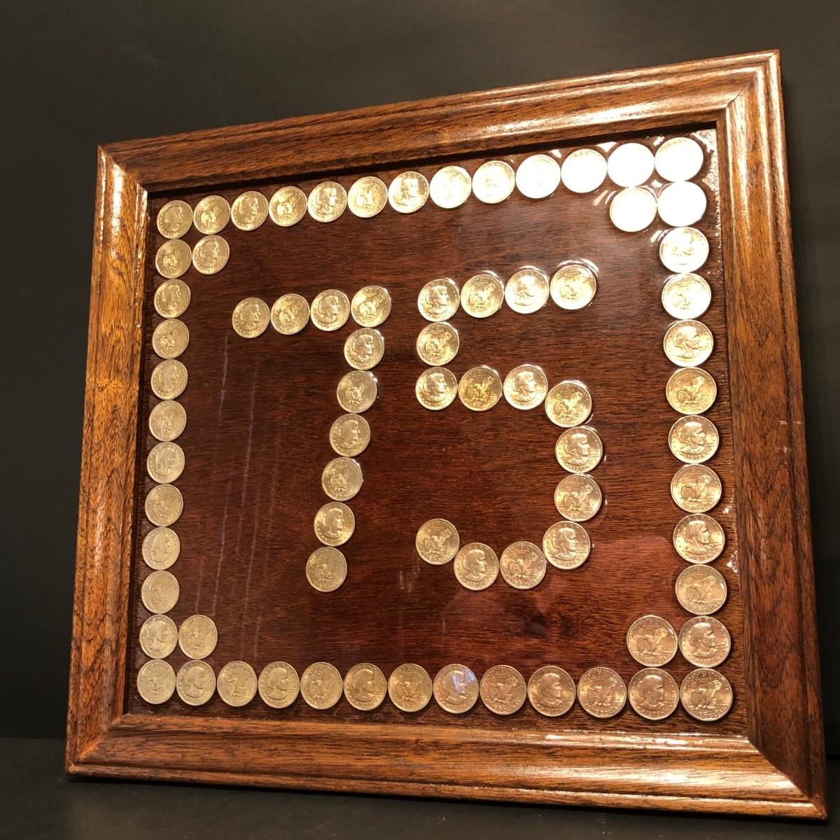 Framed pennies measure 10 x 12 and framed dollar coins 17 x 16. Susan B. Anthony Coins are fixed to the frame with apoxy & may or may not be able to be removed. Pennies are under glass in the frame.