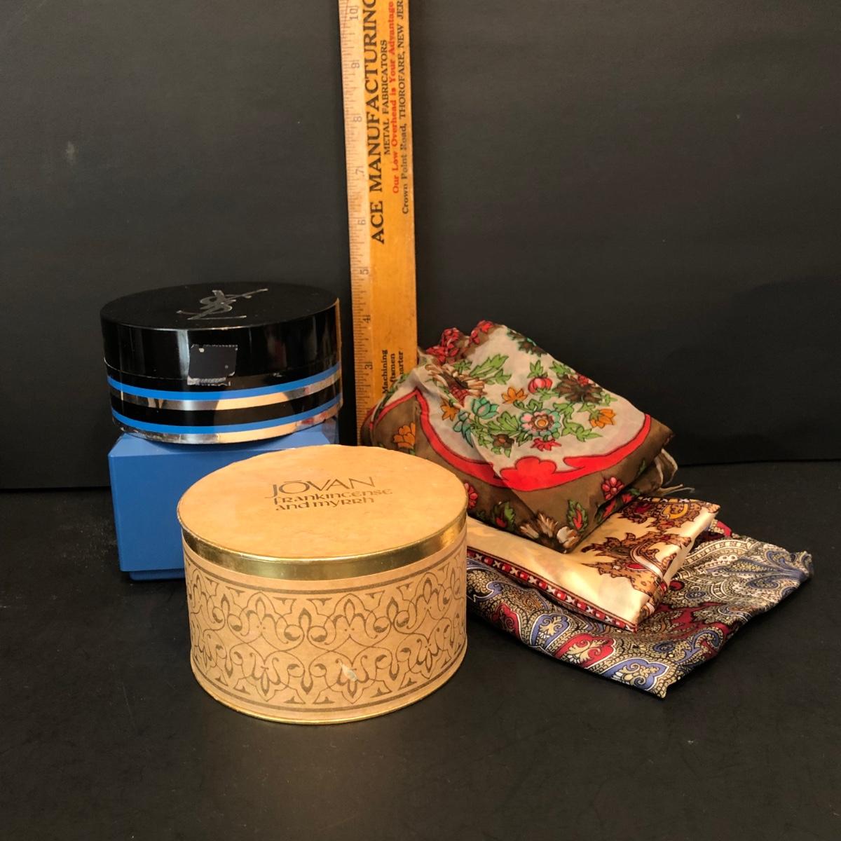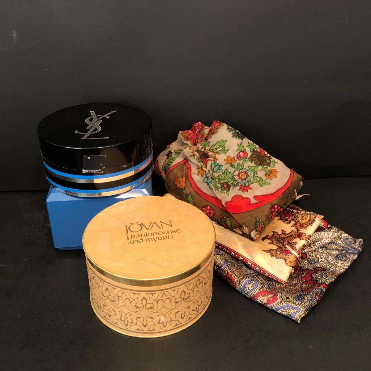 LOT 126M: 1975 Jovan Frankincence & Myrrh Dusting Powder, Yves Saint Laurent Vive Gauche Dusting Powder, Estee Lauder Perfumed Body Powder & Scarves