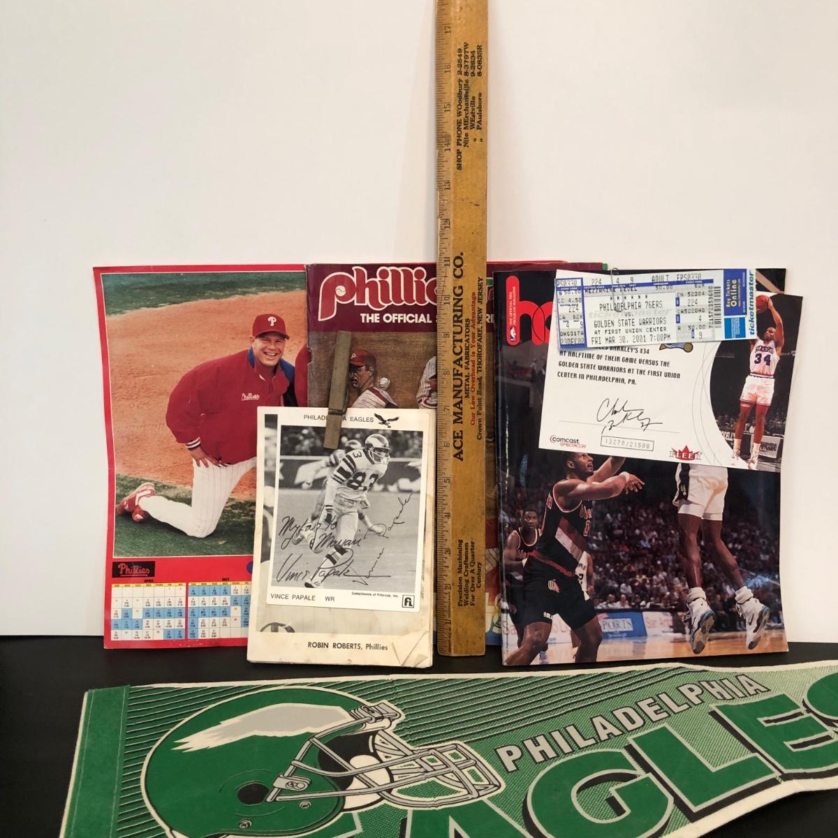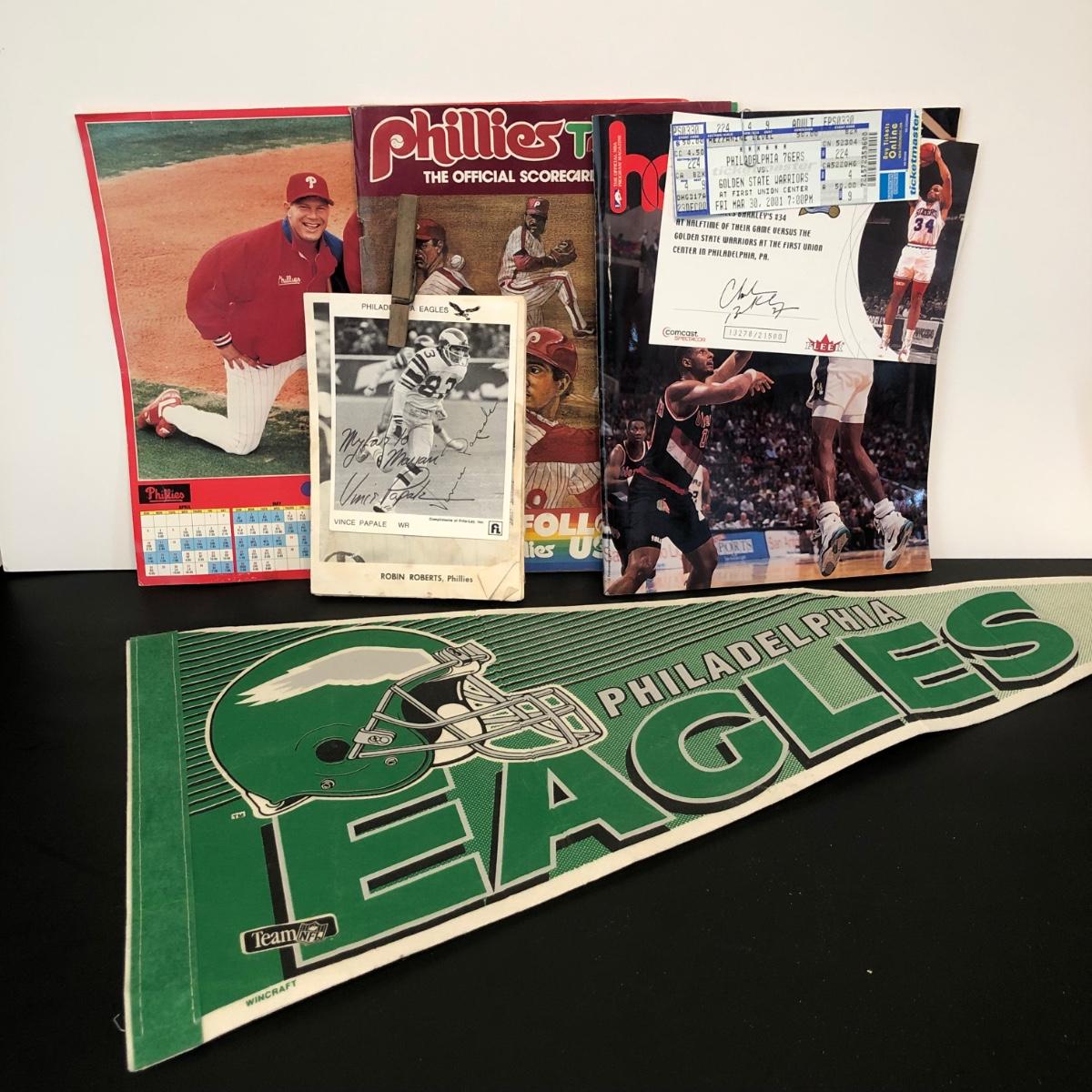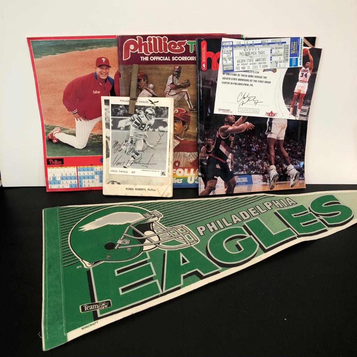 LOT 131M: Philly Sports Collection - Eagles Pennant, 1994 Phillies Season Schedule, 1985 Phillies Today Magazine, Hoop Magazine w/ March 30, 2001 76ers Ticket & More