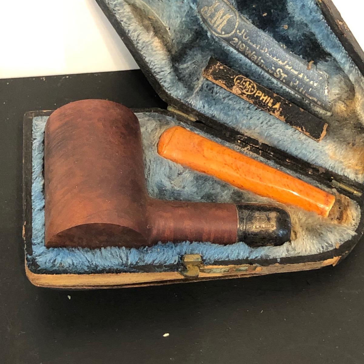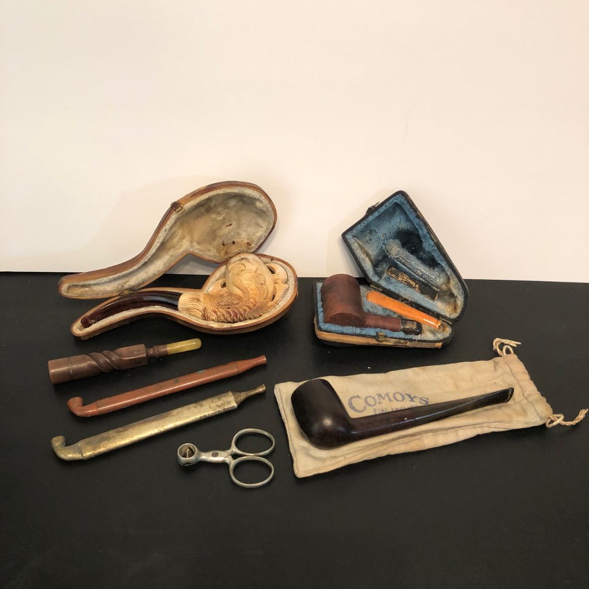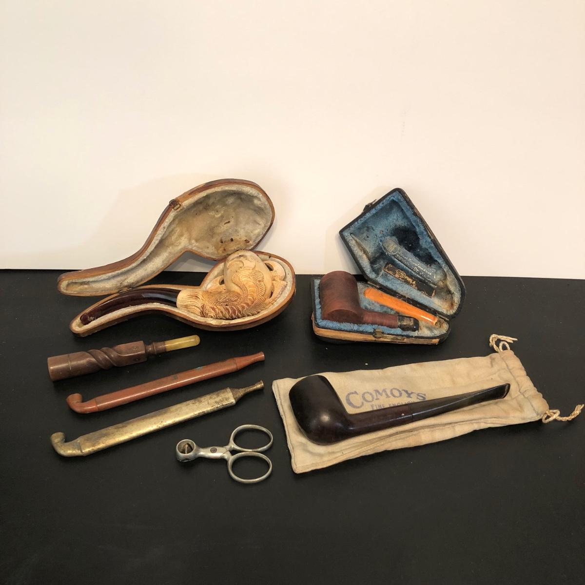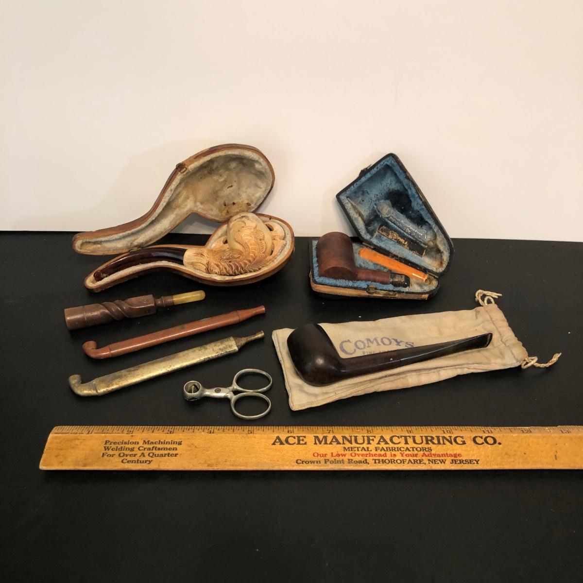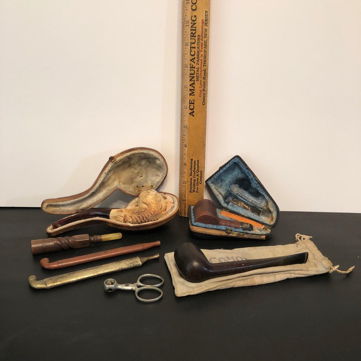 LOT 132M: Vintage Pipes - Meeschaum Carved Pipe w. Case, JM Philadelphia 2-Piece w/ Case, Comoys w/ Bag, Japanes Kiseru Pipes, Wooden Cigarette Holder & Cutter
