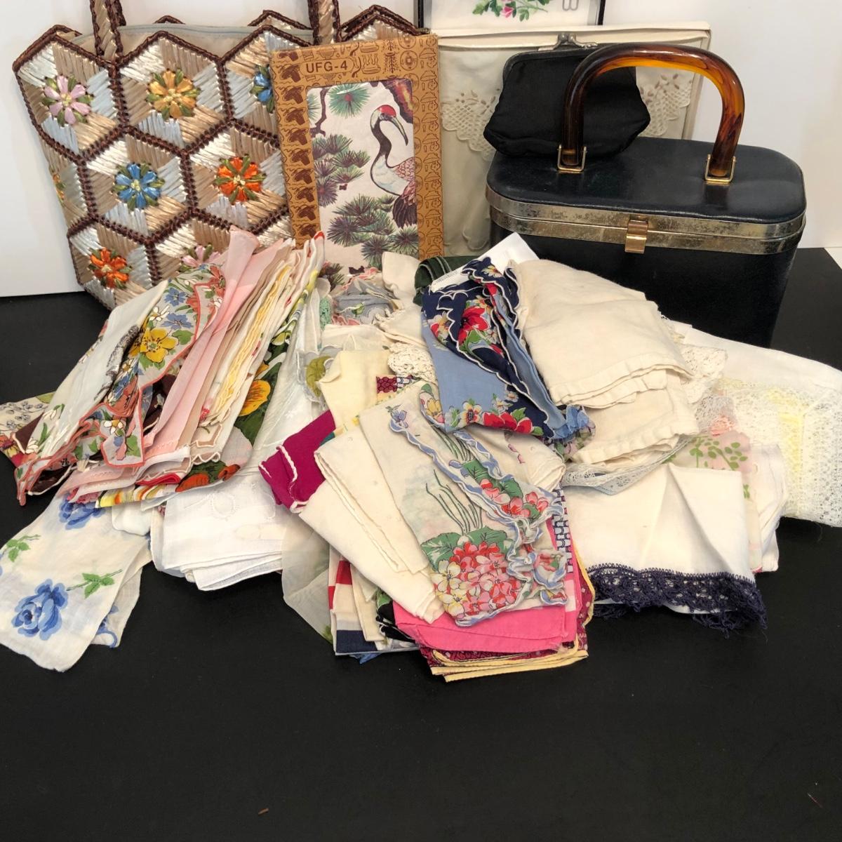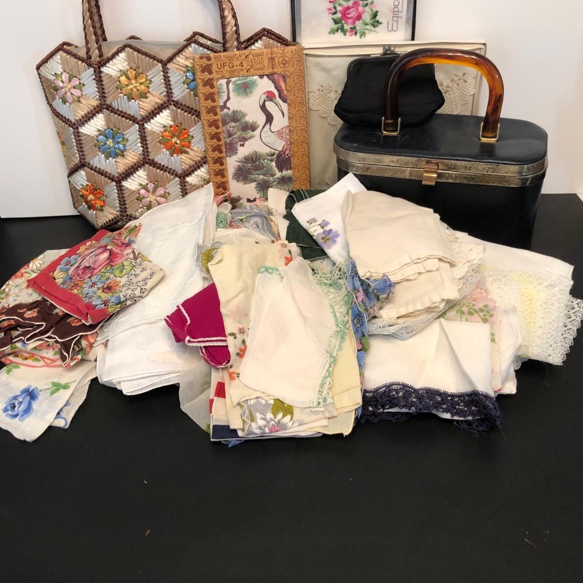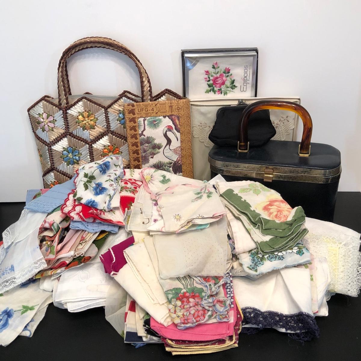 LOT 134M: Vintage JR Florida Box Purse, Woven Handbag & Collection of Vintage Ladies' Handkerchiefs