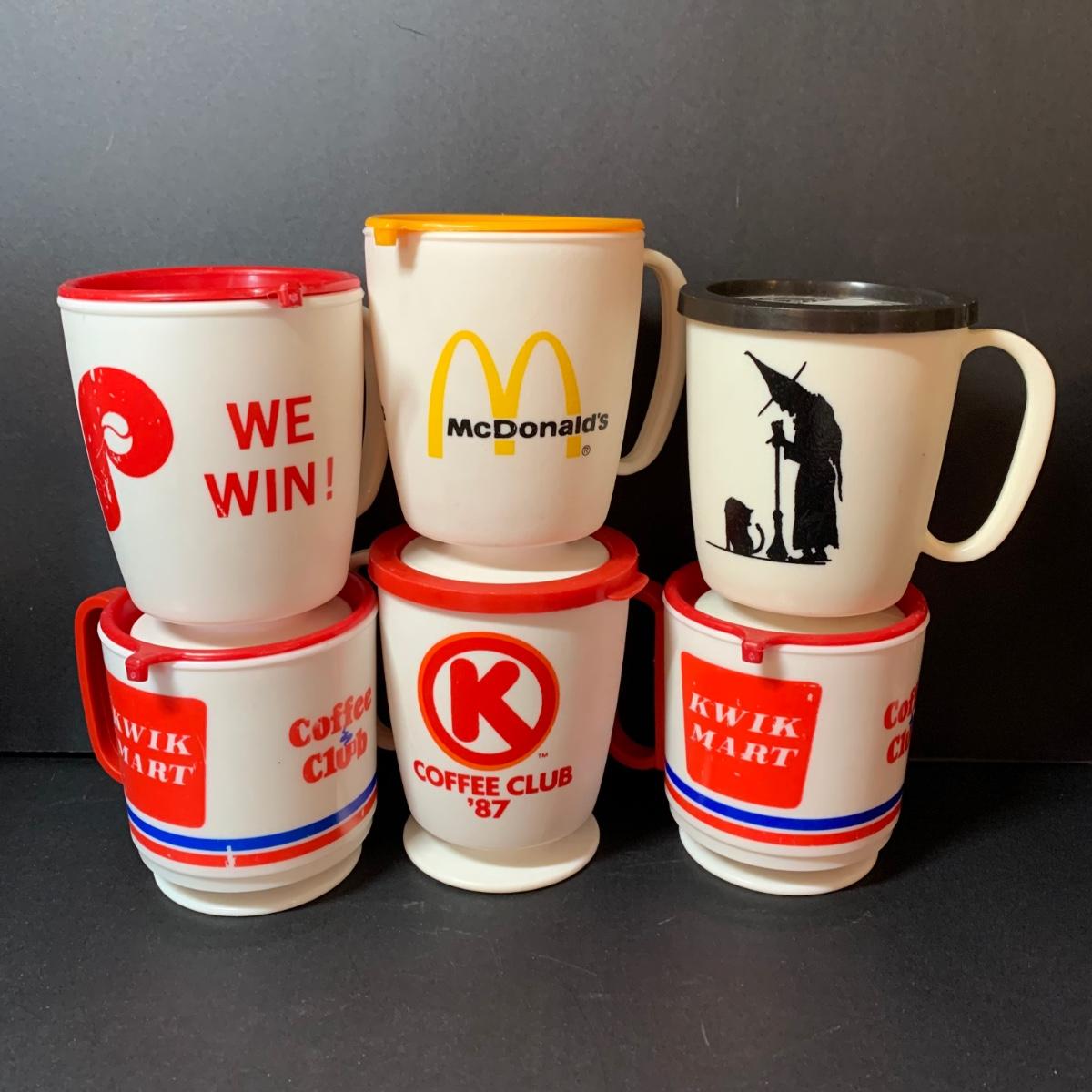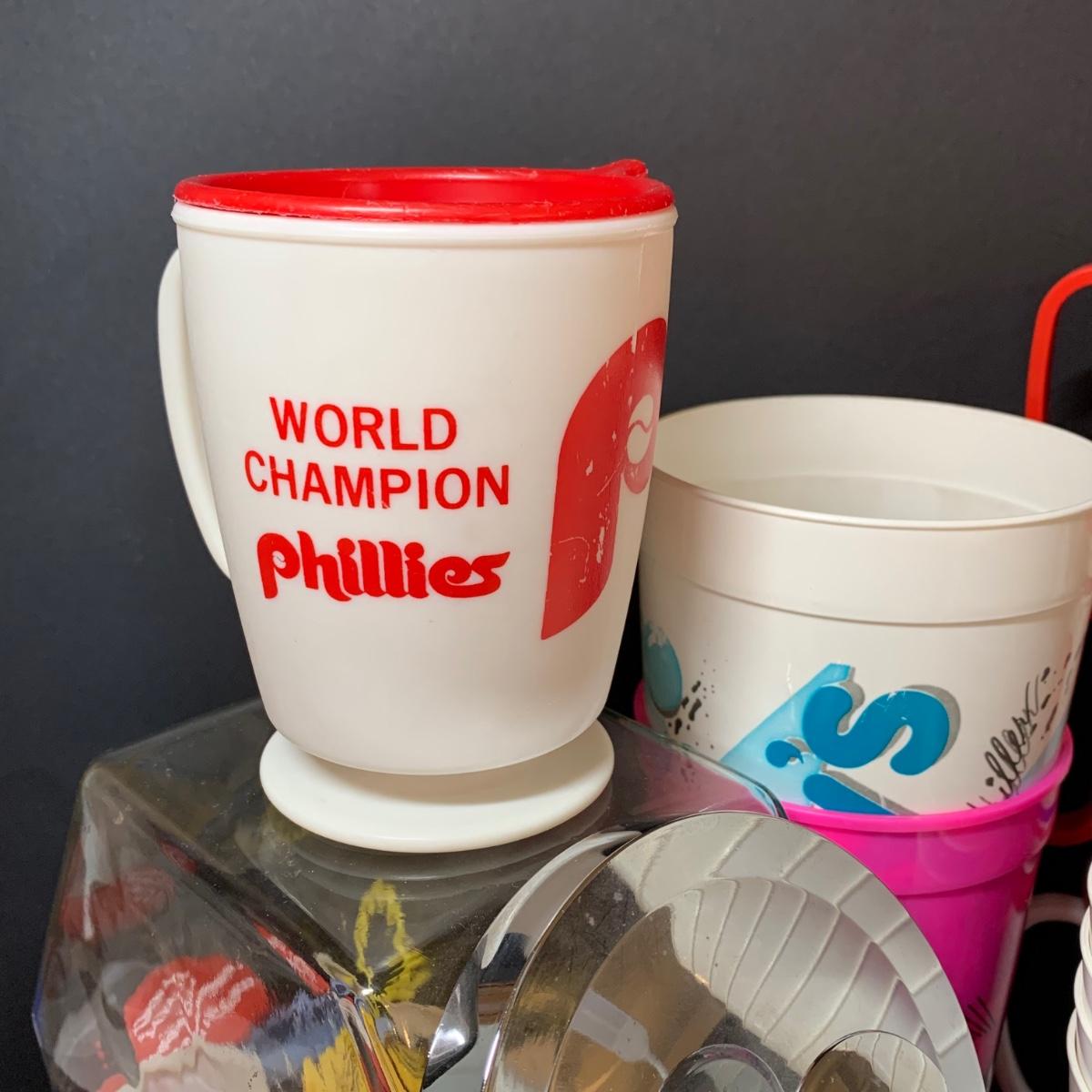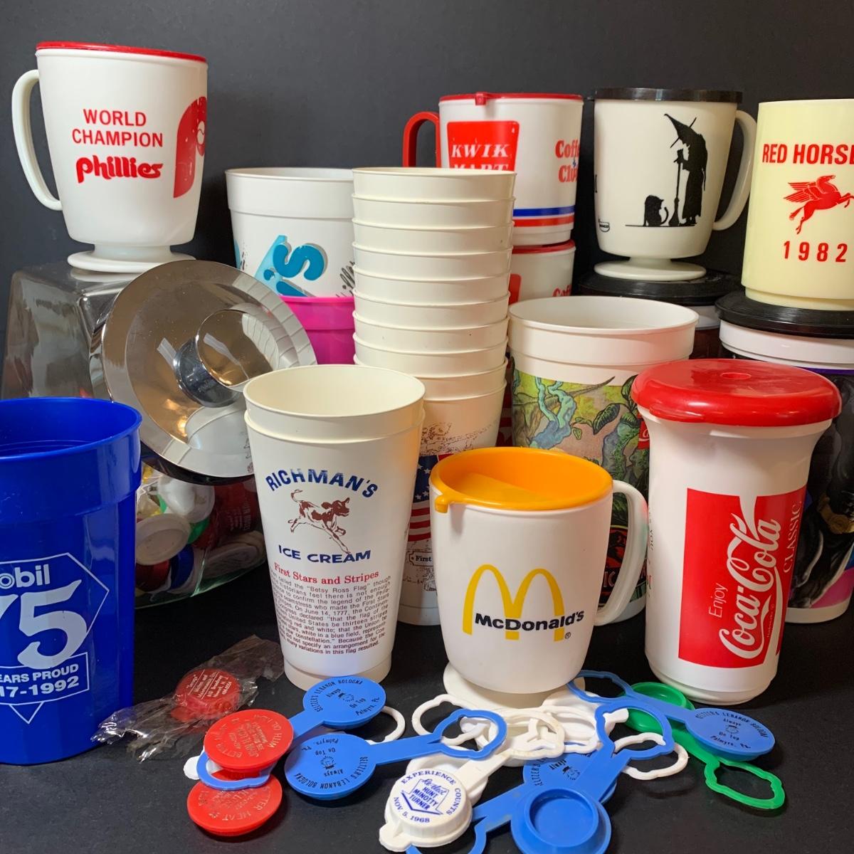 LOT 165R: Vintage Promotional Cups: Richman's Ice Cream, McDonalds, Mobil, Phillies & Vintage Advertising Old Pop/Soda Bottle Replaceable Lids