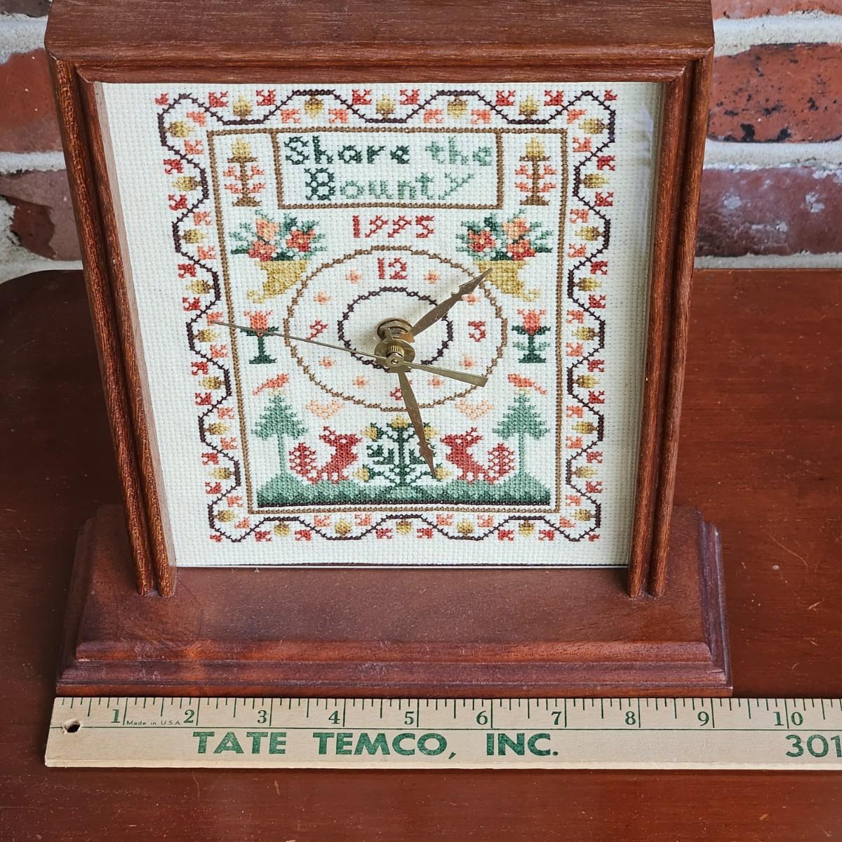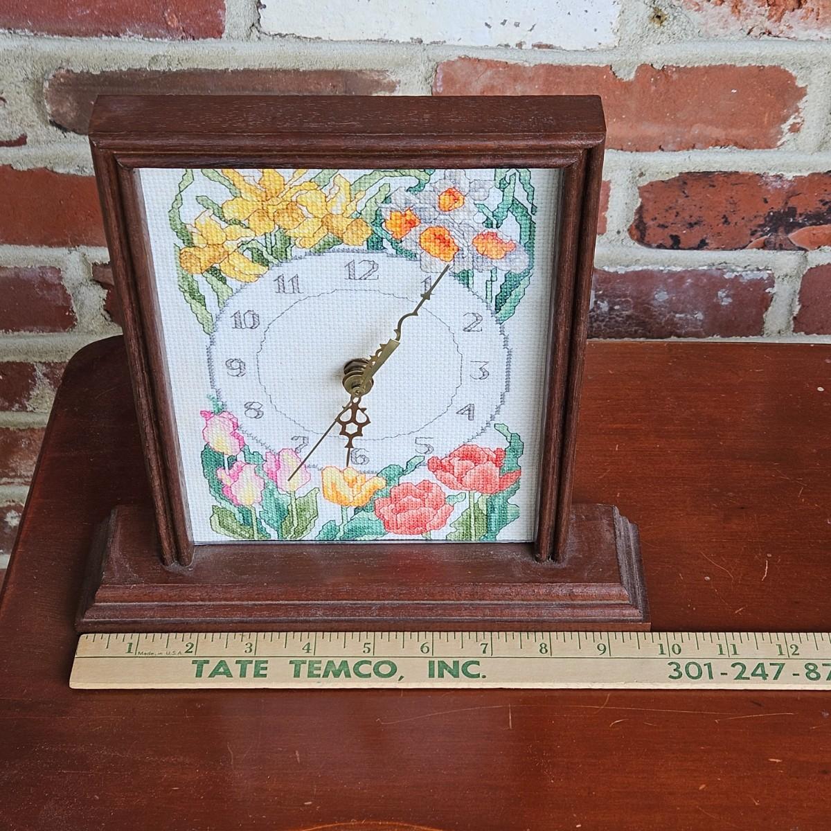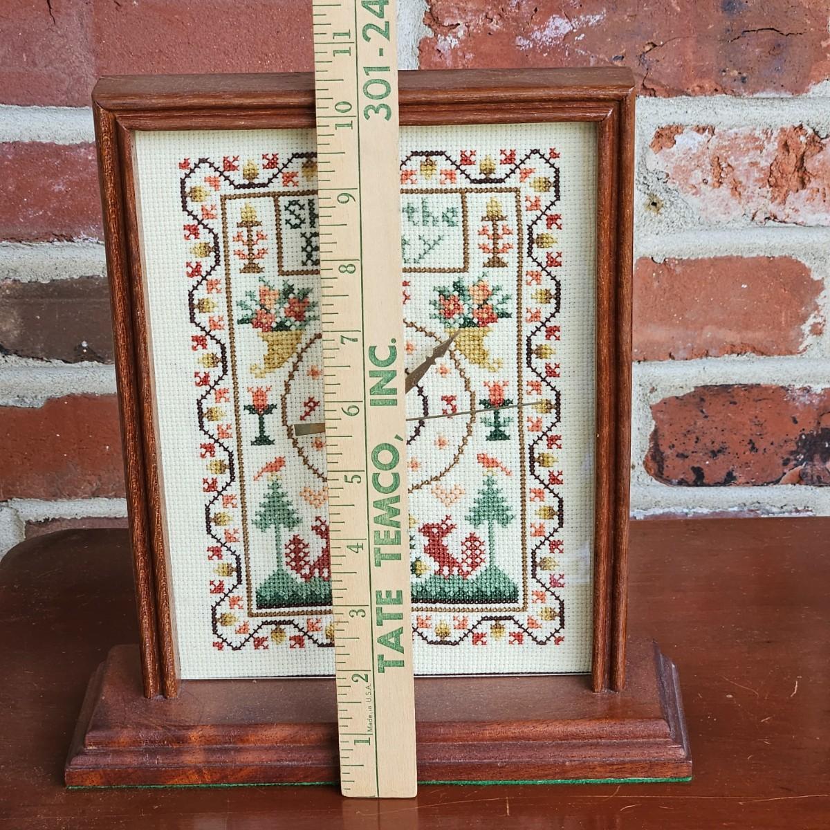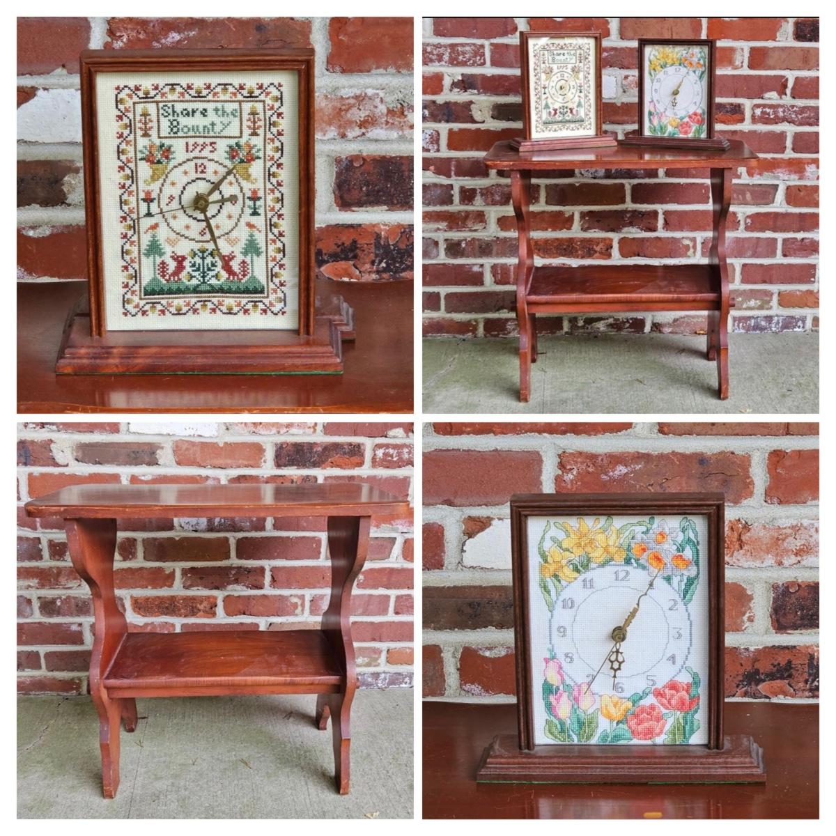 LOT 193S: Vintage Wooden Side Table & Crosstitch Clocks