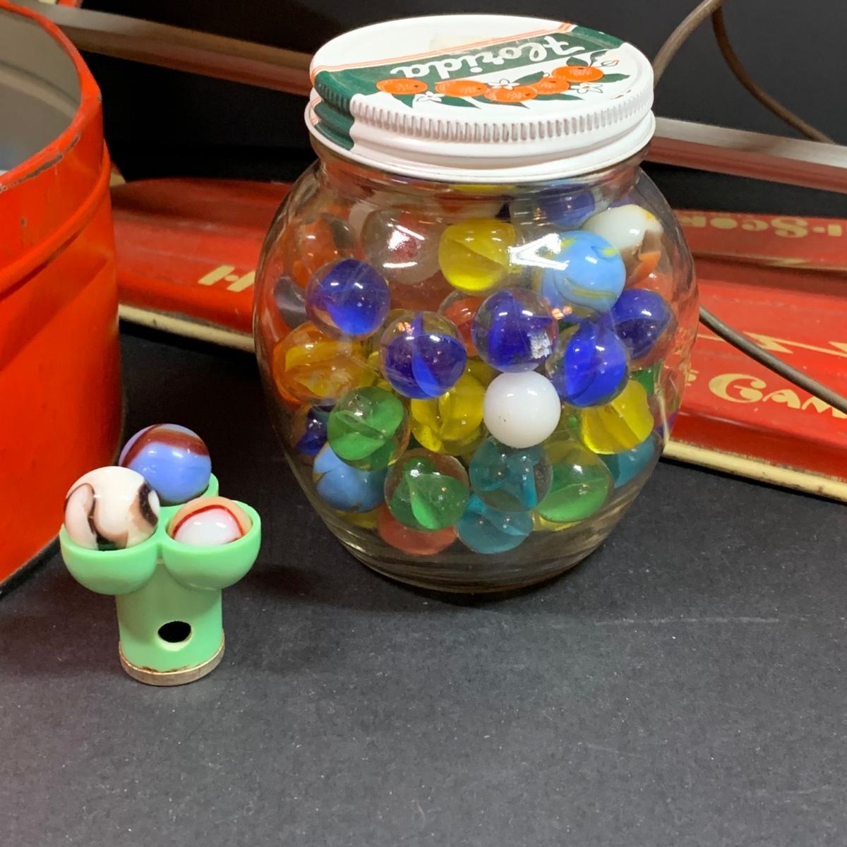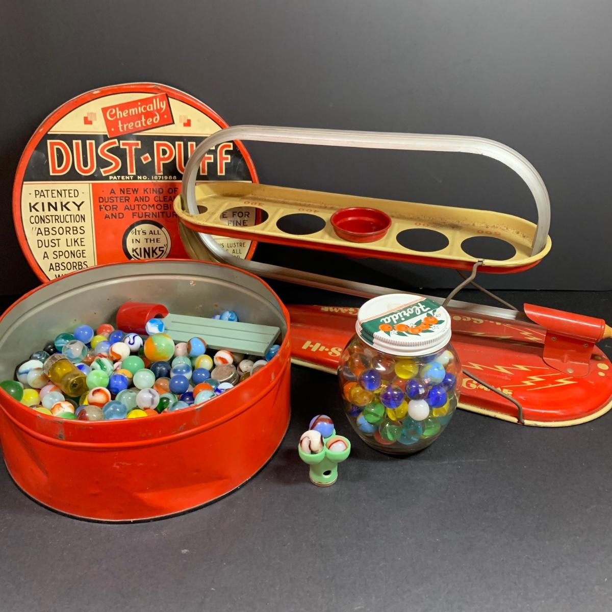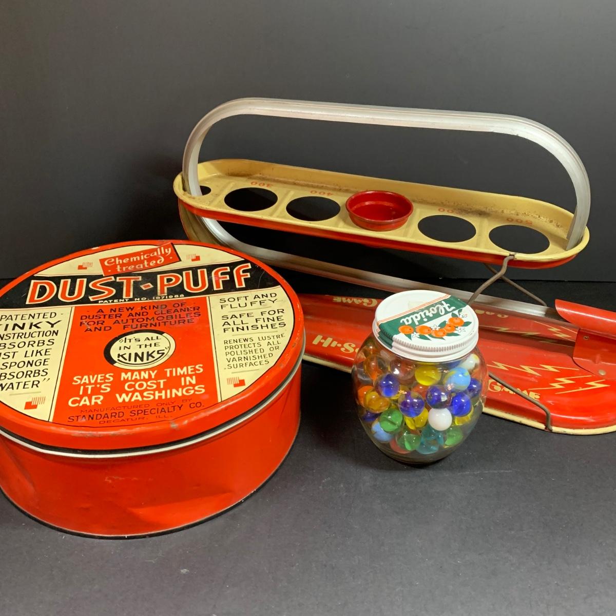 LOT 227R: Vintage High Score Marble Game & Marbles in Vintage Dust-Puff Tin