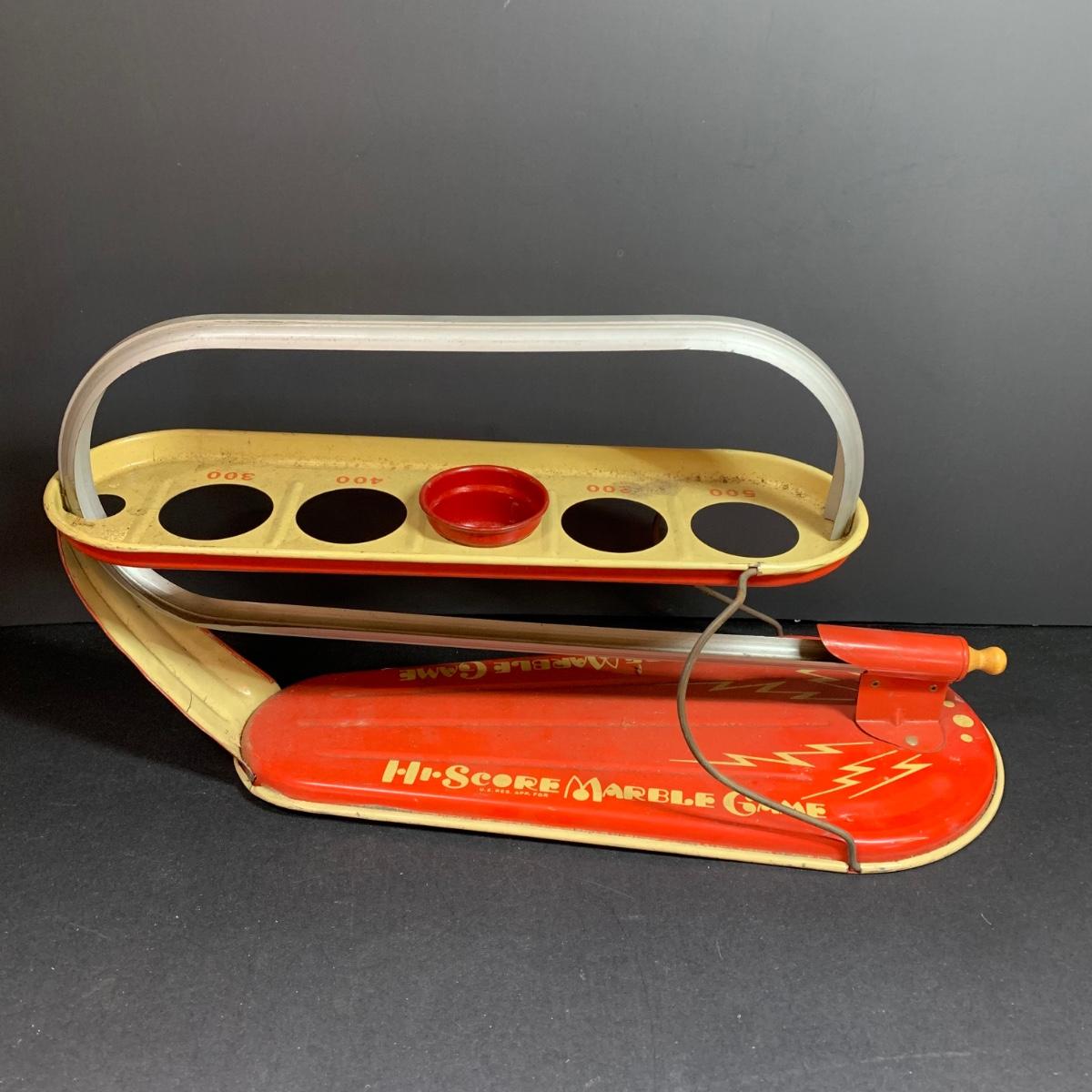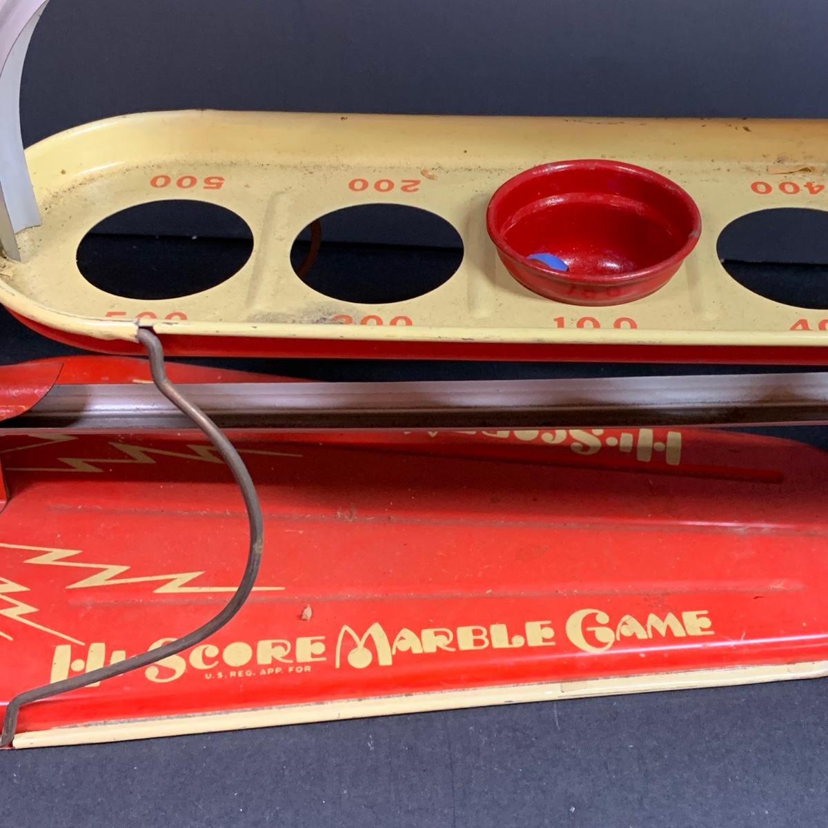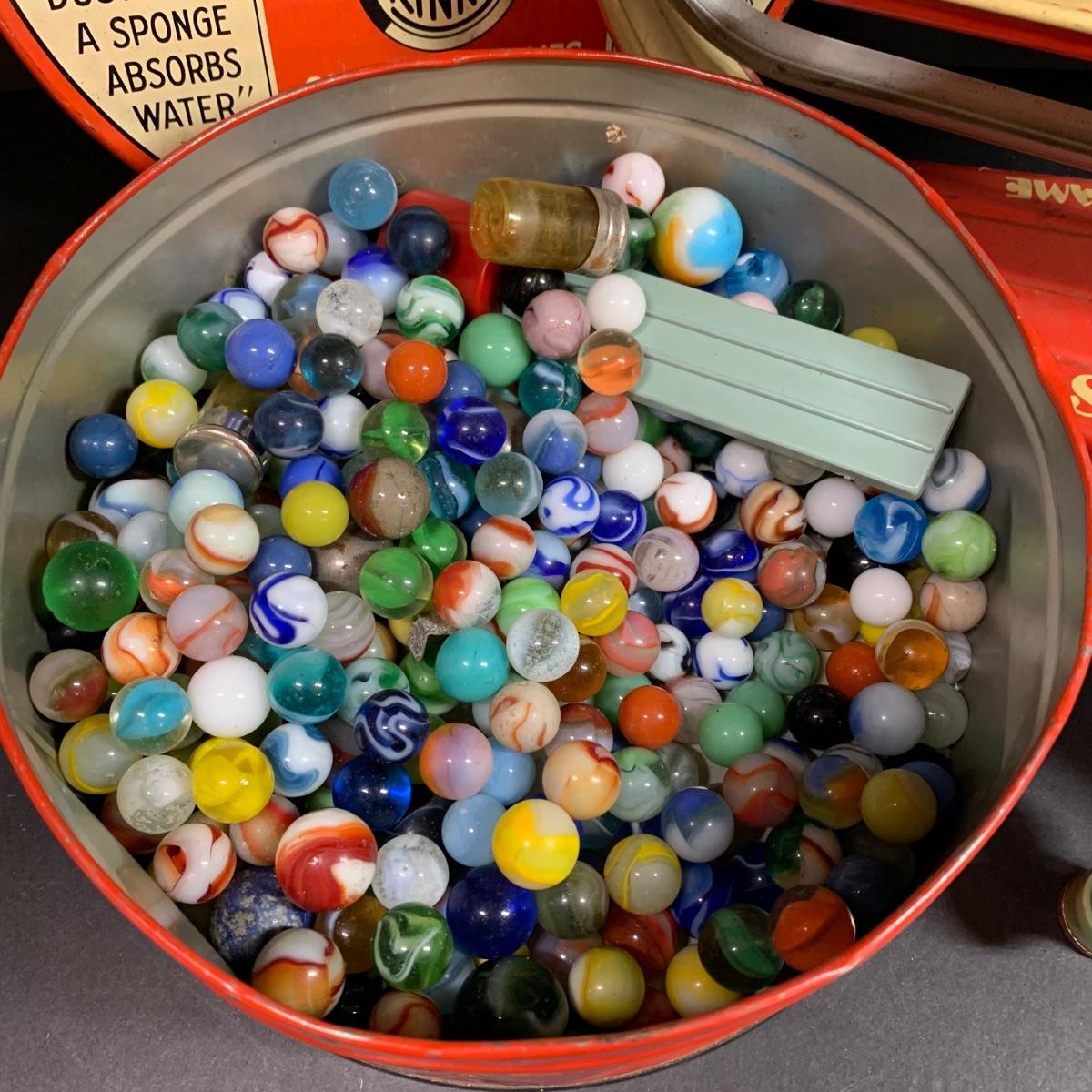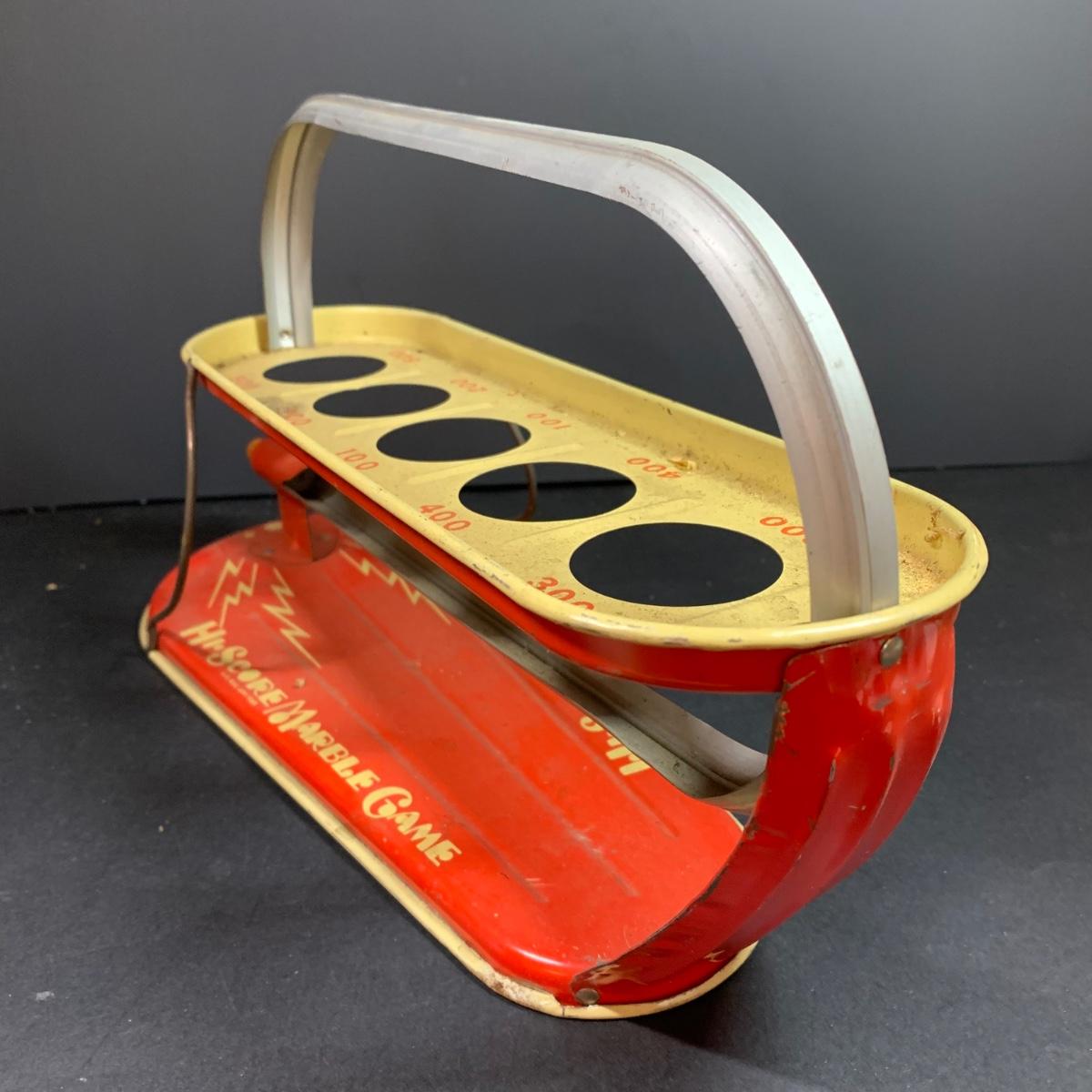 LOT 227R: Vintage High Score Marble Game & Marbles in Vintage Dust-Puff Tin