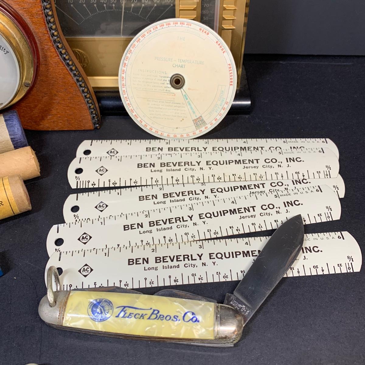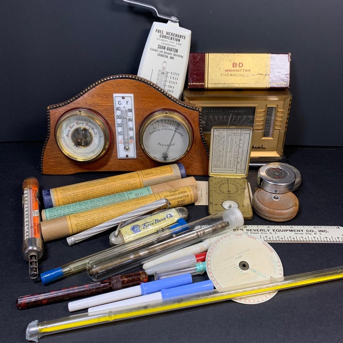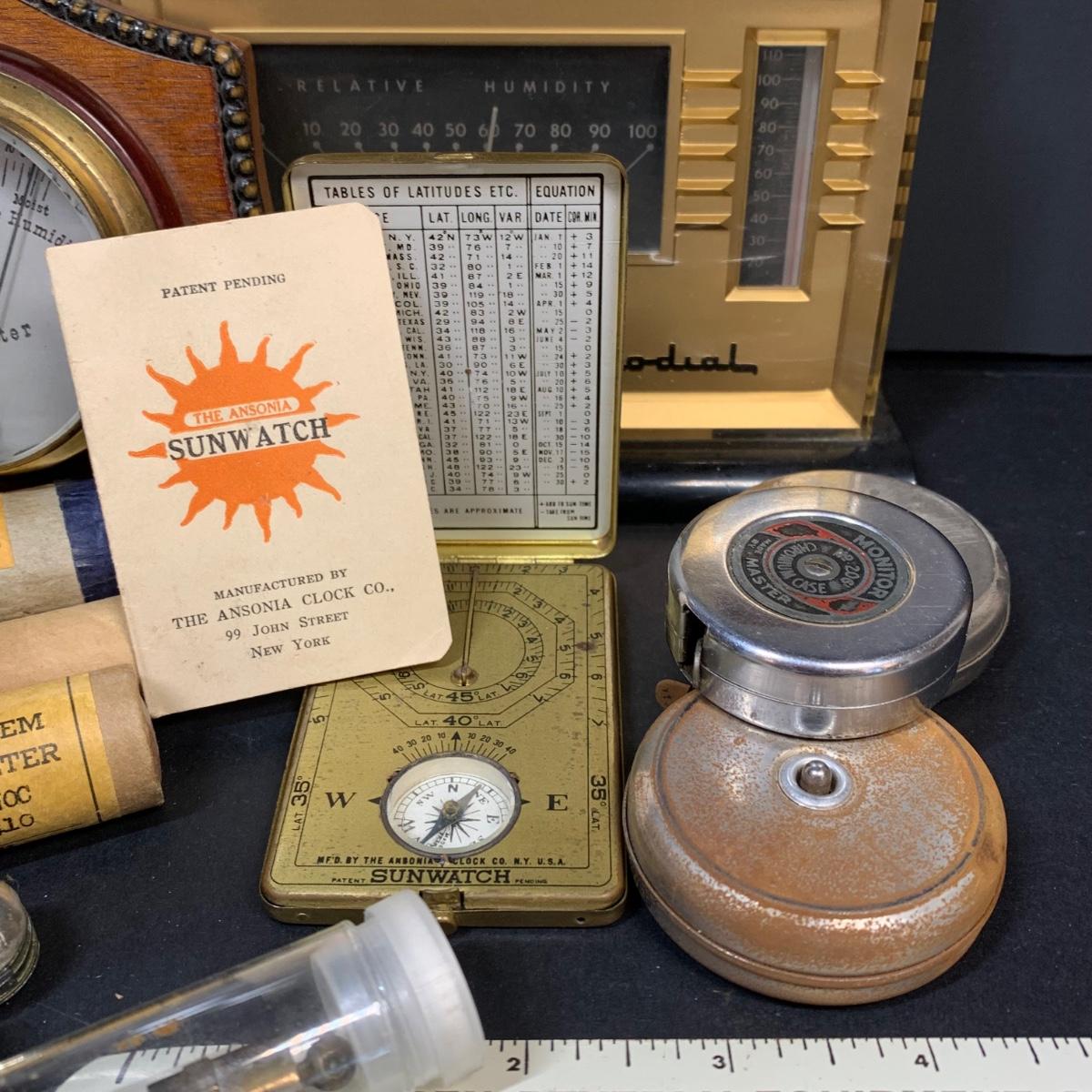 LOT 234: Vintage Thermometers, Ansonia Sun Watch, Weather Station, Pen Knife, Rulers, & More
