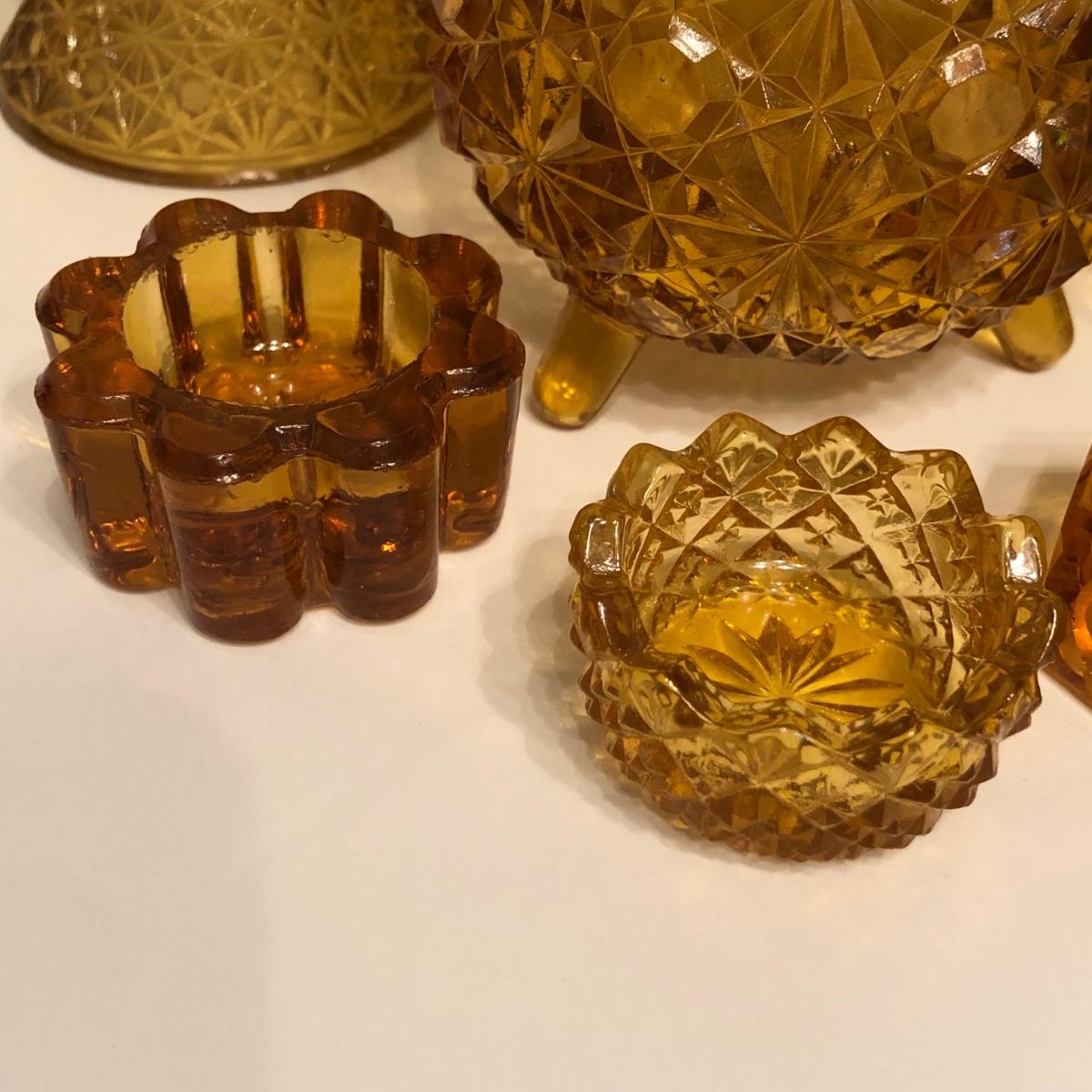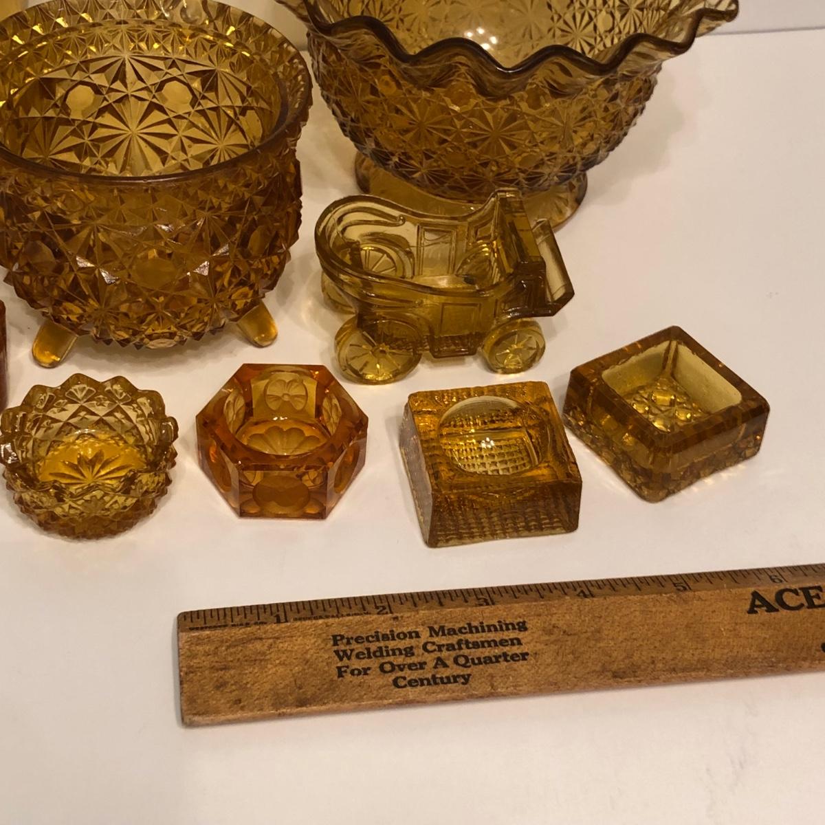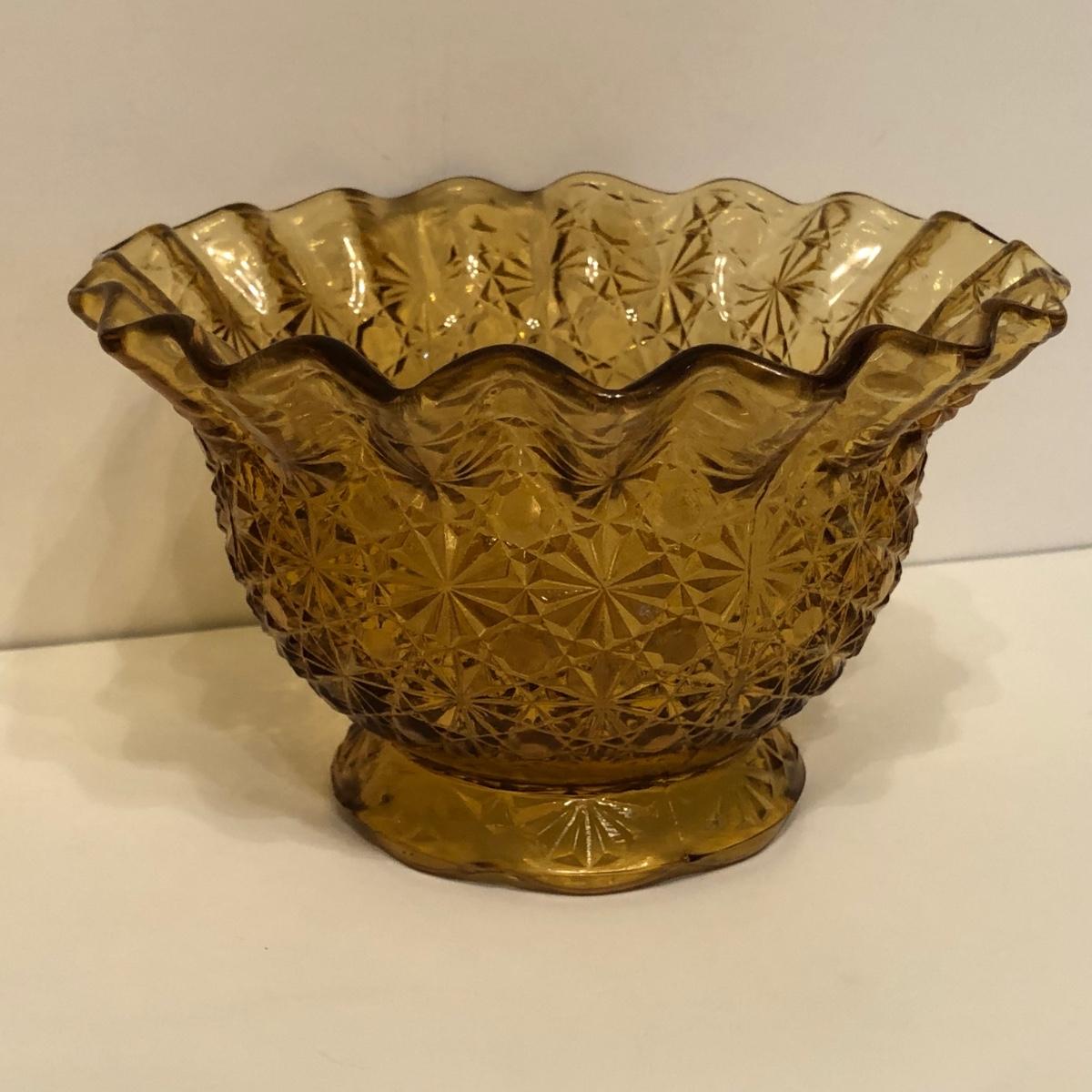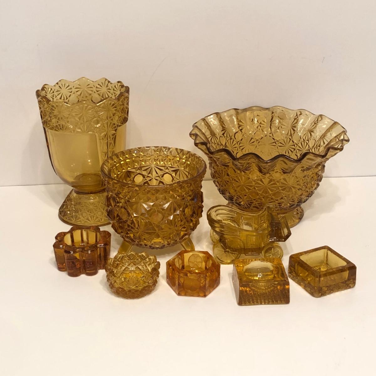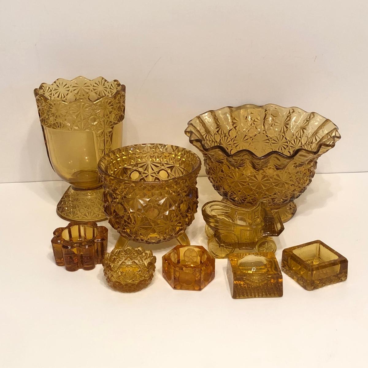 LOT 249M: Vintage Amber Cut Glass - Daisy & Button Crimp Edge Bowl, Daisy & Button Small Footed Bowl, Mid-Century Buggy & Salt Dishes