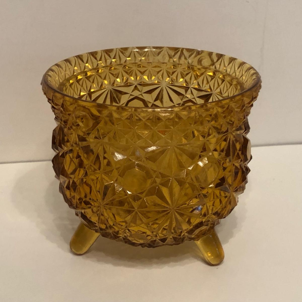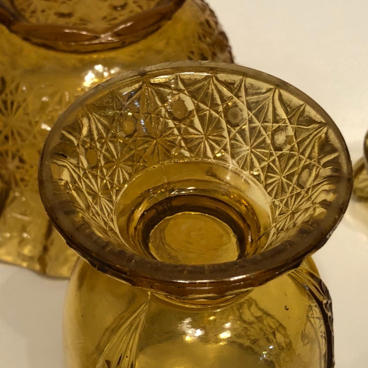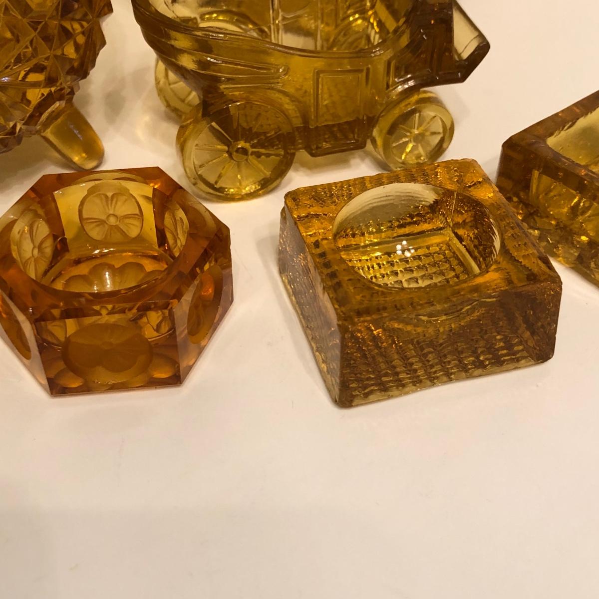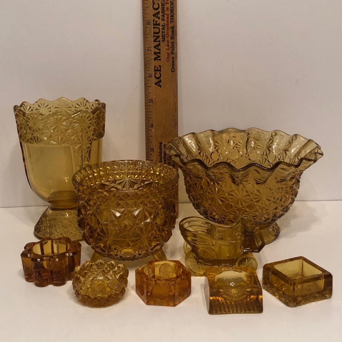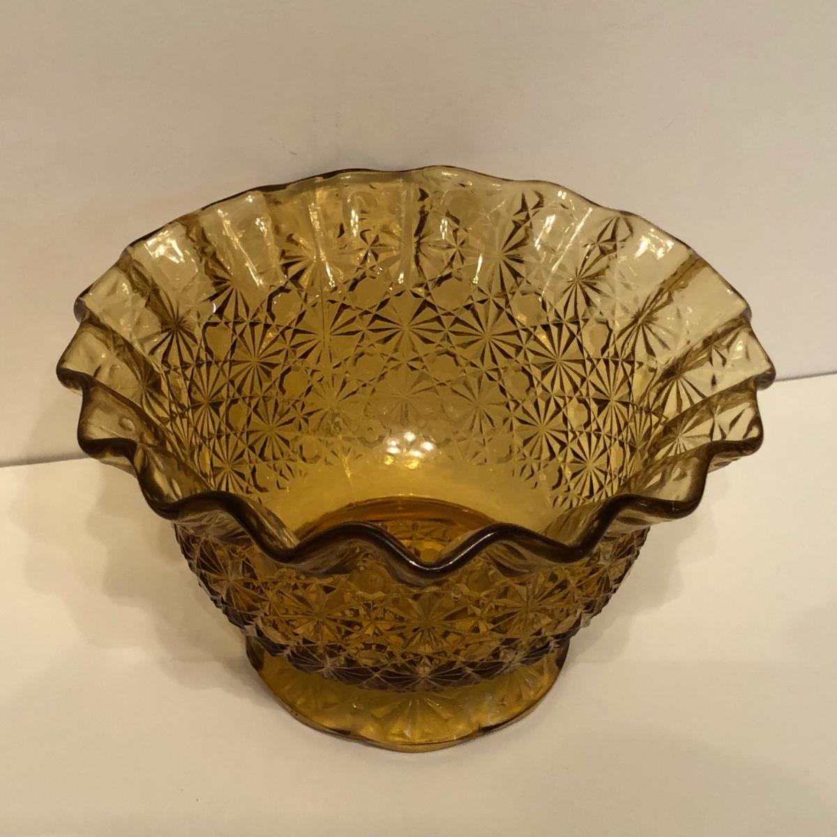 LOT 249M: Vintage Amber Cut Glass - Daisy & Button Crimp Edge Bowl, Daisy & Button Small Footed Bowl, Mid-Century Buggy & Salt Dishes