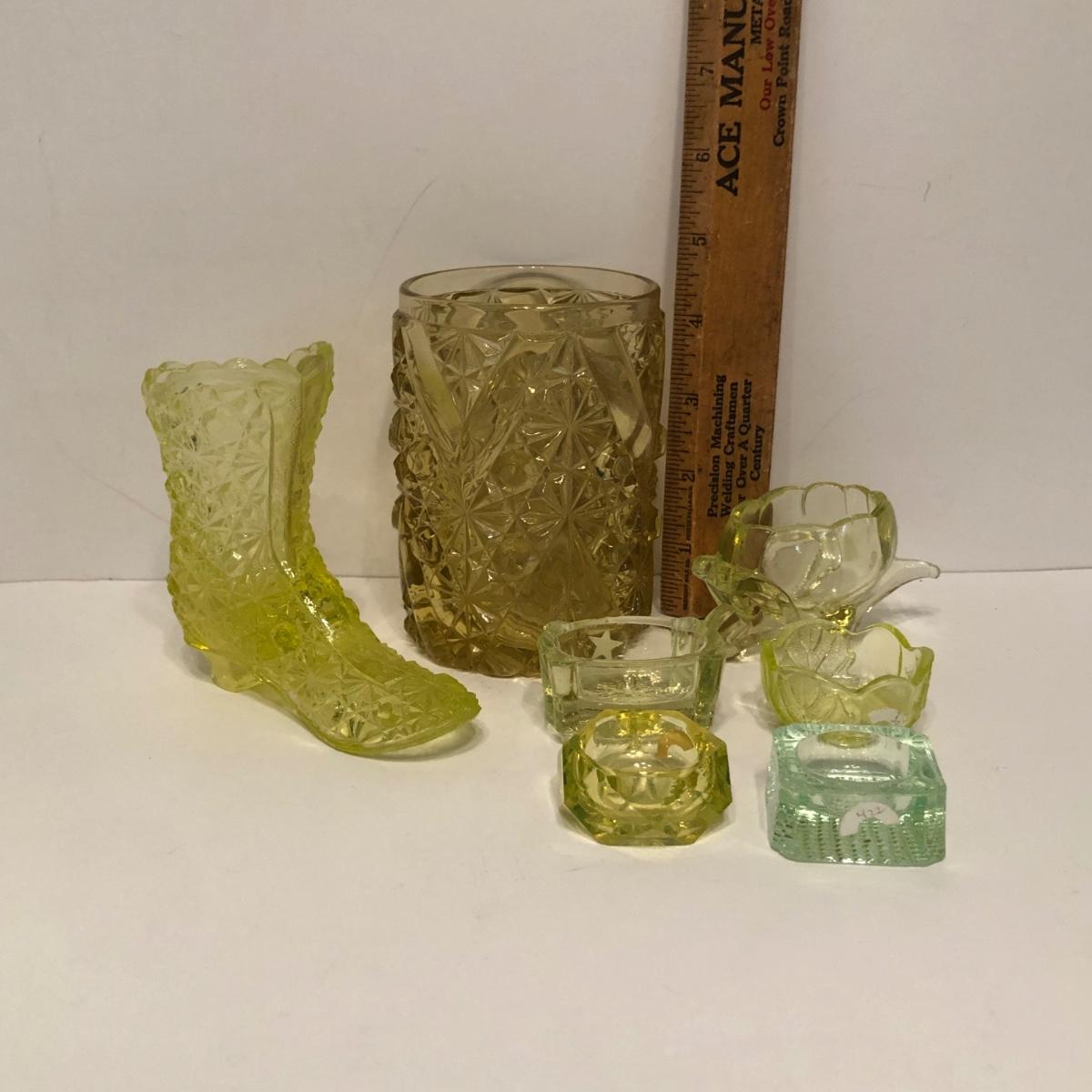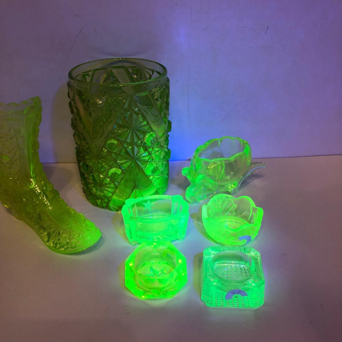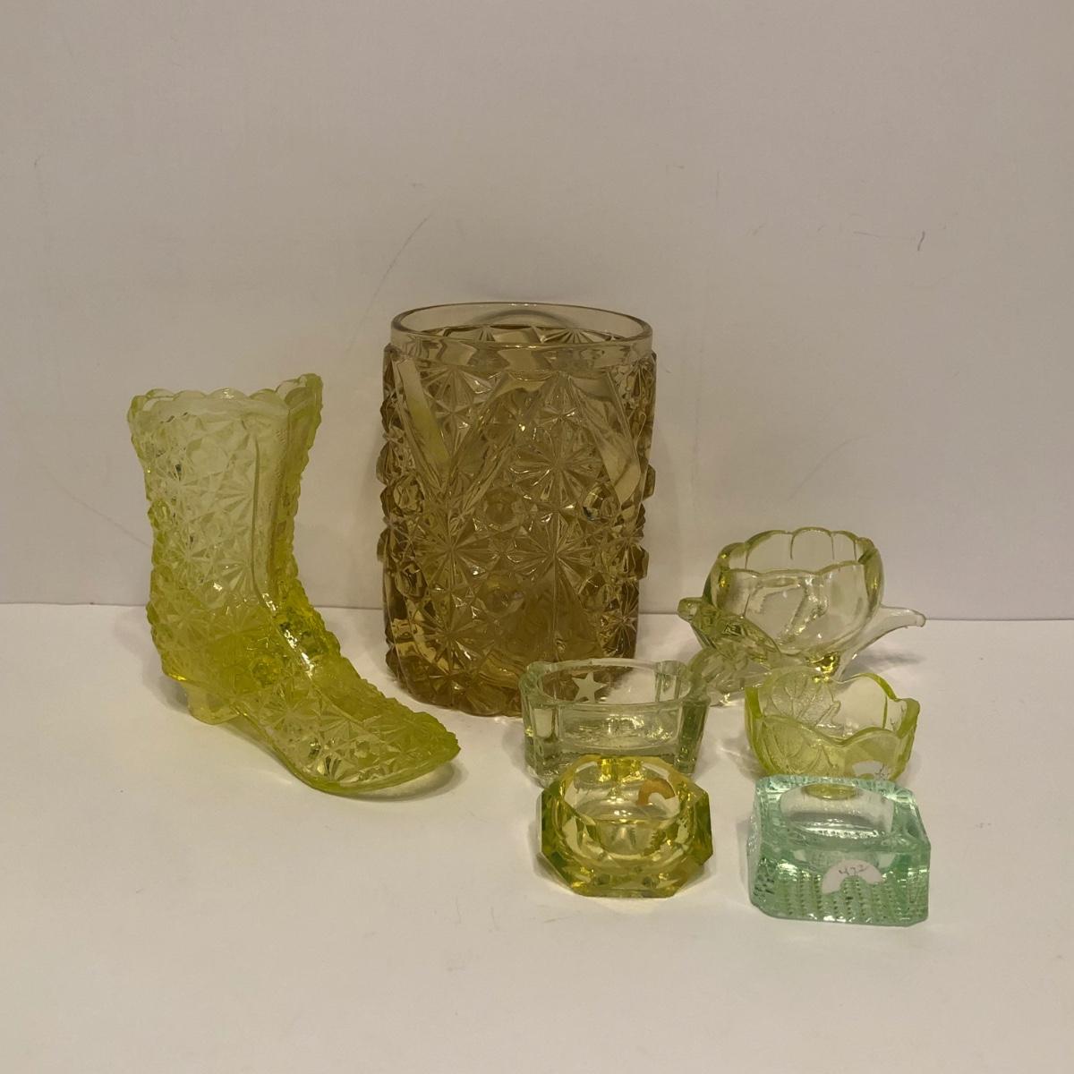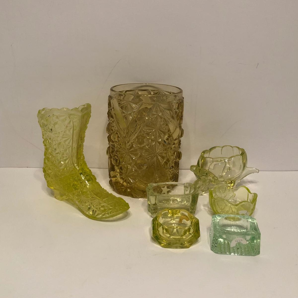 LOT 251M: Vintage Uranium Glass - Boot, Spooner, Mini Wheel Barrow & Salt Dishes