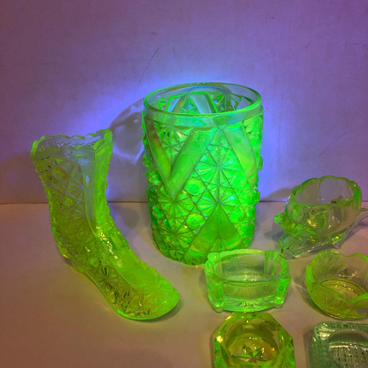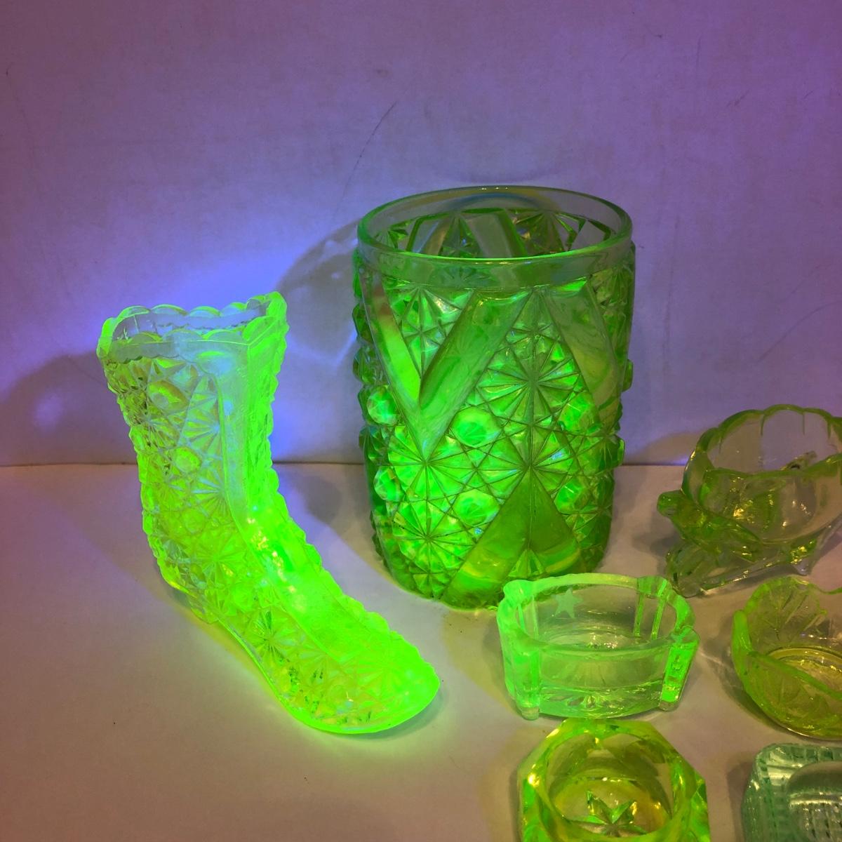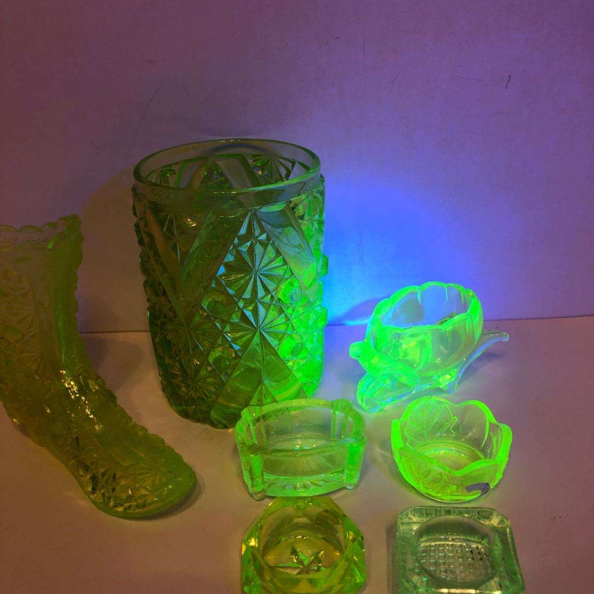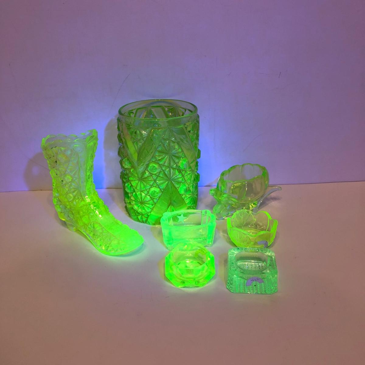 LOT 251M: Vintage Uranium Glass - Boot, Spooner, Mini Wheel Barrow & Salt Dishes