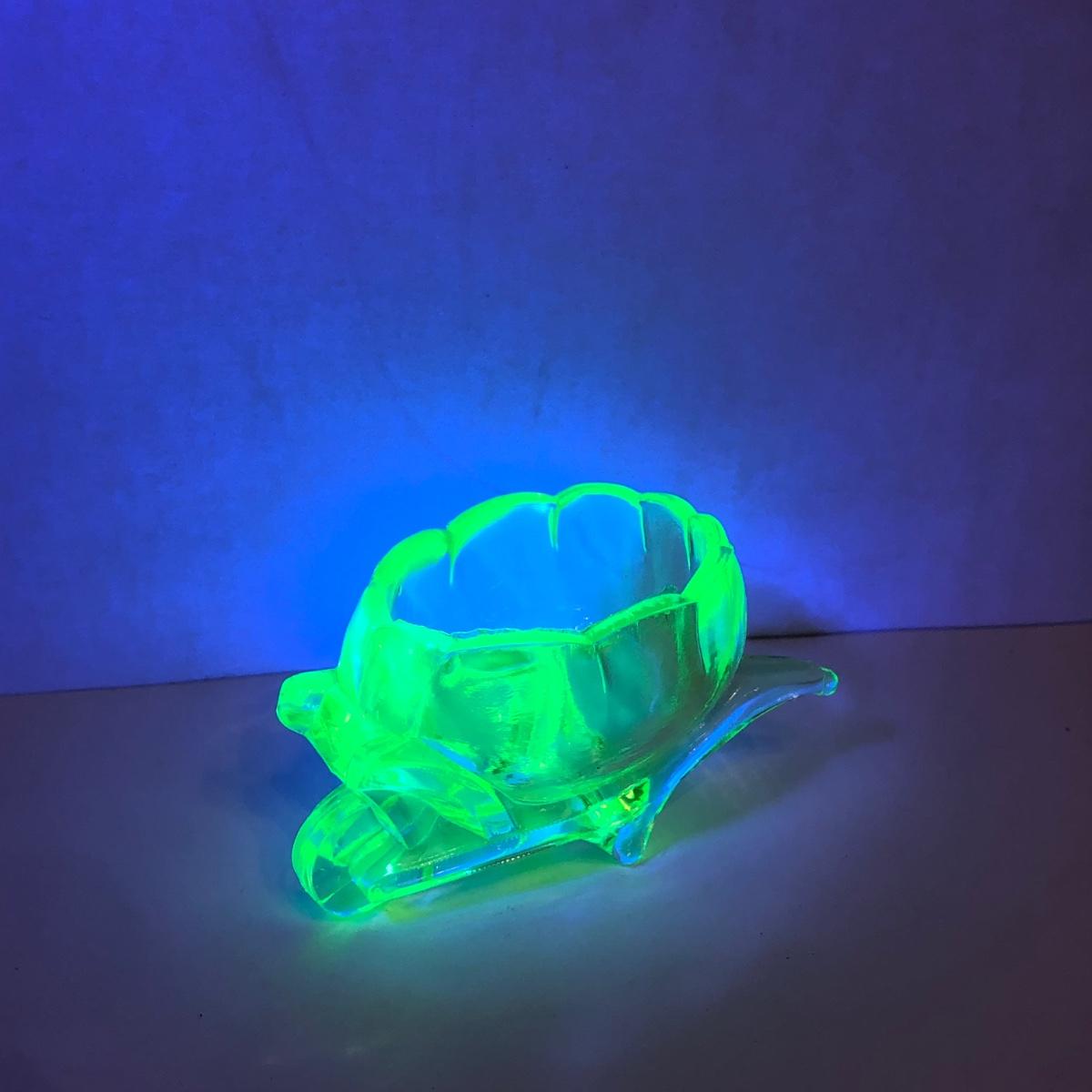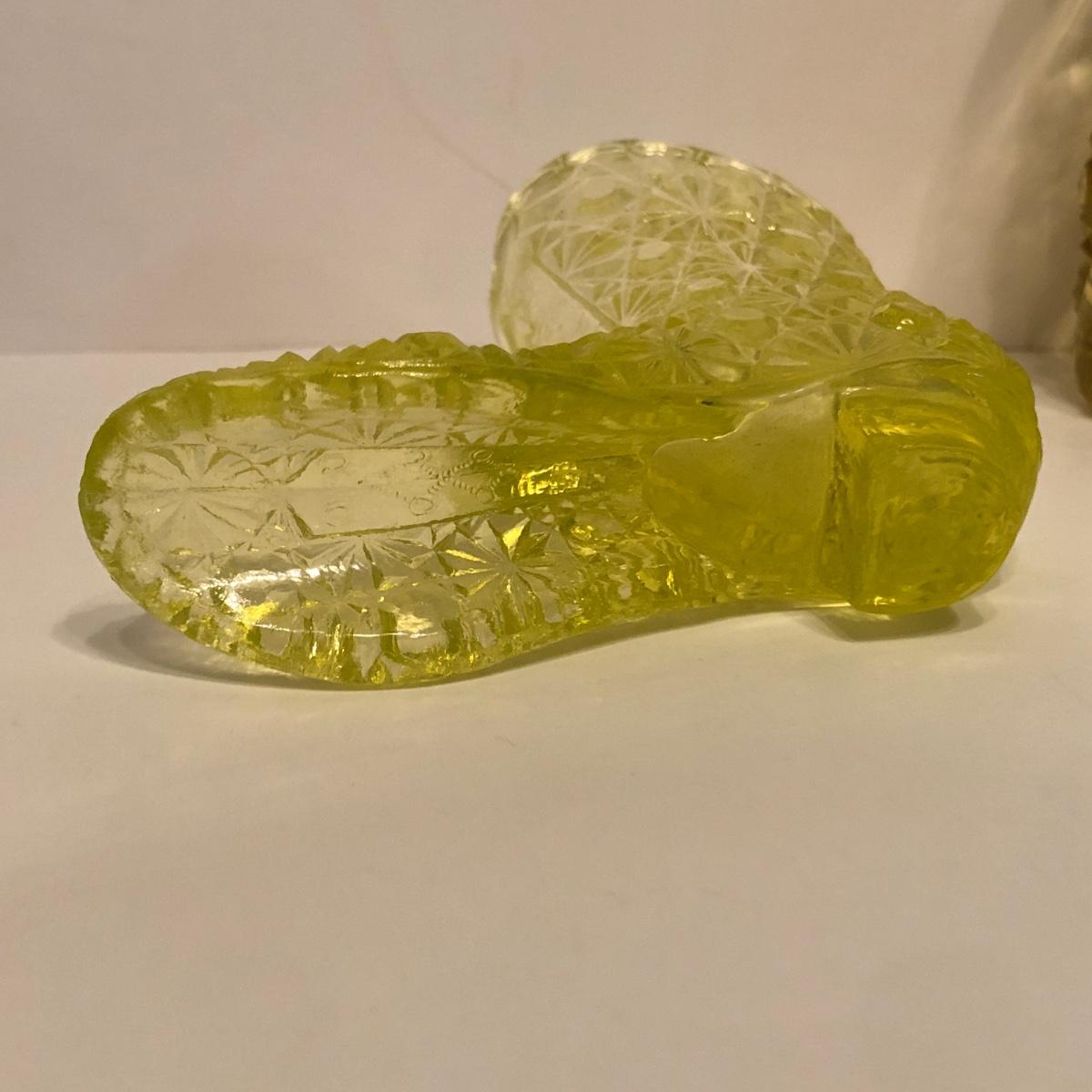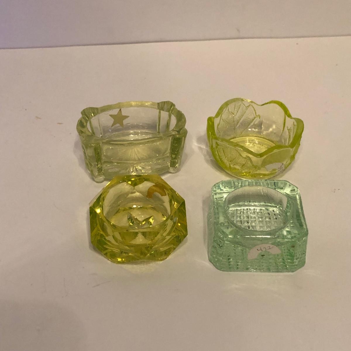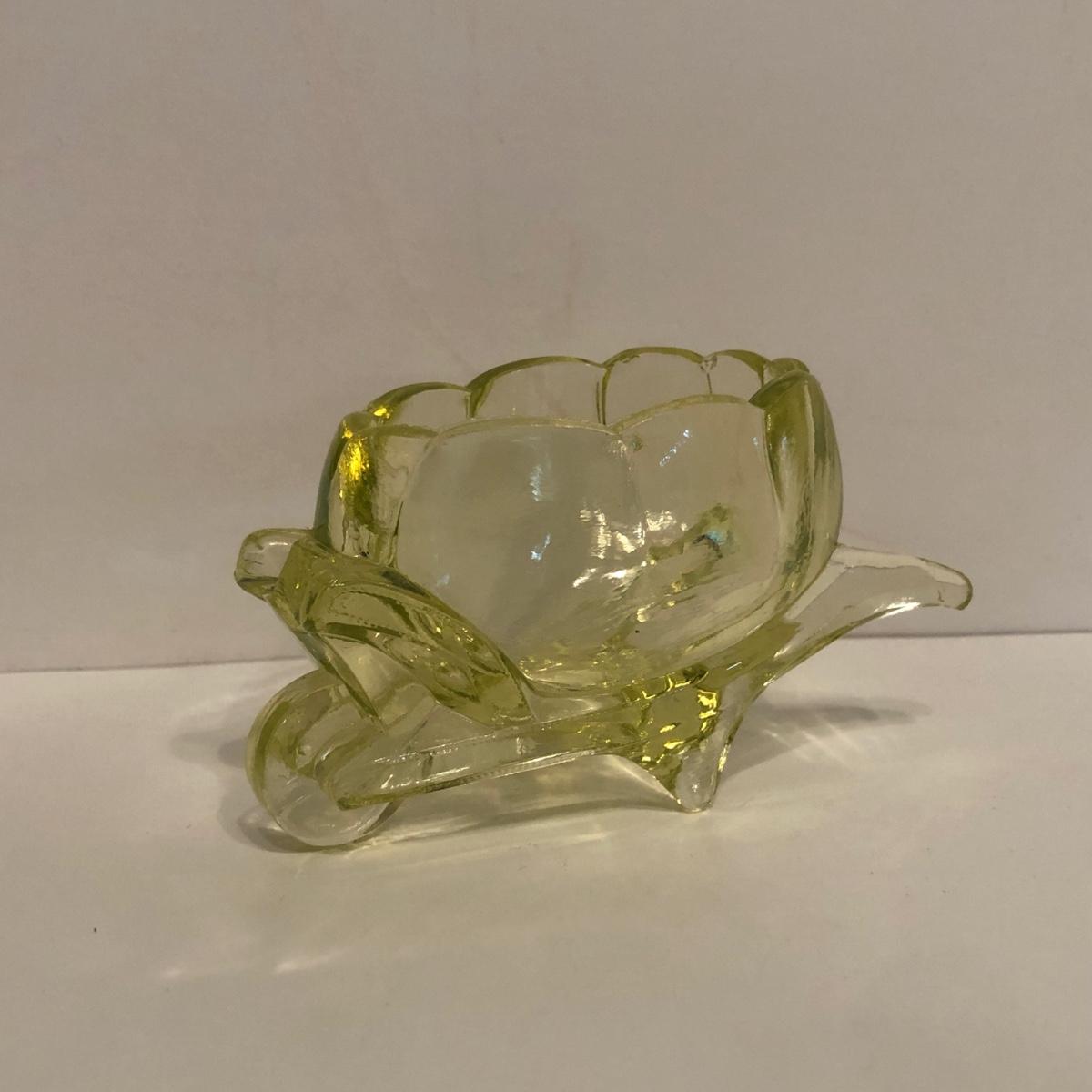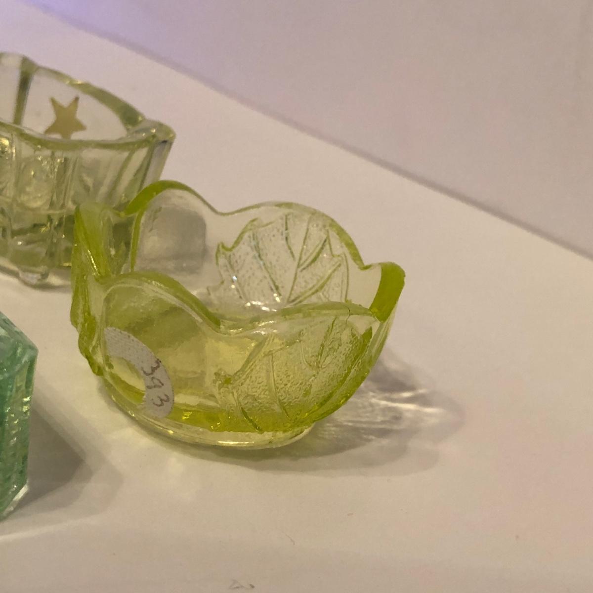 LOT 251M: Vintage Uranium Glass - Boot, Spooner, Mini Wheel Barrow & Salt Dishes