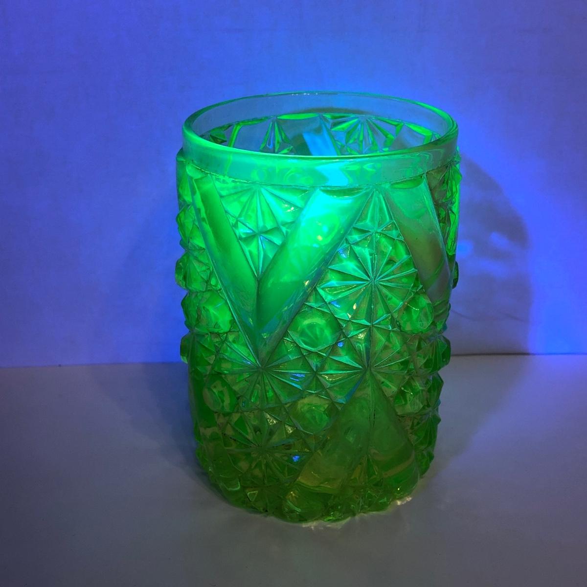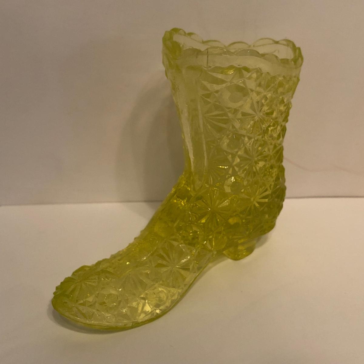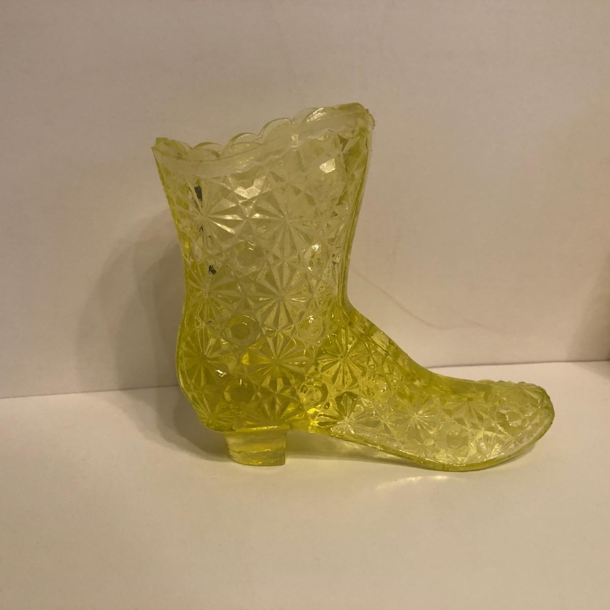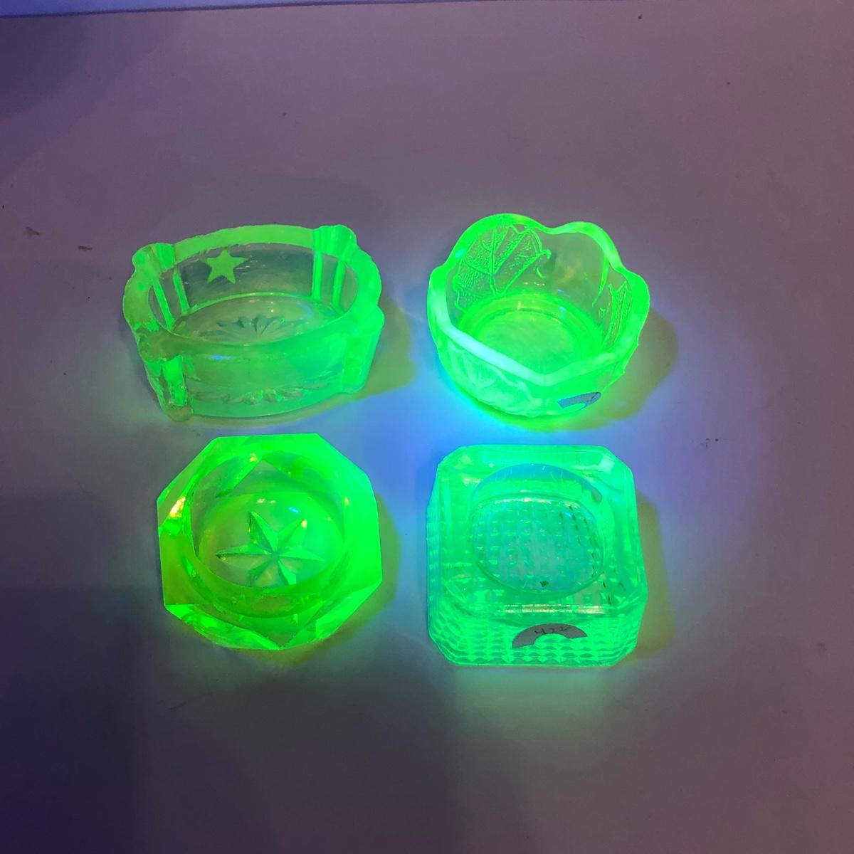 LOT 251M: Vintage Uranium Glass - Boot, Spooner, Mini Wheel Barrow & Salt Dishes