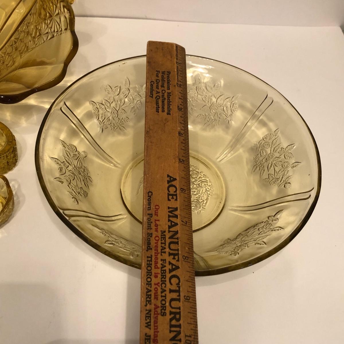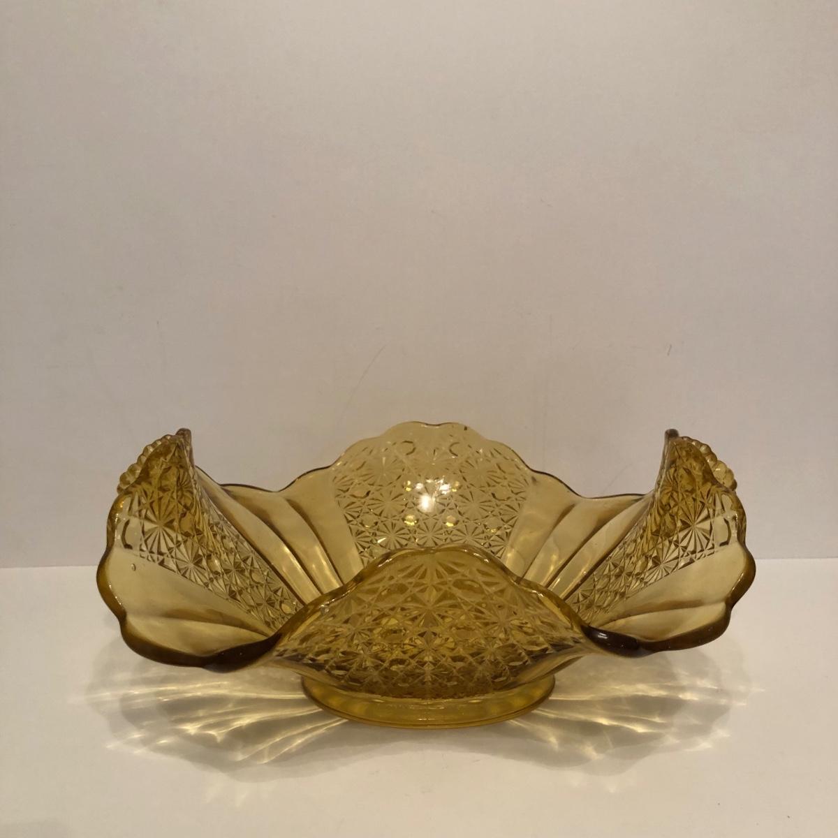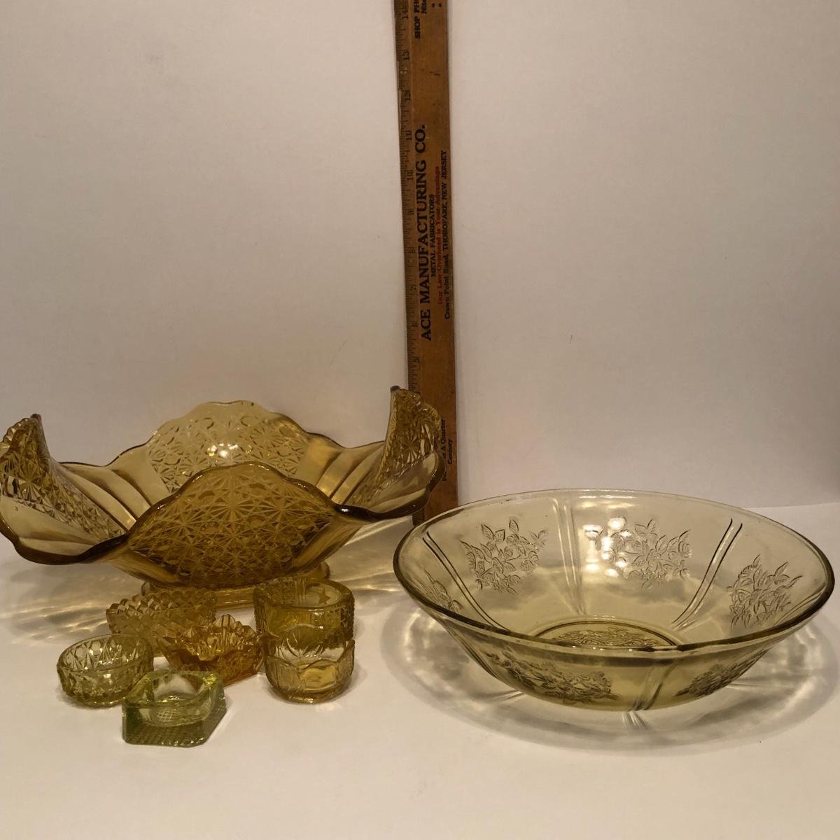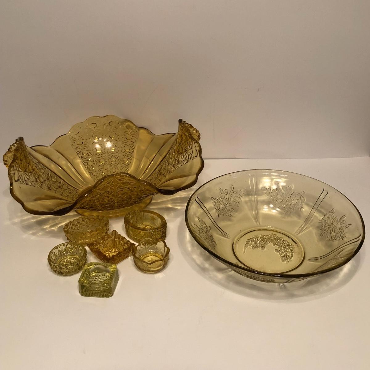 LOT 252M: Vintage Yellow & Amber Glass - Depression Sharon Cabbage Rose Bowl, Daisy & Button Winged Bowl & Salt Dishes