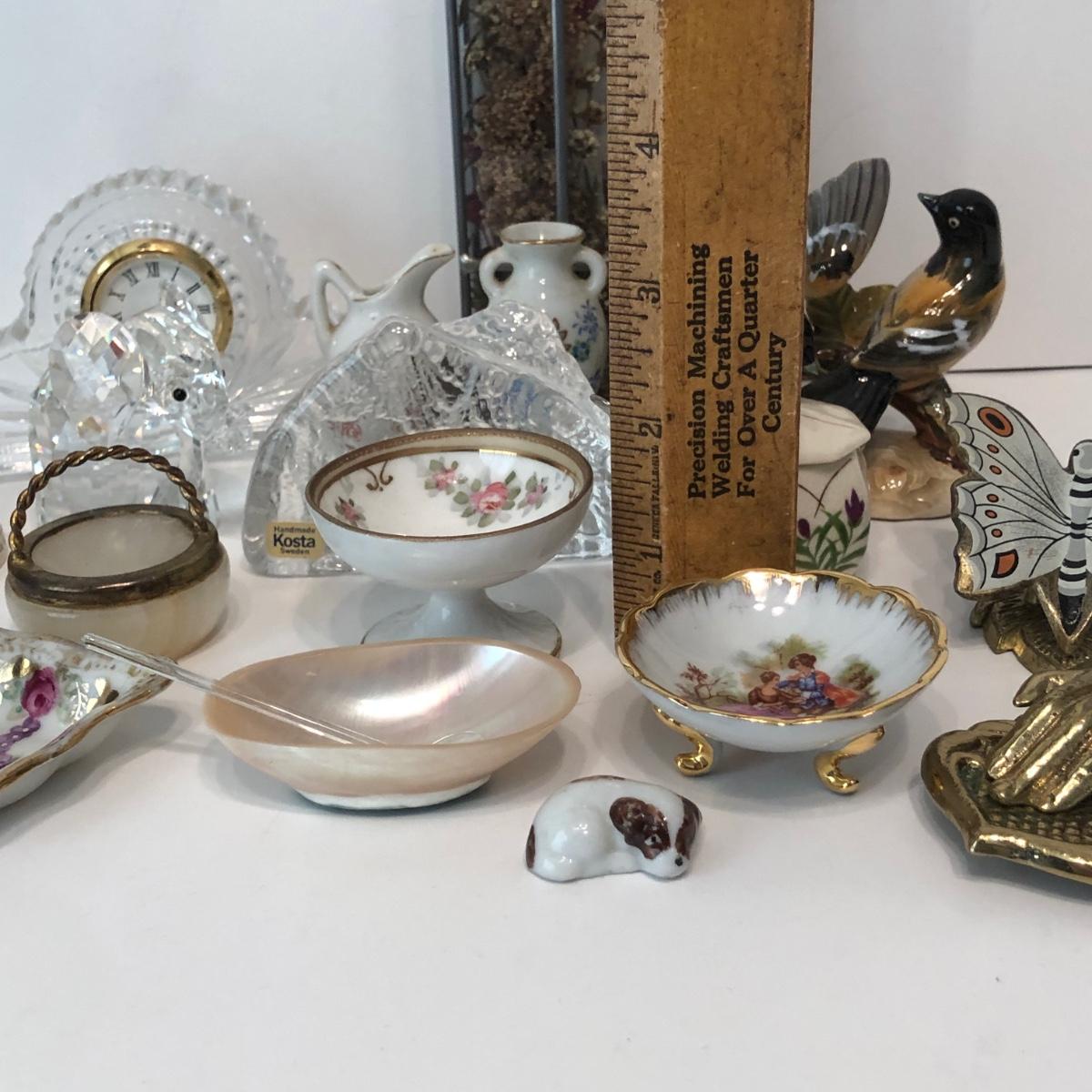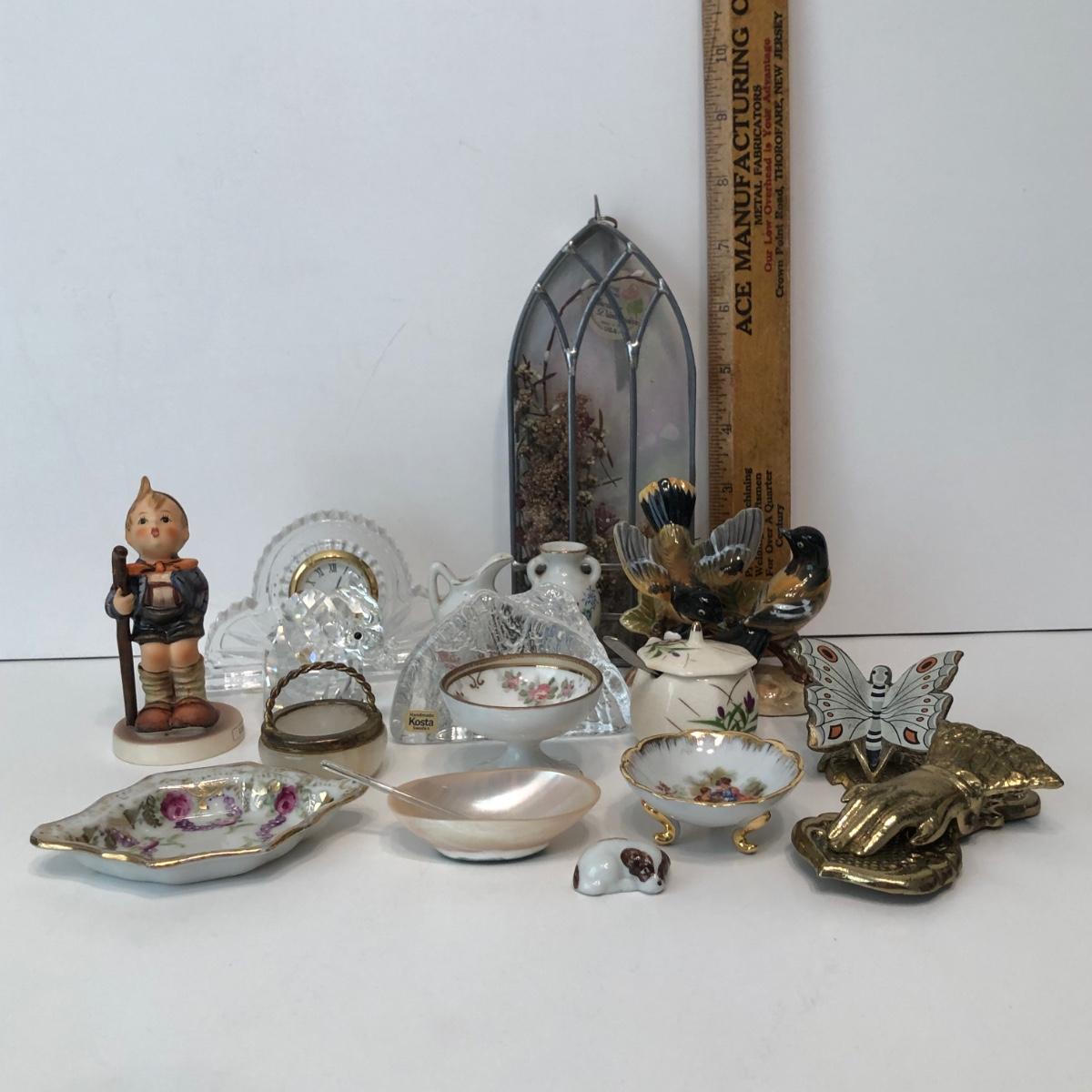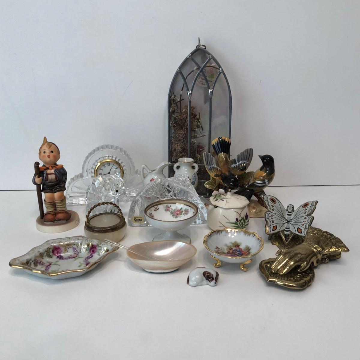 LOT 255M: Swarovski Crystal Elephant, Mother of Pearl Salt Dish, Goebel Hummel Little Hiker, Kosta Crystal, Another Dimension Mini Floral Window, Oriole Statue & More