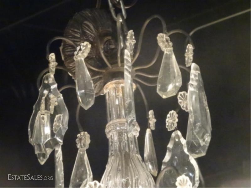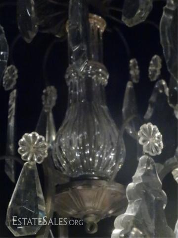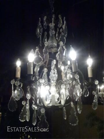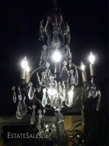 LOT 94B: 9 LIGHT CRYSTAL CHANDELIER, BLACK FINISH METAL ARMS WITH CRYSTAL BASE AND DROPS, VERY GOOD VINTAGE CONDITION WITH MINOR WEAR, 31"H X 18"W, SKU127