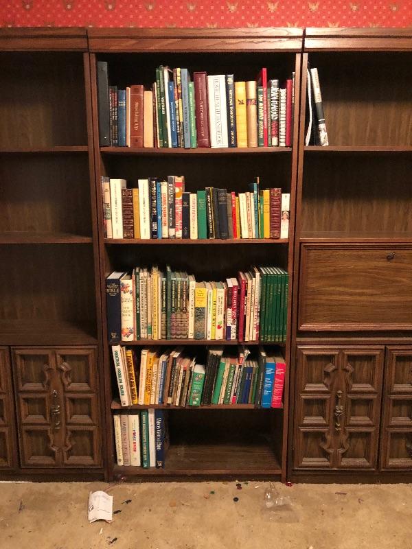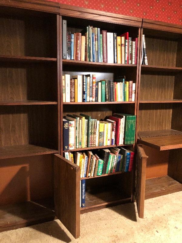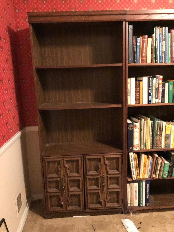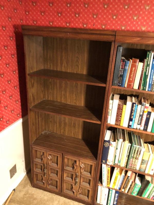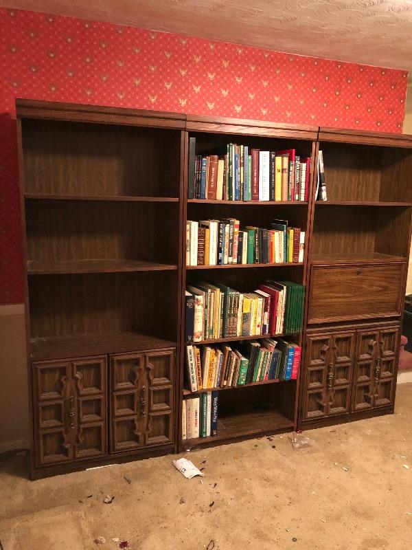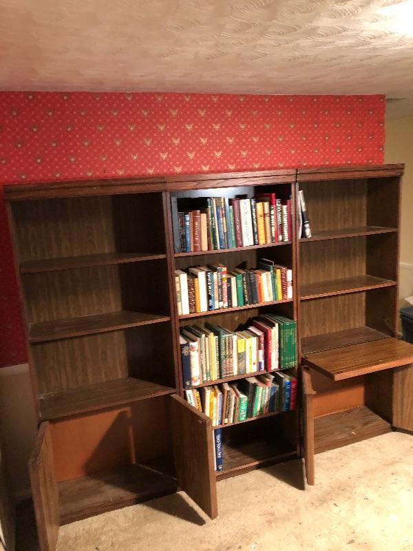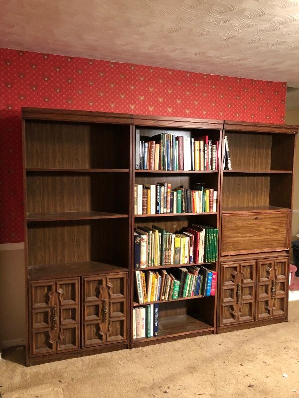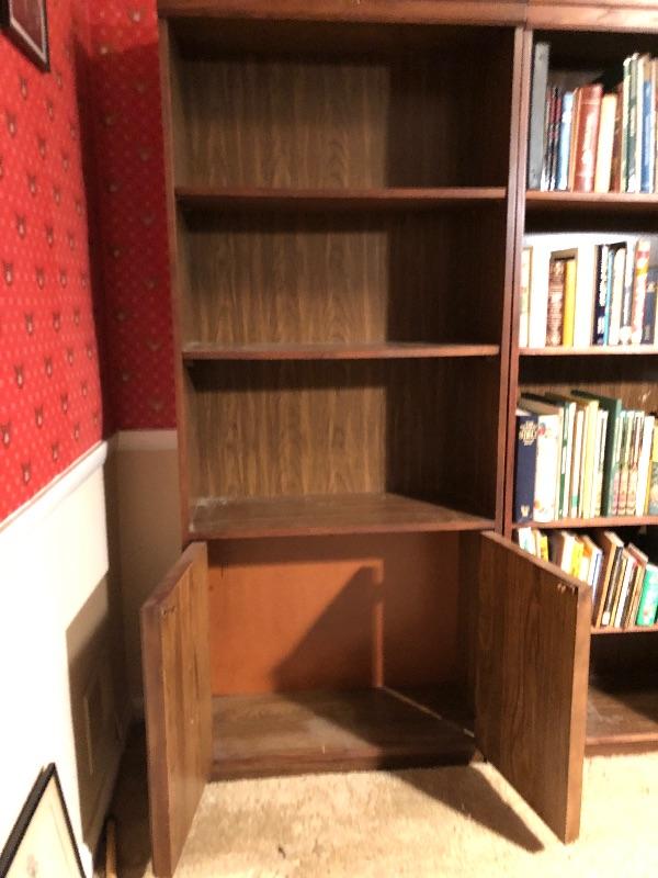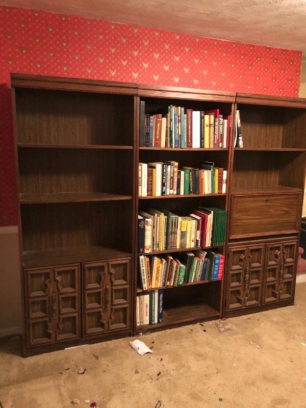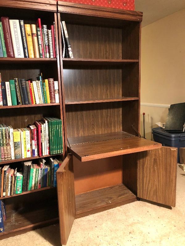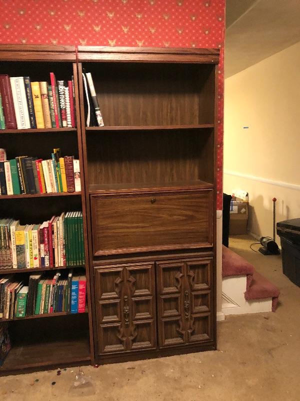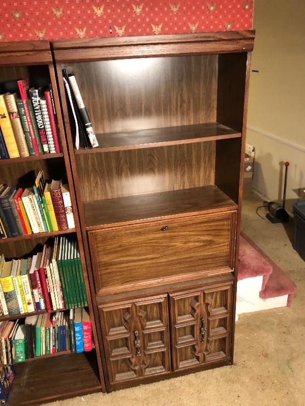 There is a cabinet on the bottom of 2 bookcases and one has a drop down secretary desk as shown in pictures