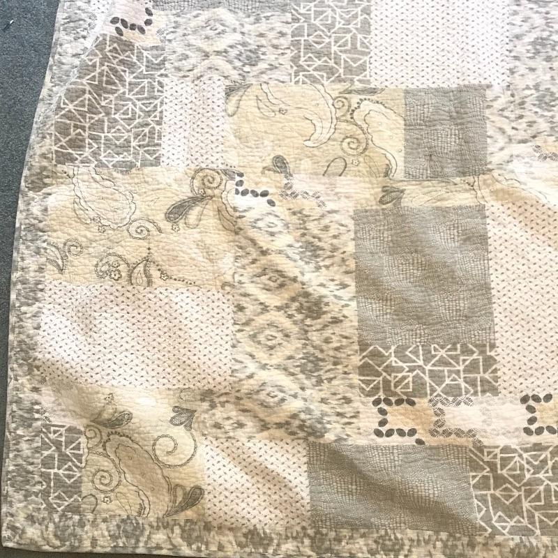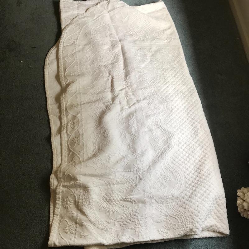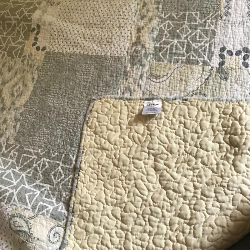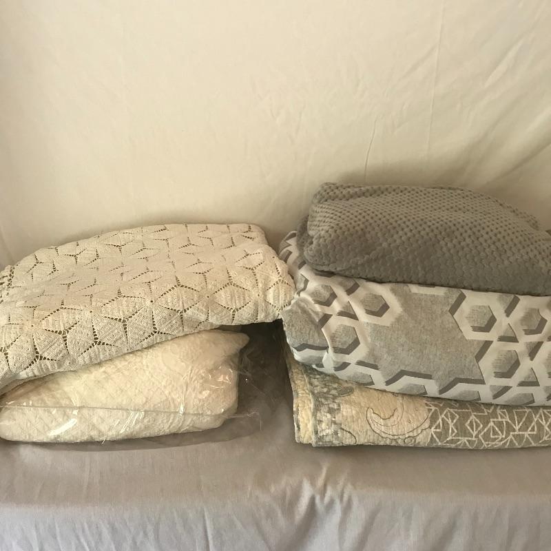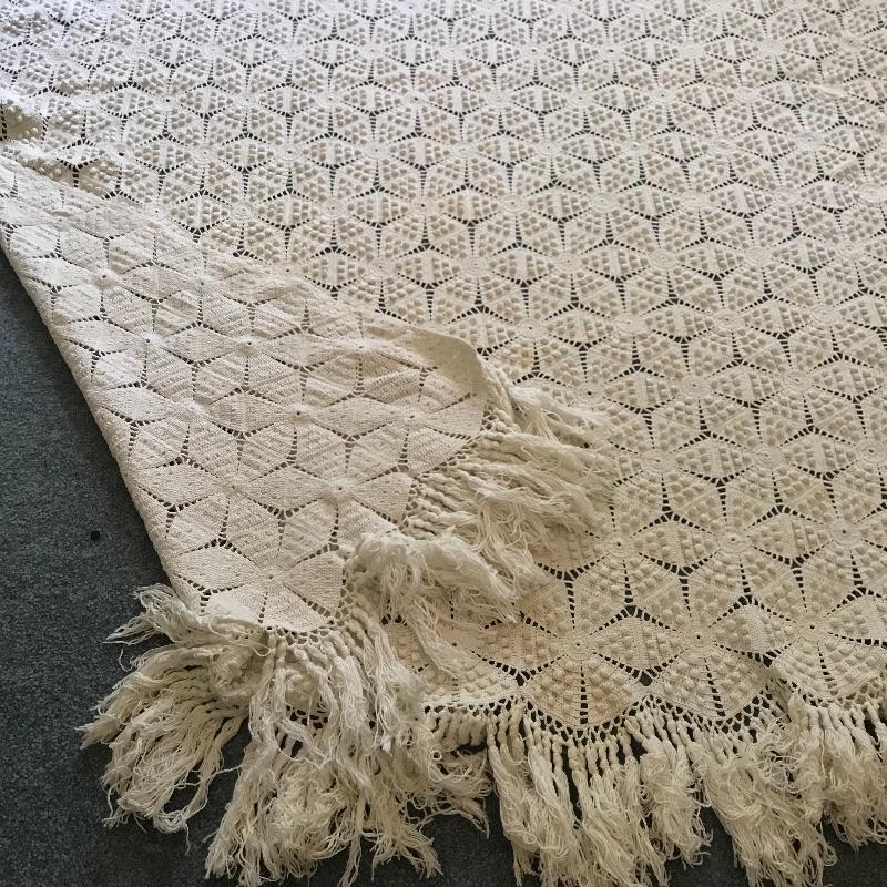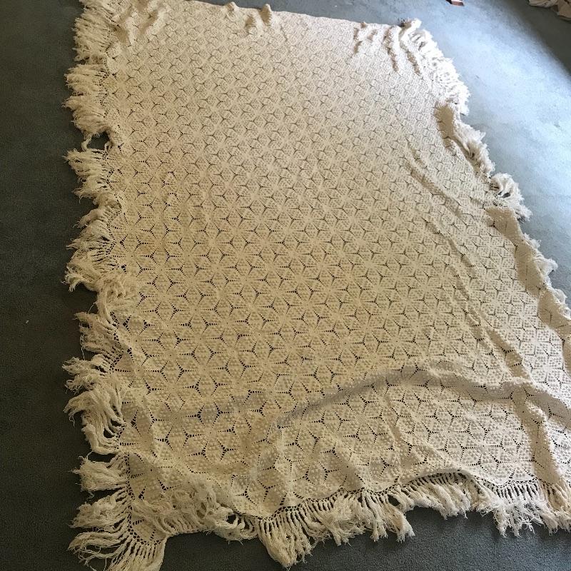 Lovely small crocheted bed cover with a note dating it back to the 1930s/40s. It is fairly heavy and in amazing condition for its age and measures pproximately 87” x 56”. Next, a king sized ivory bedspread with intricate designs and laundering tags still attached. Lot also includes a gray polyester plush 4’ x 6’ throw, a twin gray and white comforter and a queen sized lightweight gray and yellow patterned Cannon bedspread with two matching shams. Local Pickup Only.