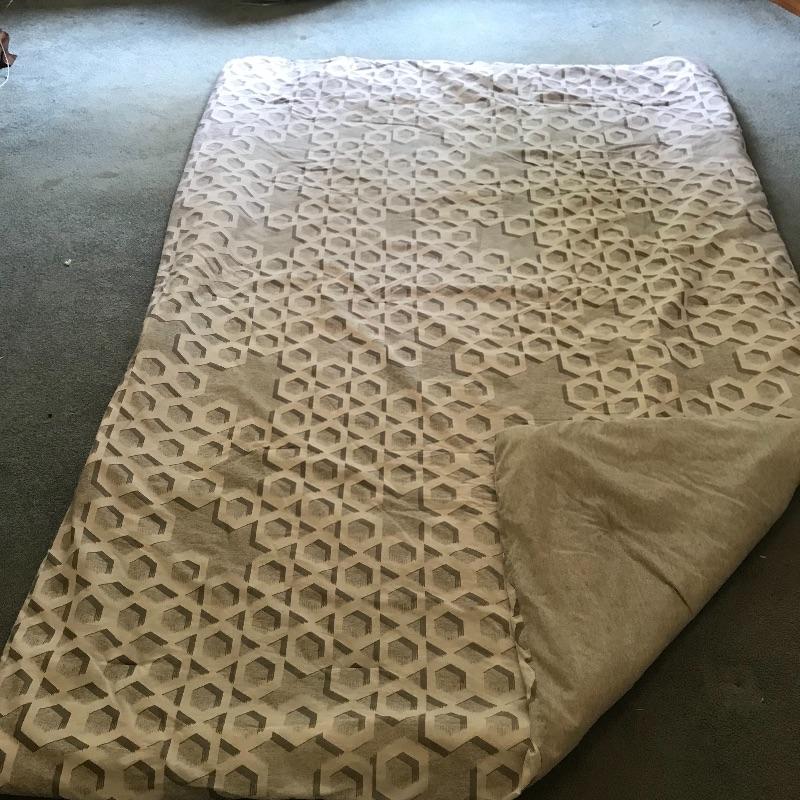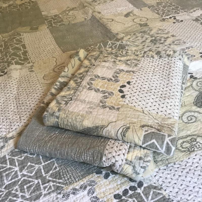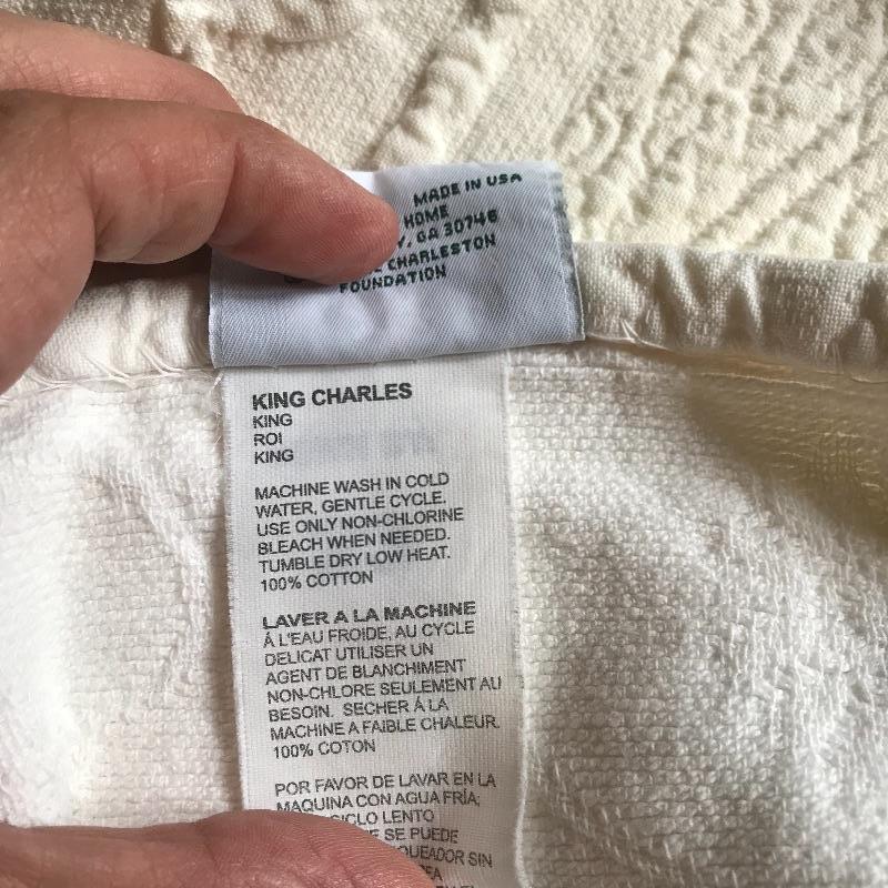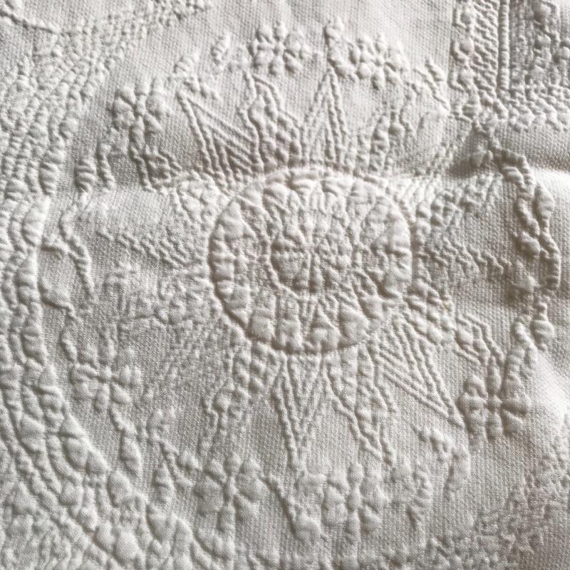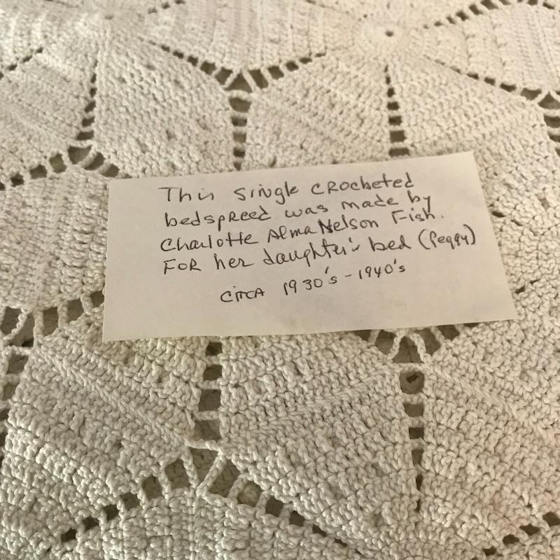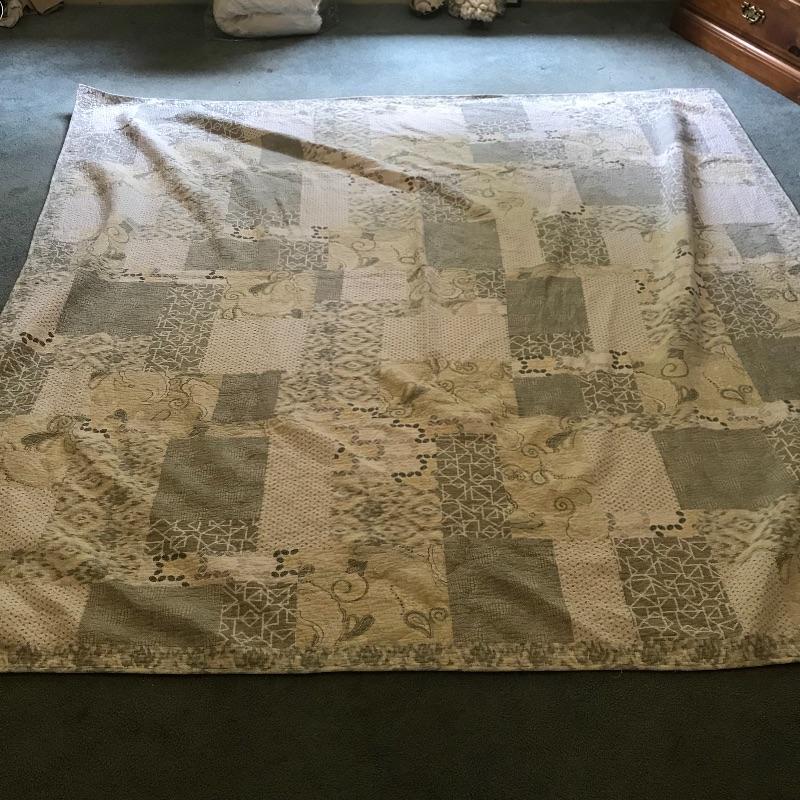 Lovely small crocheted bed cover with a note dating it back to the 1930s/40s. It is fairly heavy and in amazing condition for its age and measures pproximately 87” x 56”. Next, a king sized ivory bedspread with intricate designs and laundering tags still attached. Lot also includes a gray polyester plush 4’ x 6’ throw, a twin gray and white comforter and a queen sized lightweight gray and yellow patterned Cannon bedspread with two matching shams. Local Pickup Only.