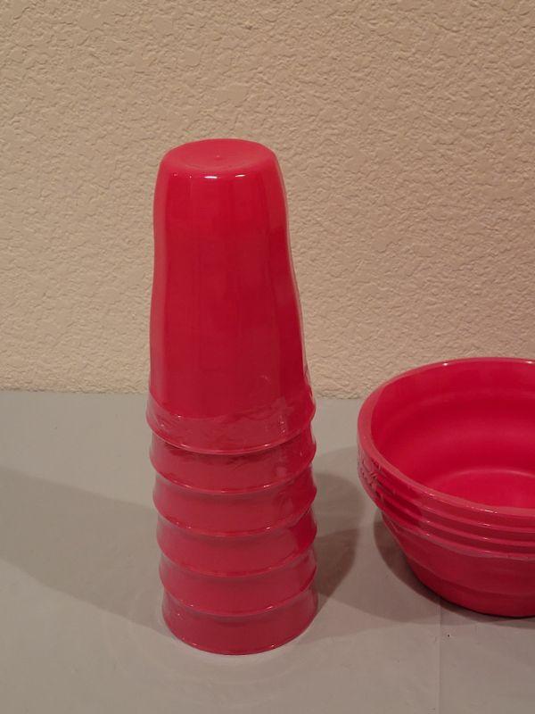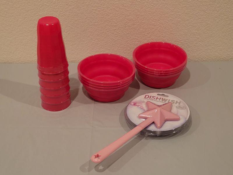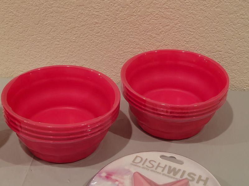 Lot 95: New Pink Plastic Bowls and Cups & a DishWish Scrubber