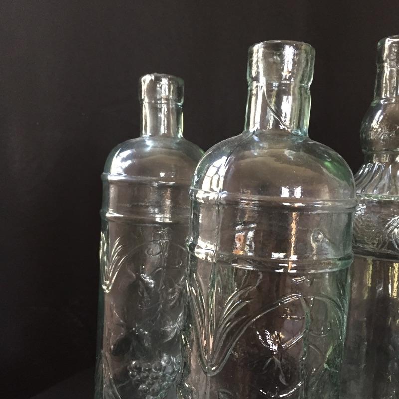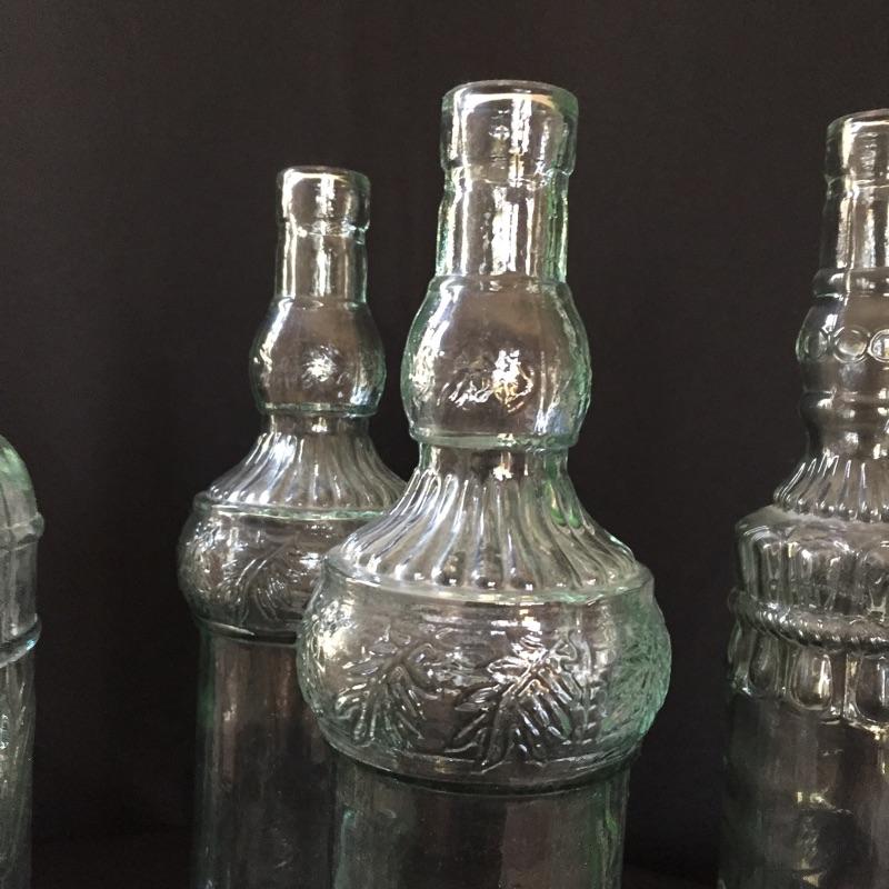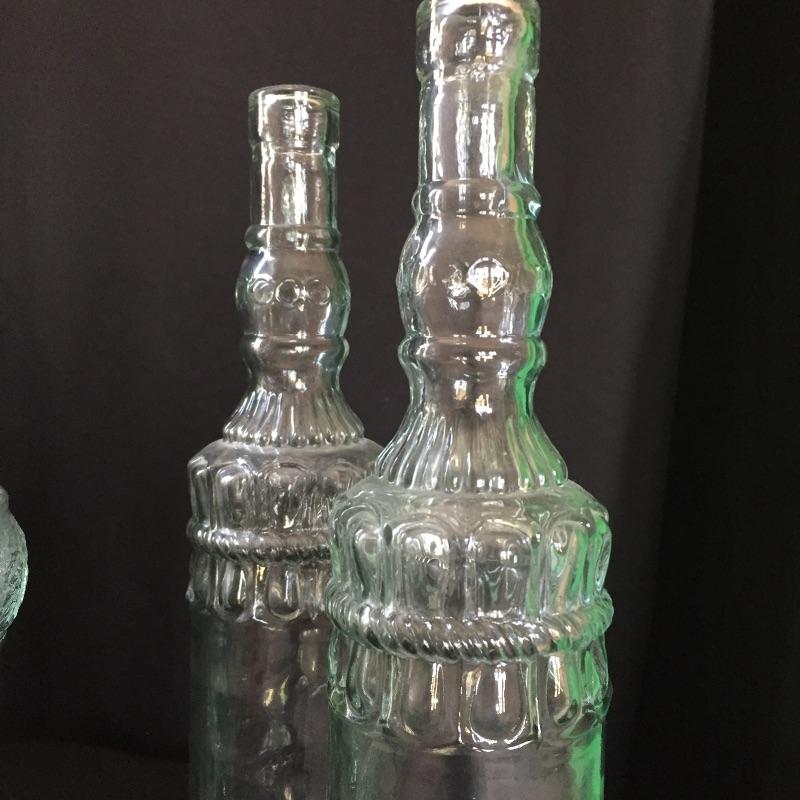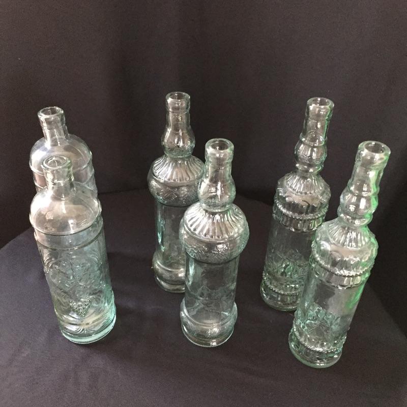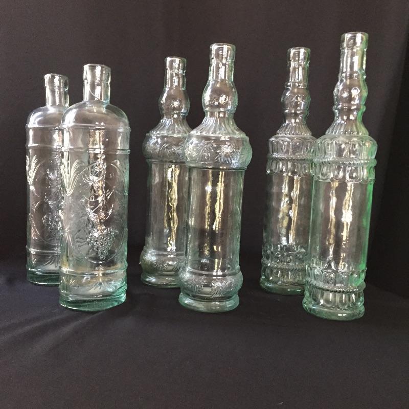 3 matching pairs of pretty glass bottles for a total of 6 bottles. Each pair with its own unique, ornate design. Bottles range in size from 12” to 13.5”.