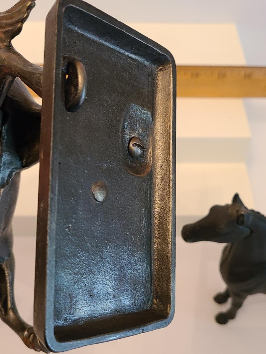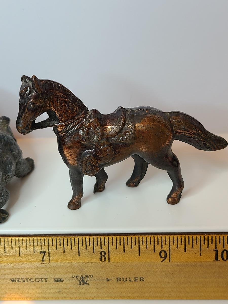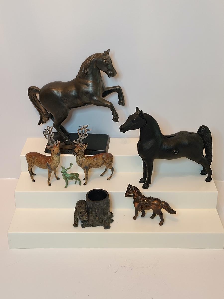 Two metal horse banks, and small metal as-found collectibles. Please see all pictures as they are the best representation of the items. The pictures show condition, measurements if taken, and what is included in the lot. Due to the large amount that we photograph and the time frame, we are not always able to take measurements. All items unless noted, are pre-owned and have been used. If you purchased furniture, you must bring help. We do not allow one person to carry large furniture out on their own. Bring help, tools and a truck for the safety of our client’s homes, and your personal safety. Company policy. Thank you.