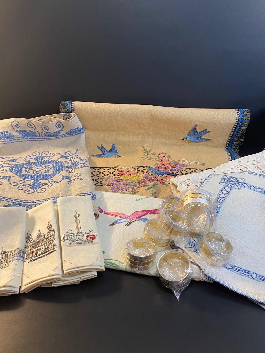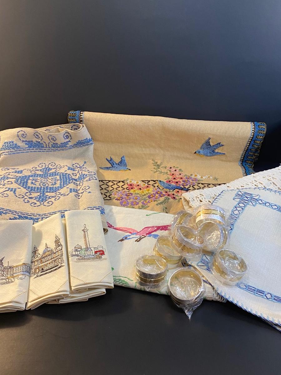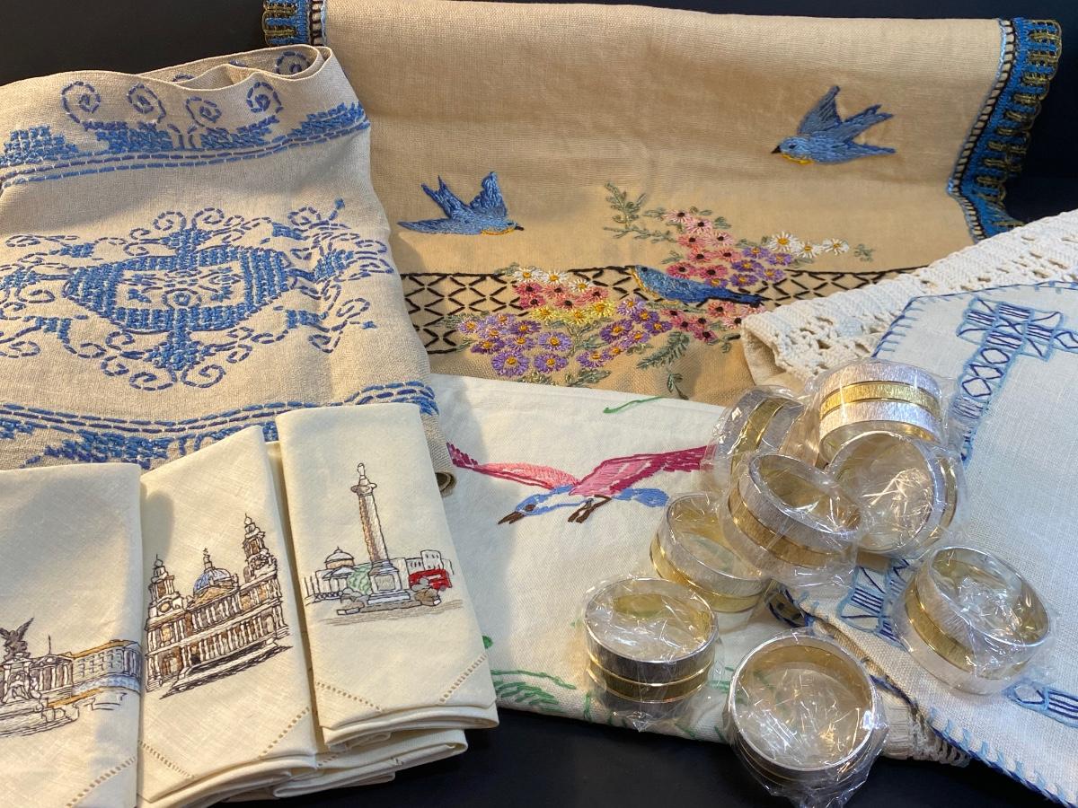Beautiful vintage embroidered table runners, placemats, napkins and napkin rings. Please see all pictures as they are the best representation of the items. The pictures show condition, measurements if taken, and what is included in the lot. Due to the large amount that we photograph and the time frame, we are not always able to take measurements. All items unless noted, are pre-owned and have been used. If you purchased furniture, you must bring help. We do not allow one person to carry large furniture out on their own. Bring help, tools and a truck for the safety of our client’s homes, and your personal safety. Company policy. Thank you.