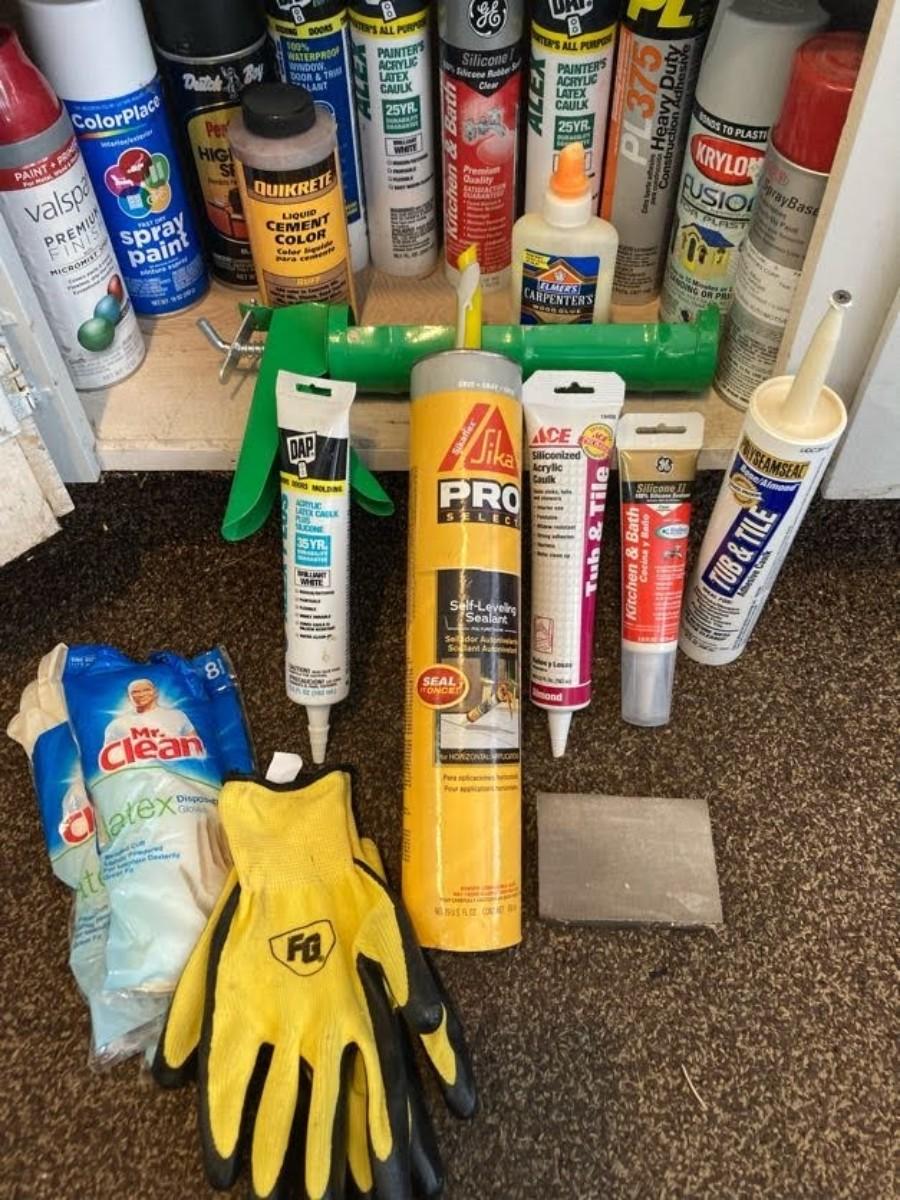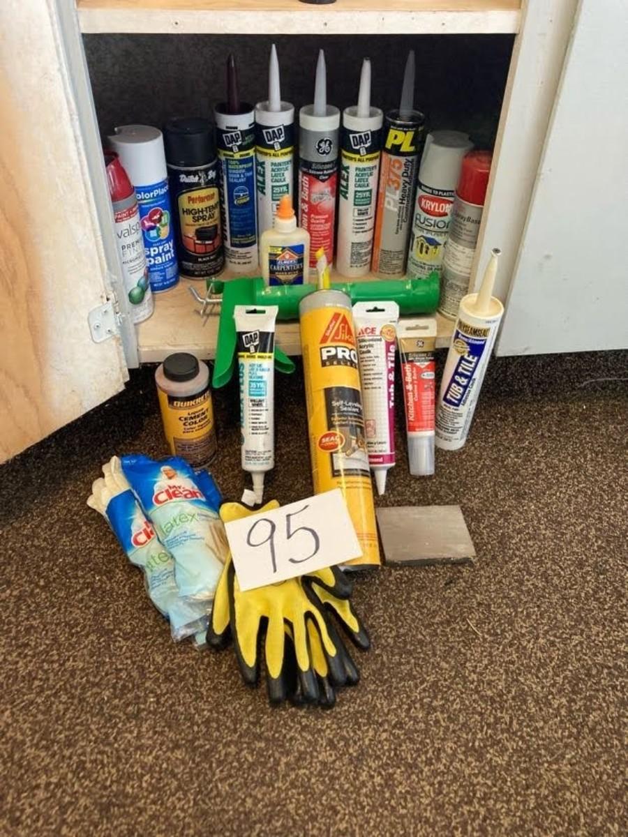 LOT 95  CAULKING, STAINS, LATEX GLOVES AND MORE
