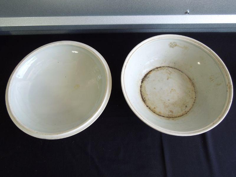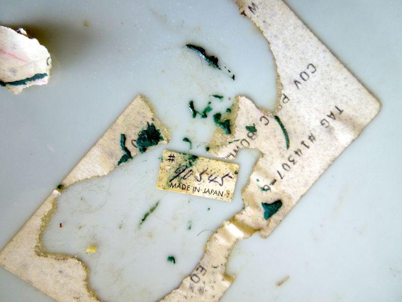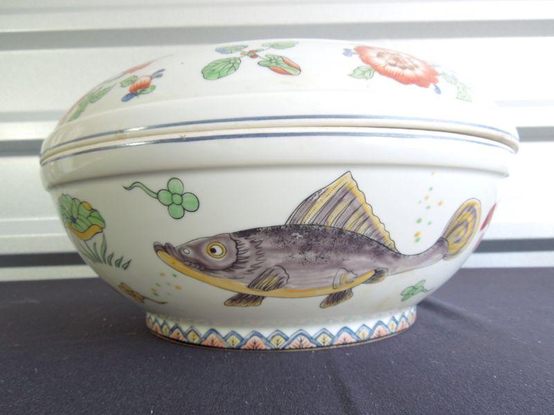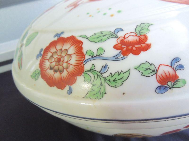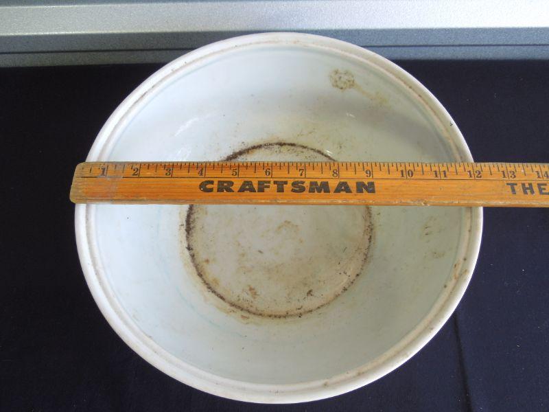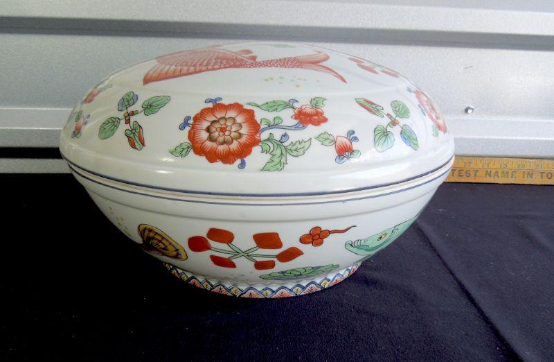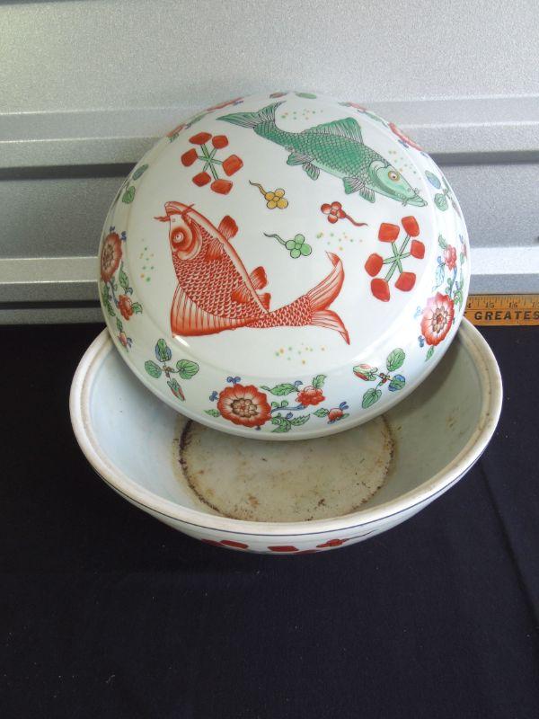 Wonderfully hand painted muted colors. 12" diameter. Lid fits well. No cracks or chips. Needs cleaning. Sticker residue on bottom.