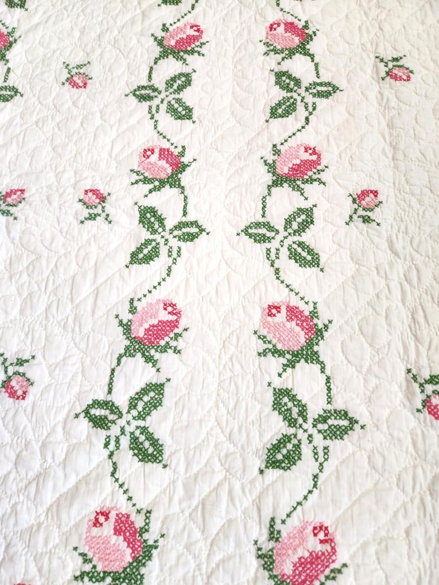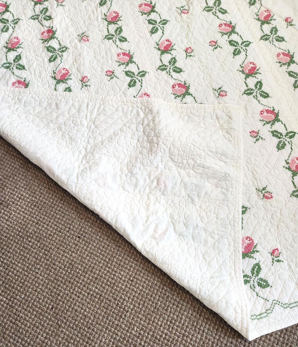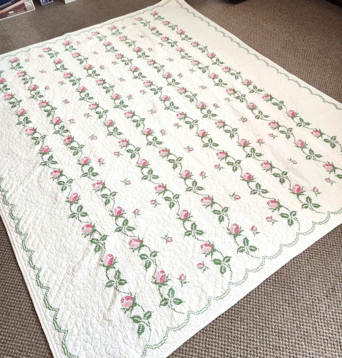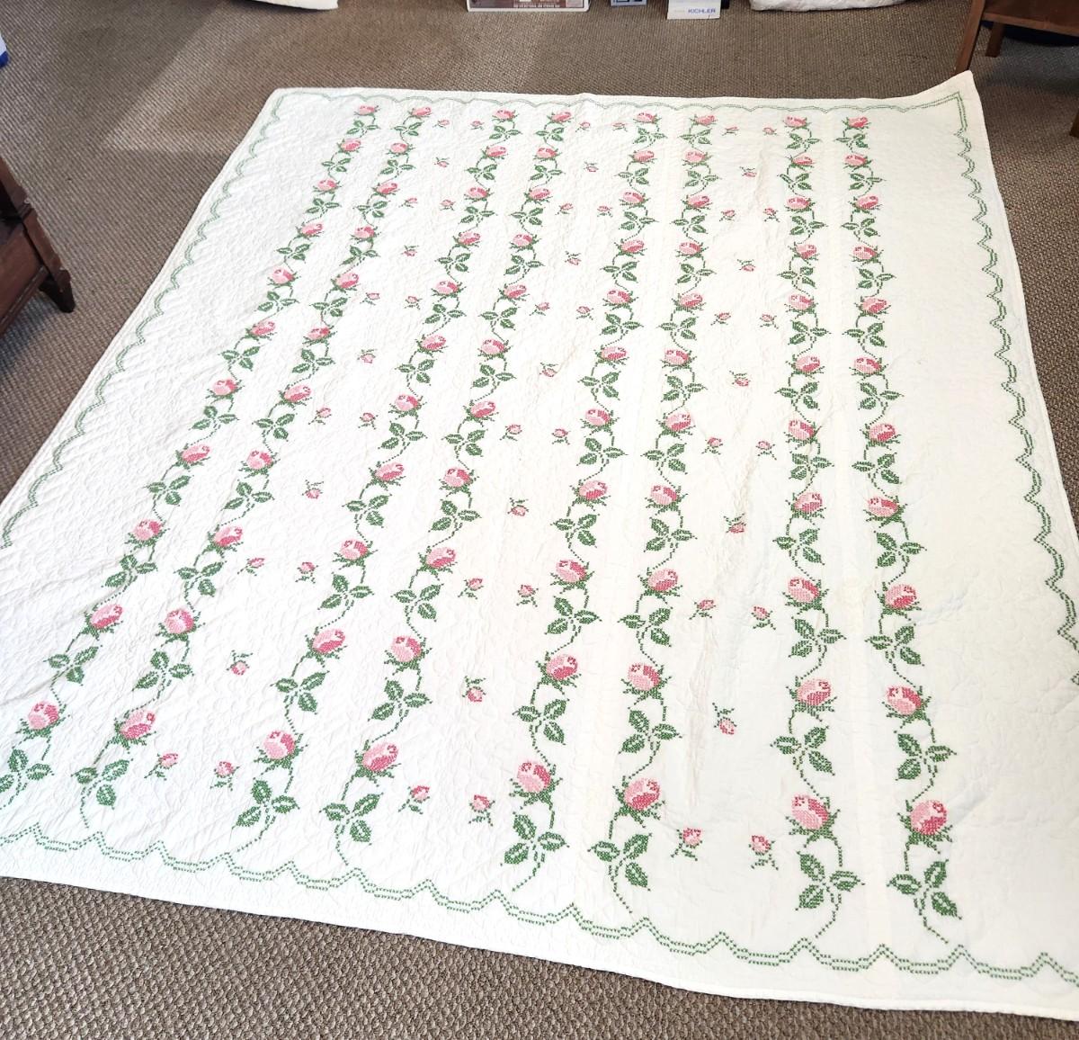 Lot #95 Beautiful Hand Cross Stitched Quilt/Comforter - Pink Rose Trellis design