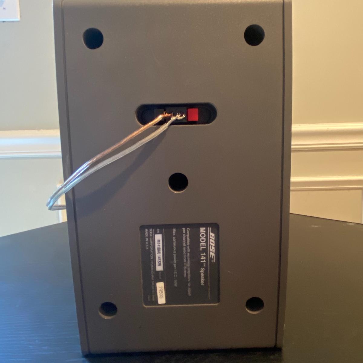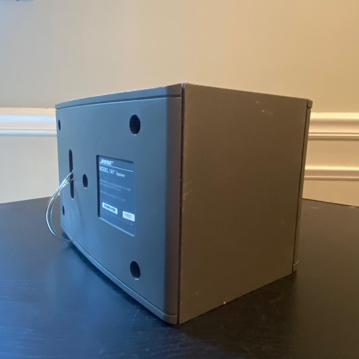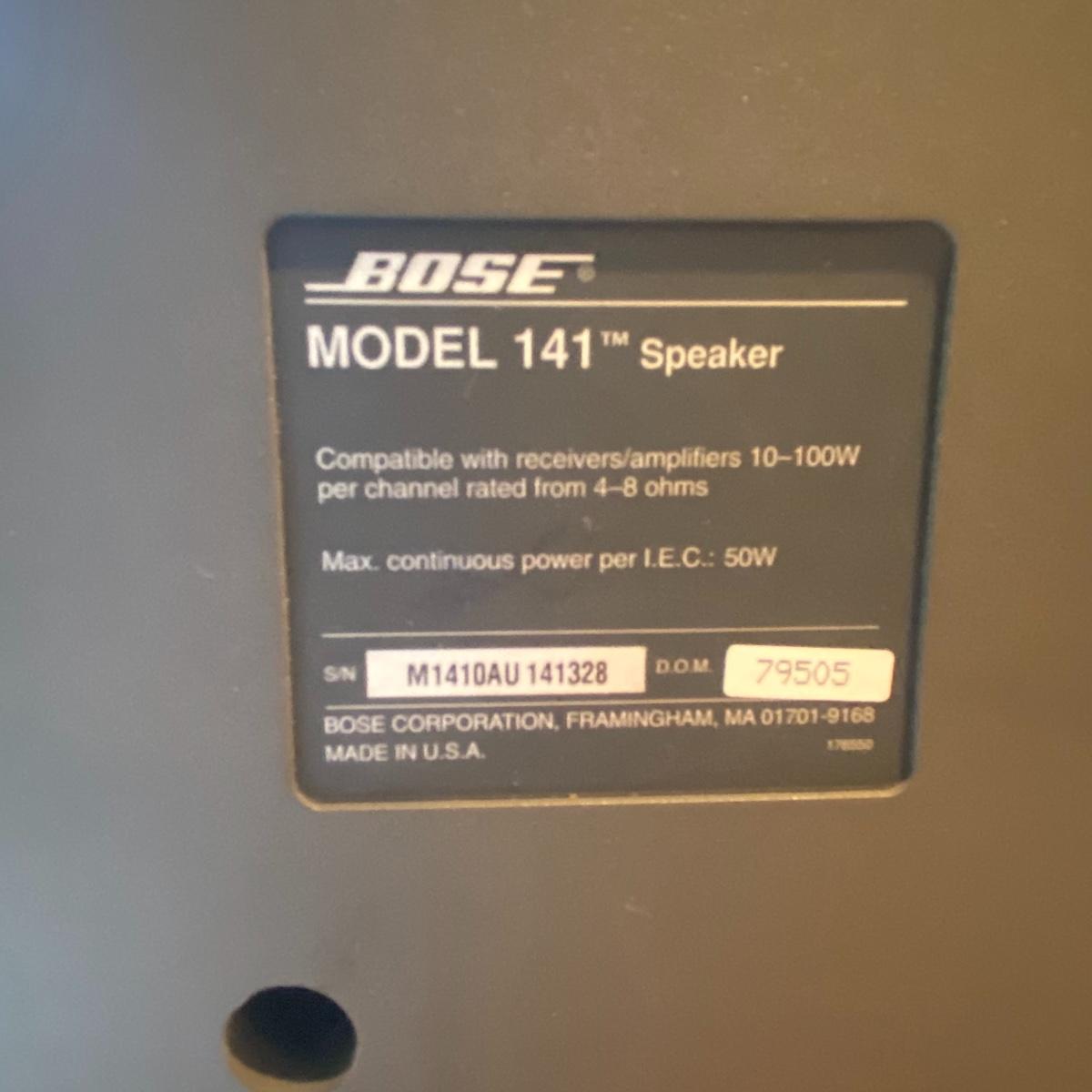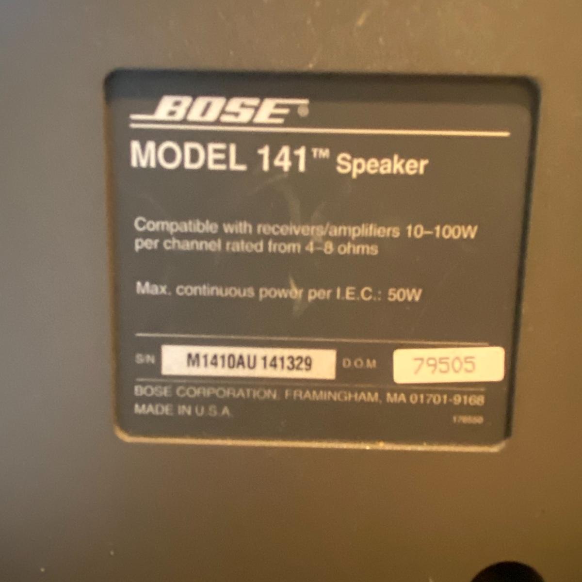 Enjoy your music with this pair of Bose speakers. Lot includes two Bose speakers model # 141 that measure 6”X6.5”X10. Speakers were not tested.