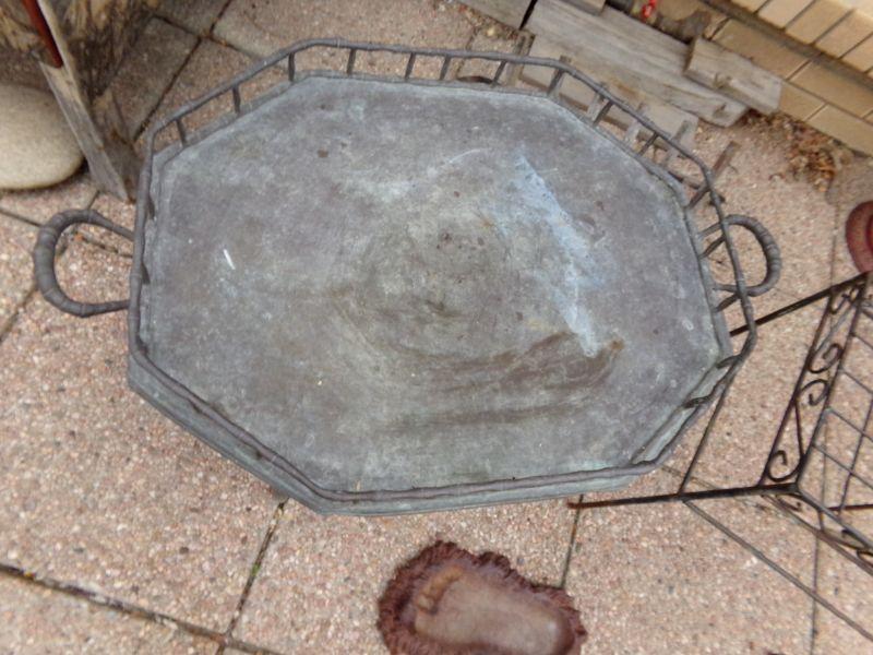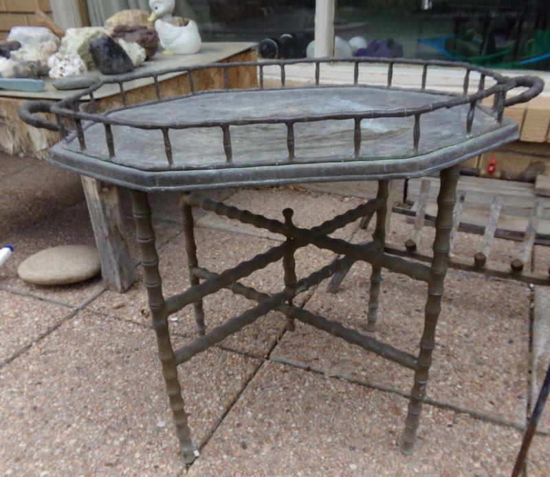 BRASS TRAY TABLE IS A 2 HANDLED TRAY THAT SITS ON A BRASS BASE. THE TRAY MEASURES 21” X 16”. IT HAS BEEN AN OUTSIDE TABLE SO APPEARS A LITTLE WEATHERED BUT IN GOOD CONDITION