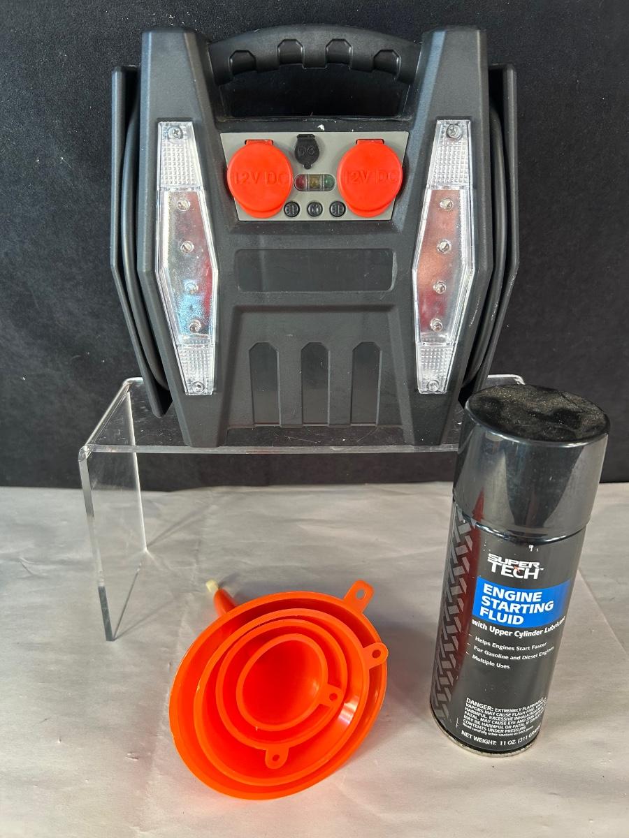 Lot 95. Car Starter, Starting Fluid, New Funnels