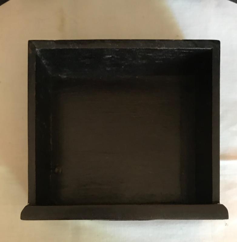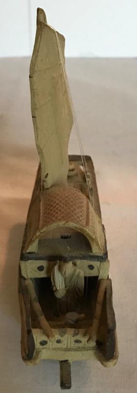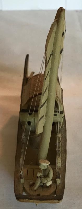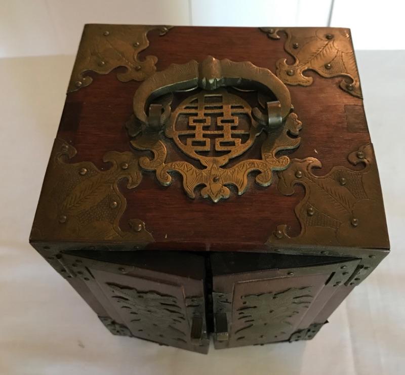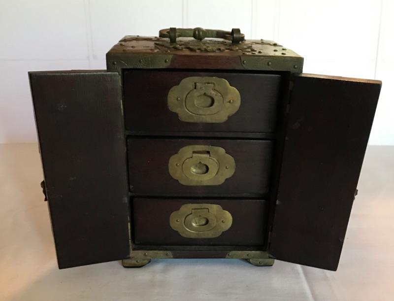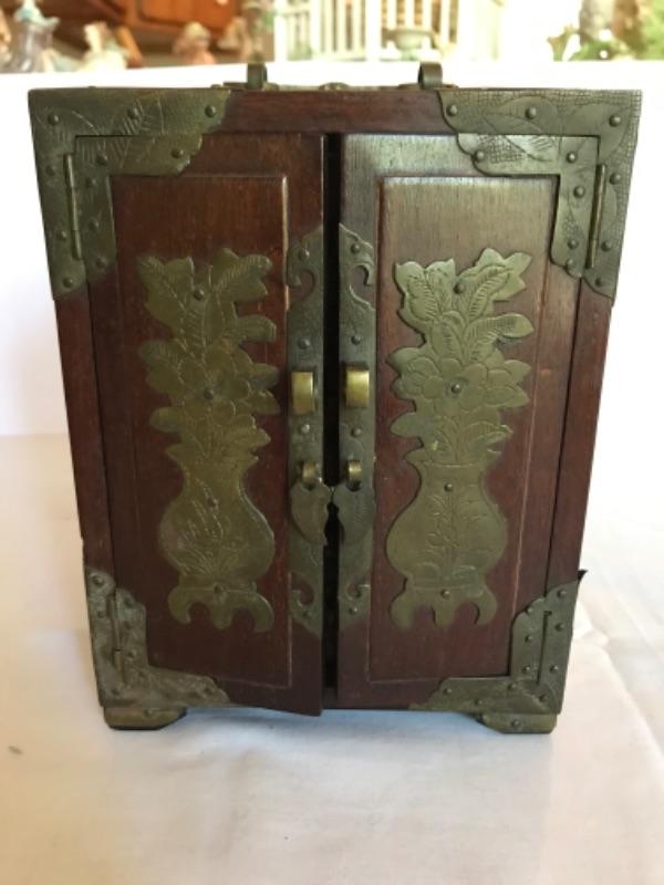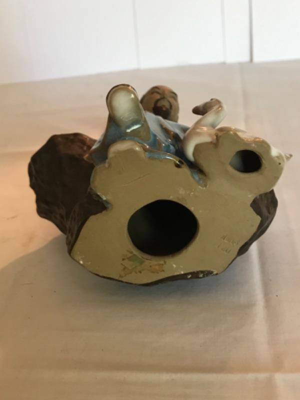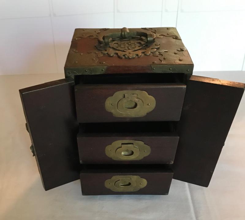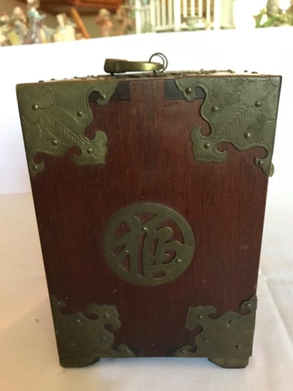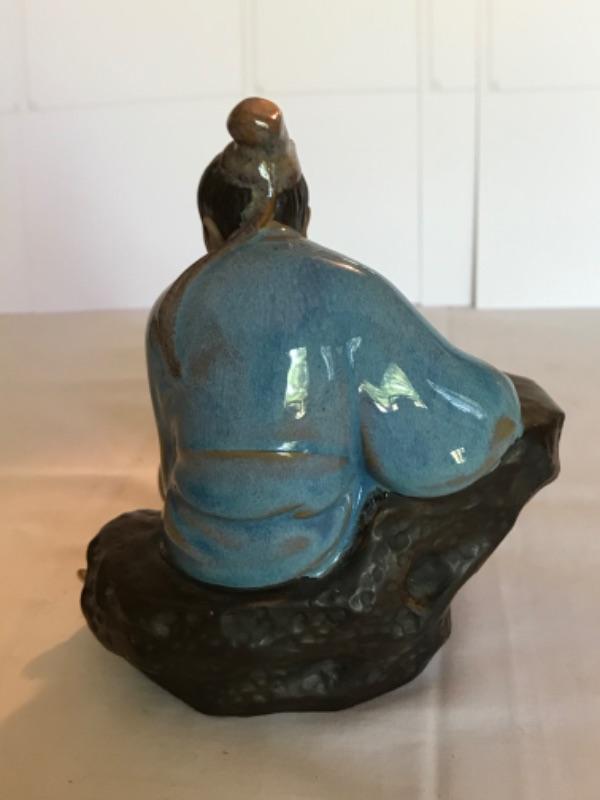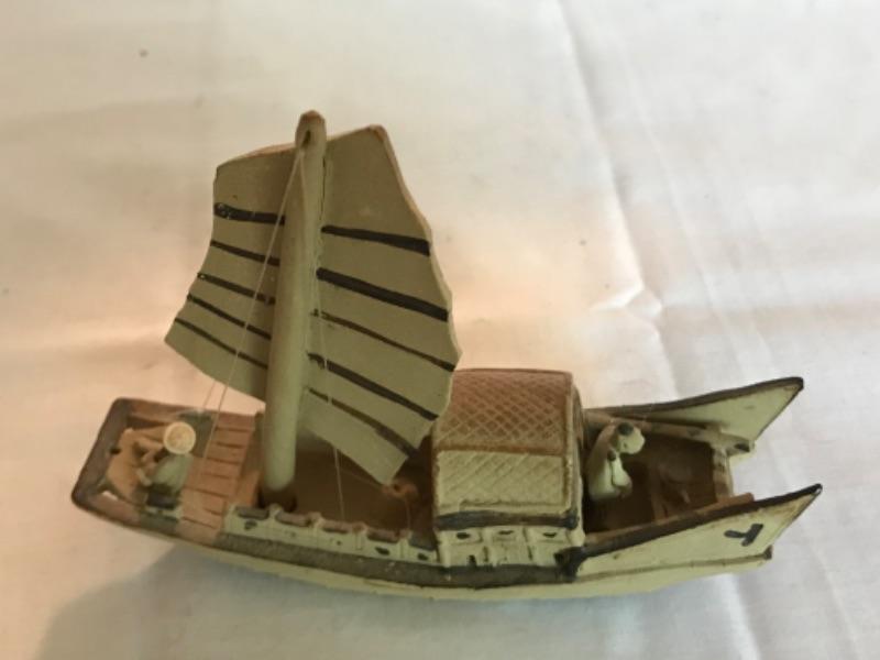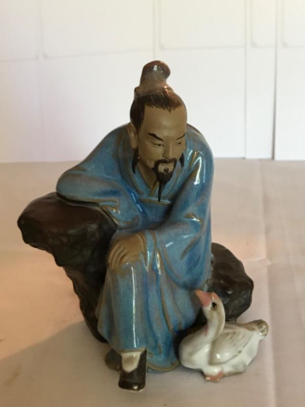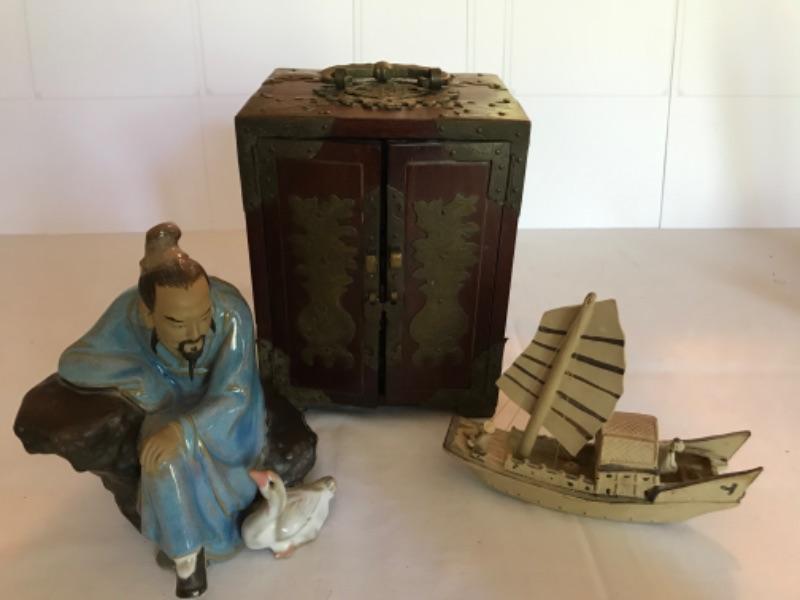 Wood and Brass Chinese tea box, 7” tall 5-1/2” wide and 5” deep, has three drawers that measure 4-1/4”x4” and 1-1/2” deep, stamped “made in China” on bottom. Small sailboat decor. Pottery Asian man sitting on rock with a goose, 6” tall
