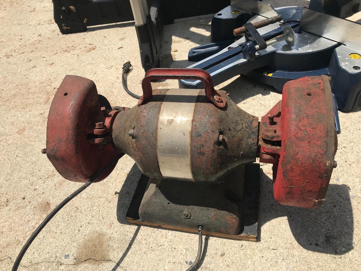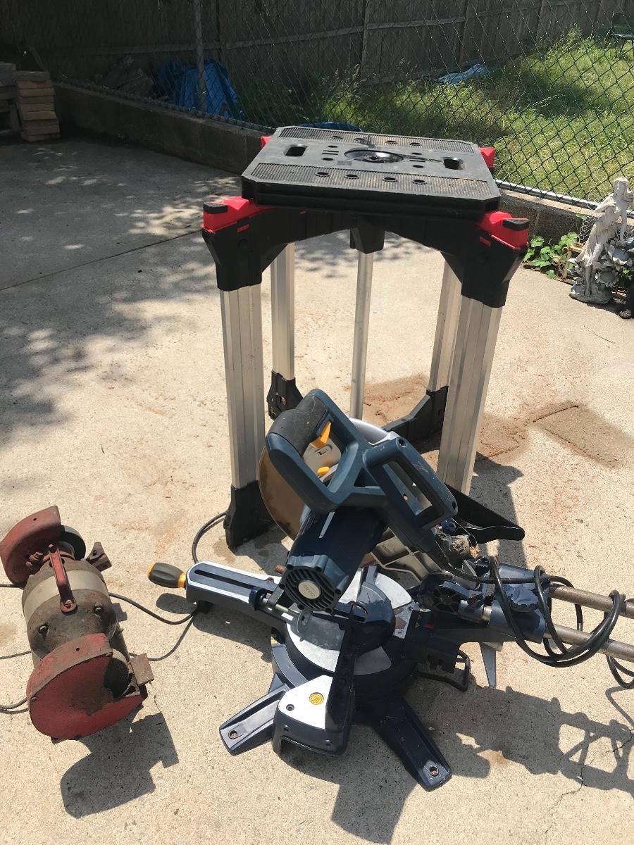 A GMC 10 inch, 15amp miter saw, Black and Decker heavy duty bench grinder, and a work table for the saw. Please see all pictures for content of the lot, condition of the lot, and measurements if taken. Pictures are the best representation of the items listed and items are untested unless indicated in description. Thank you for looking and have fun bidding!