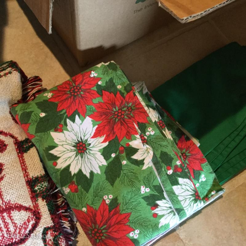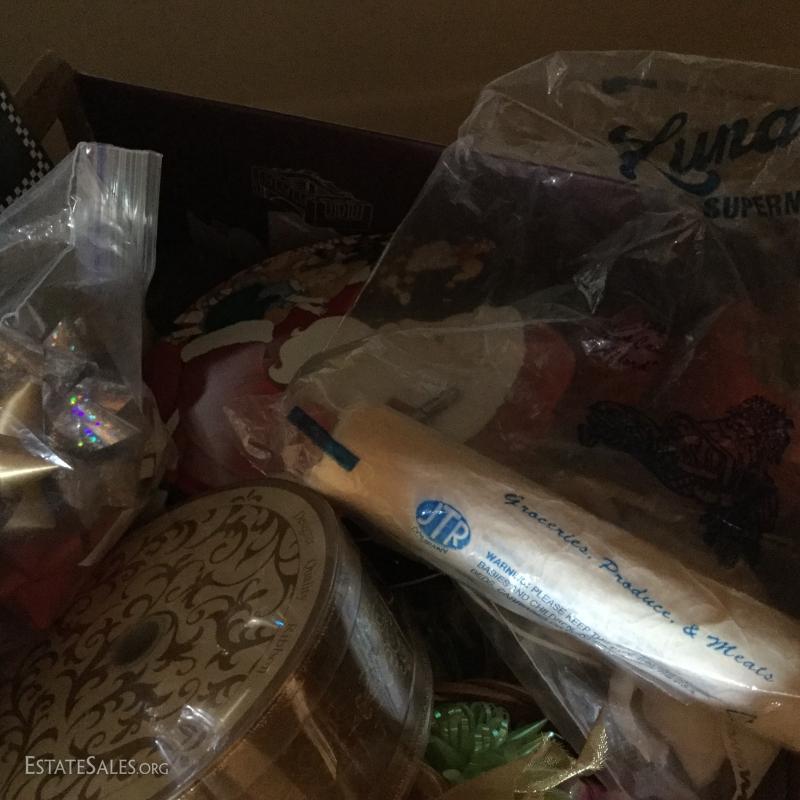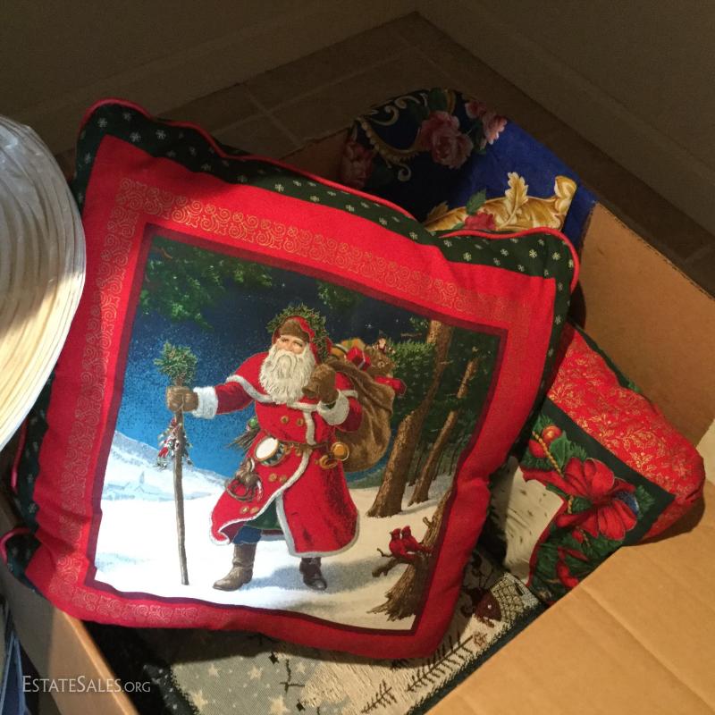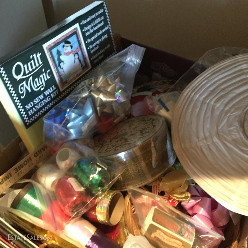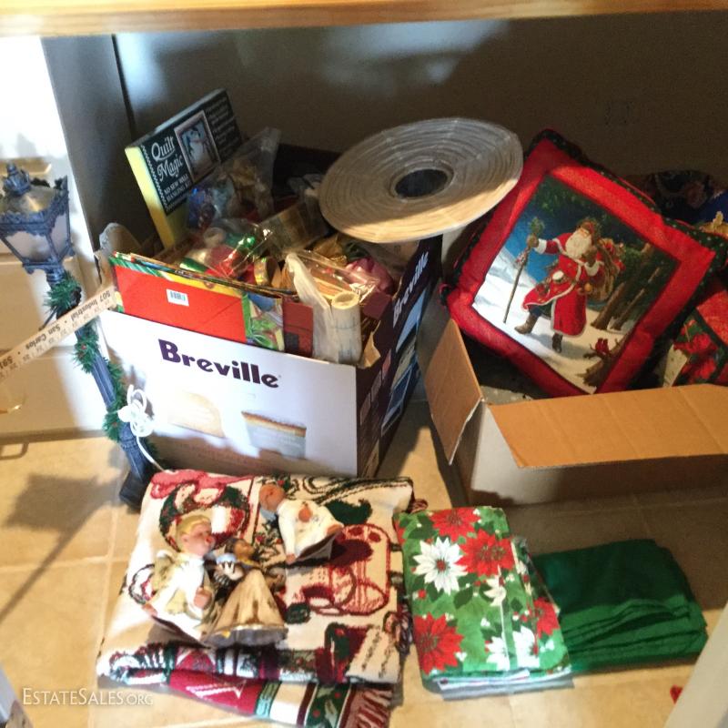 Assorted Christmas decor. Includes pillows and wrapping items. Several misc. crafting items such as quilting kits. See photos.