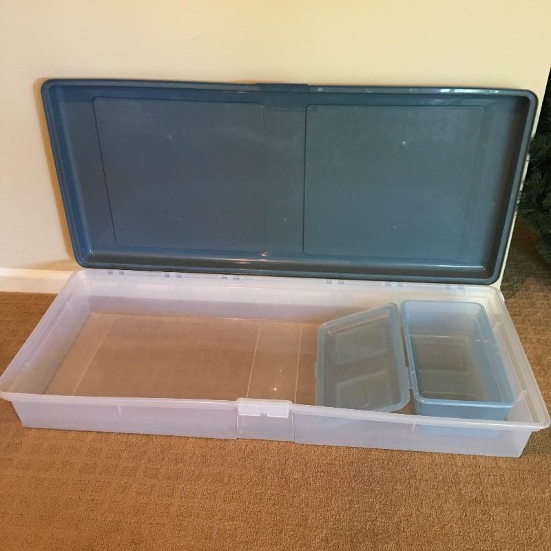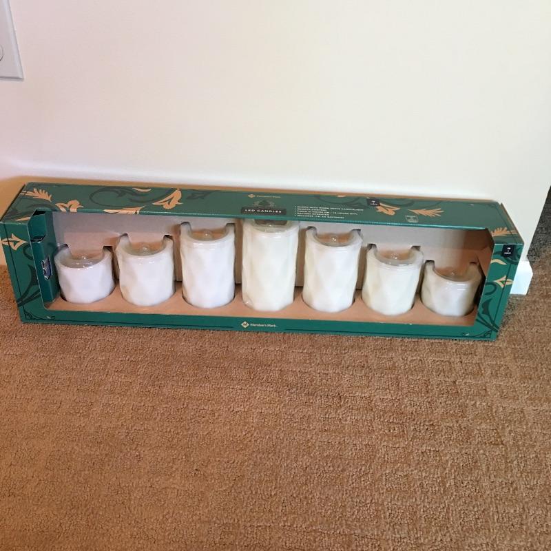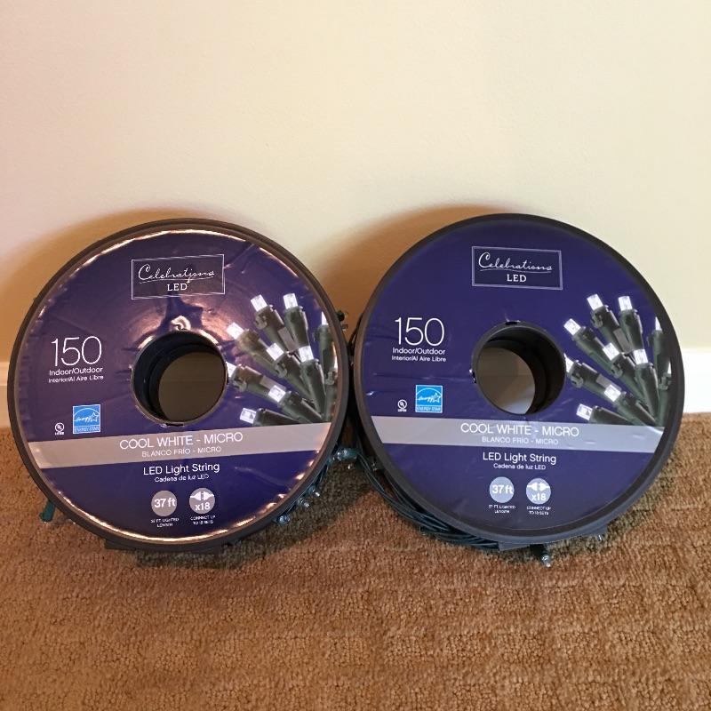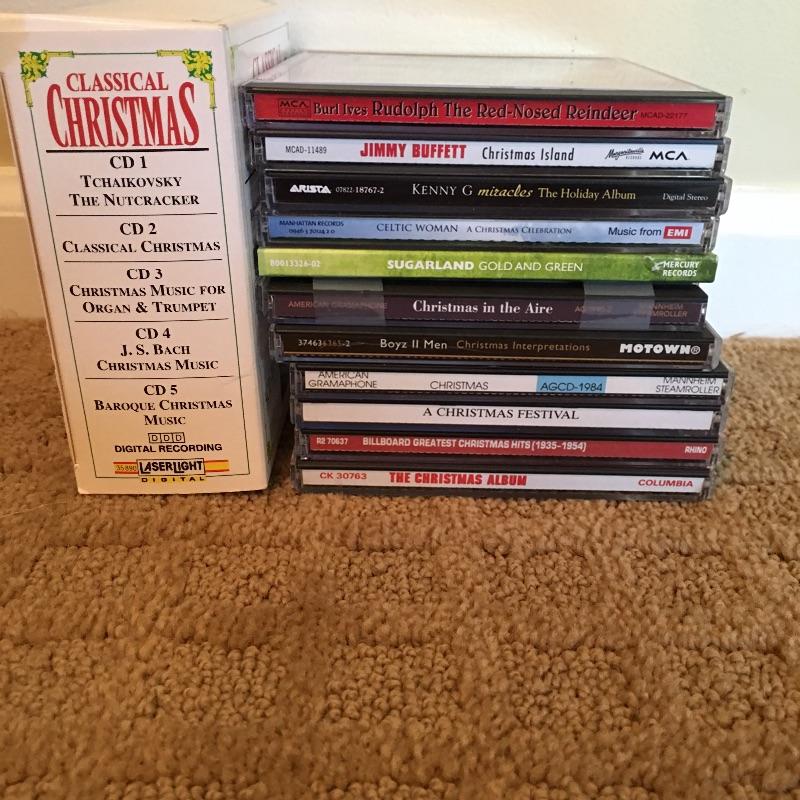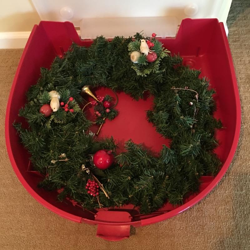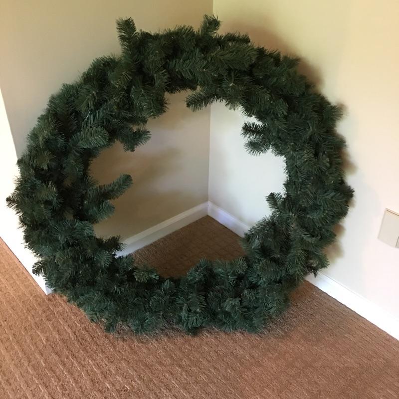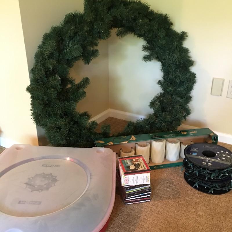Christmas essentials including large and medium wreath,two rolls of lights and Christmas CDs. Largest wreath measures 38” D.