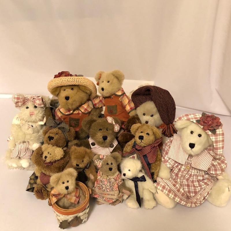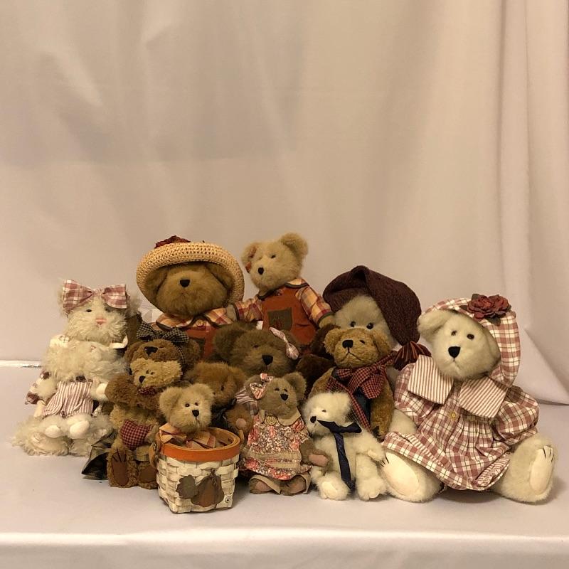 This adorable collection of fall like Boyd's bears is rich in fall colors with a hooded brown and green plaid coat with fur trim worn by bear with tan hat with flower, and a cute fall basket holding the baby bear in the front row.
