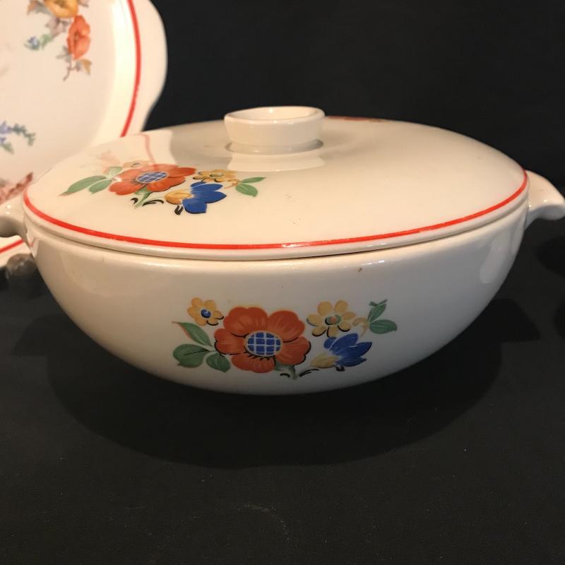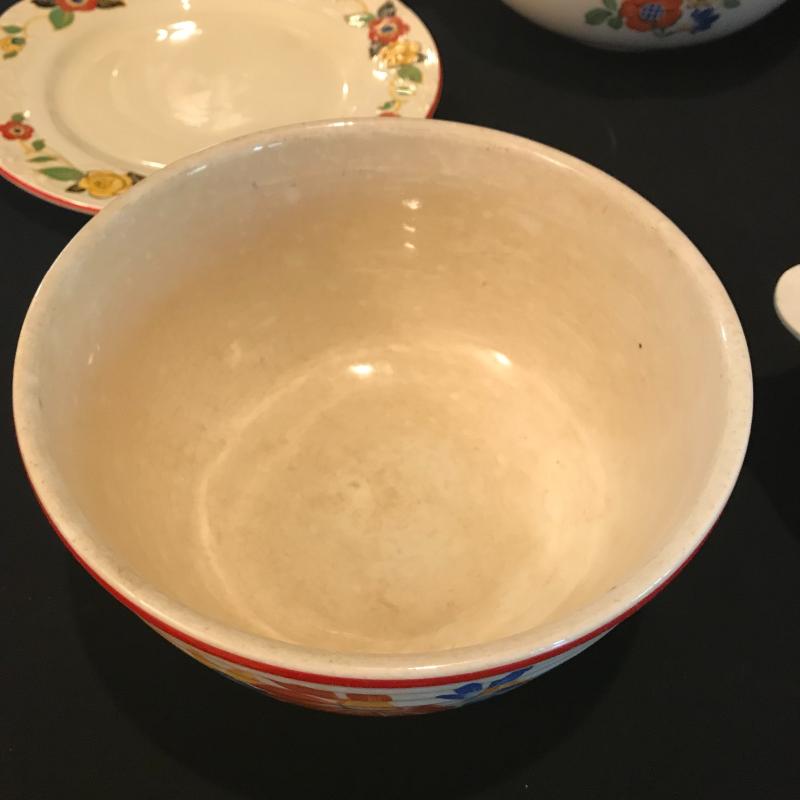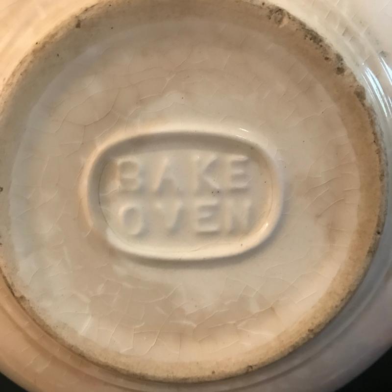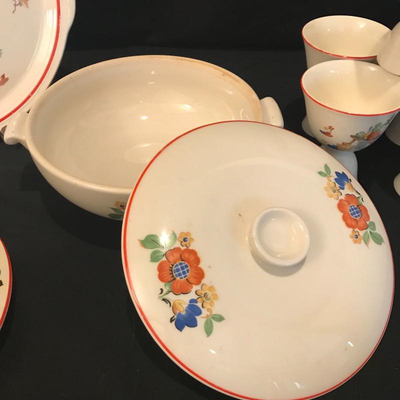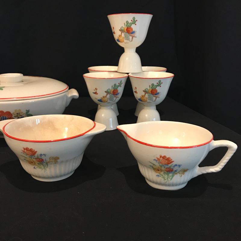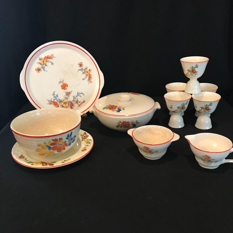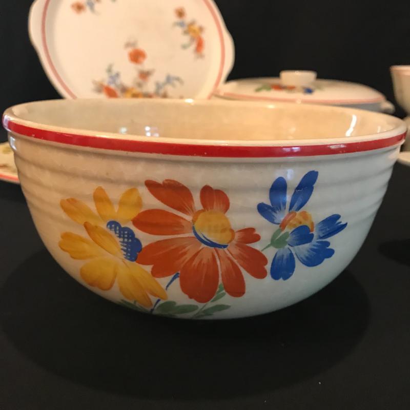 Cream colored with red edging and floral designs. This is not a set but pieces compliment one another. Everbrite, Bake Oven, Oven Serve and Kitchen Boutique are the makers of most pieces. There is some crackling in glazing (see pics). Lot is available for shipping or local pick up in Asheville, NC.
