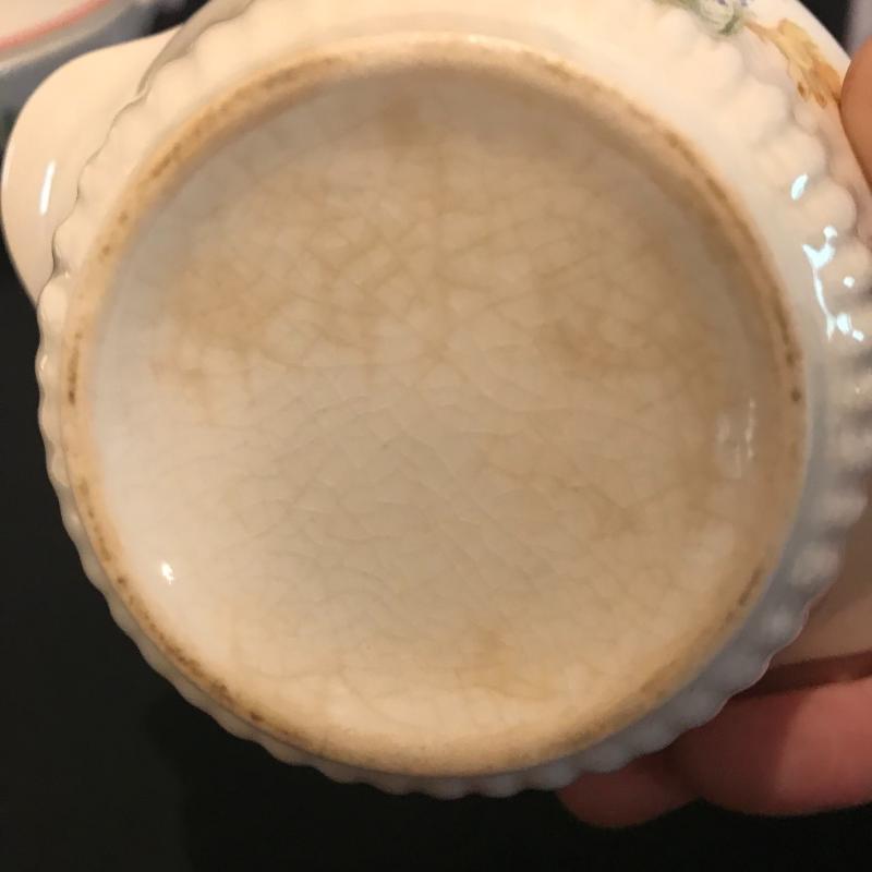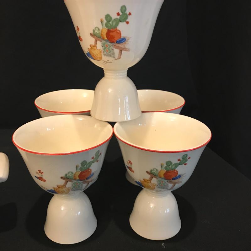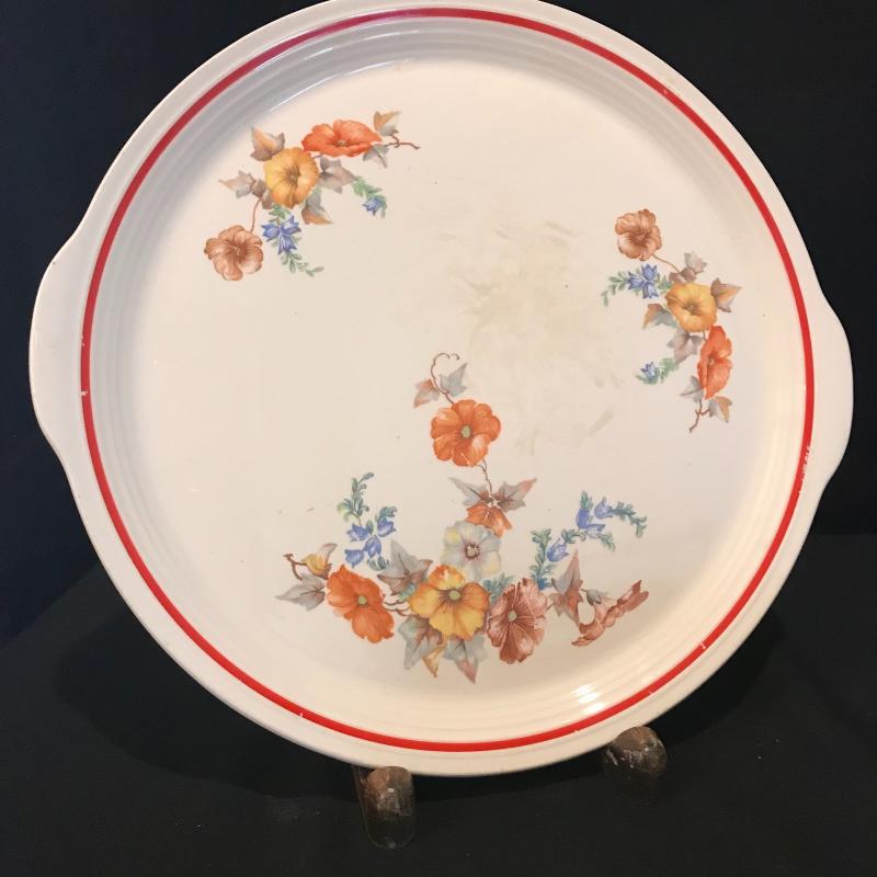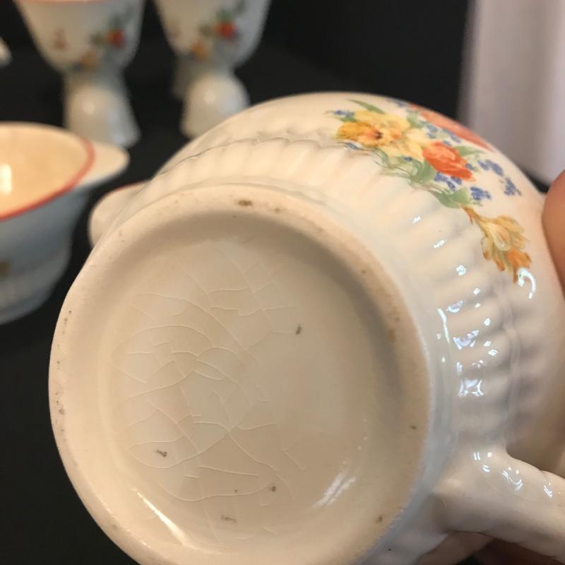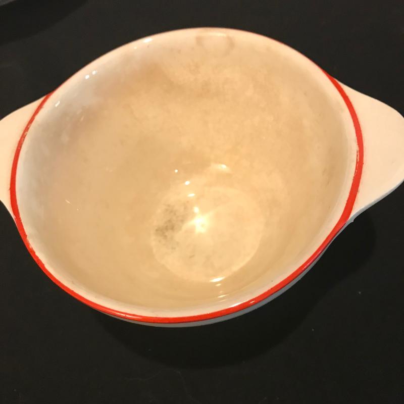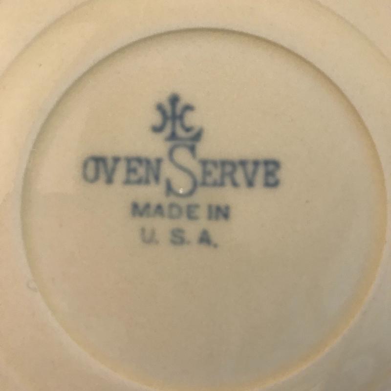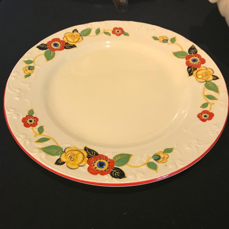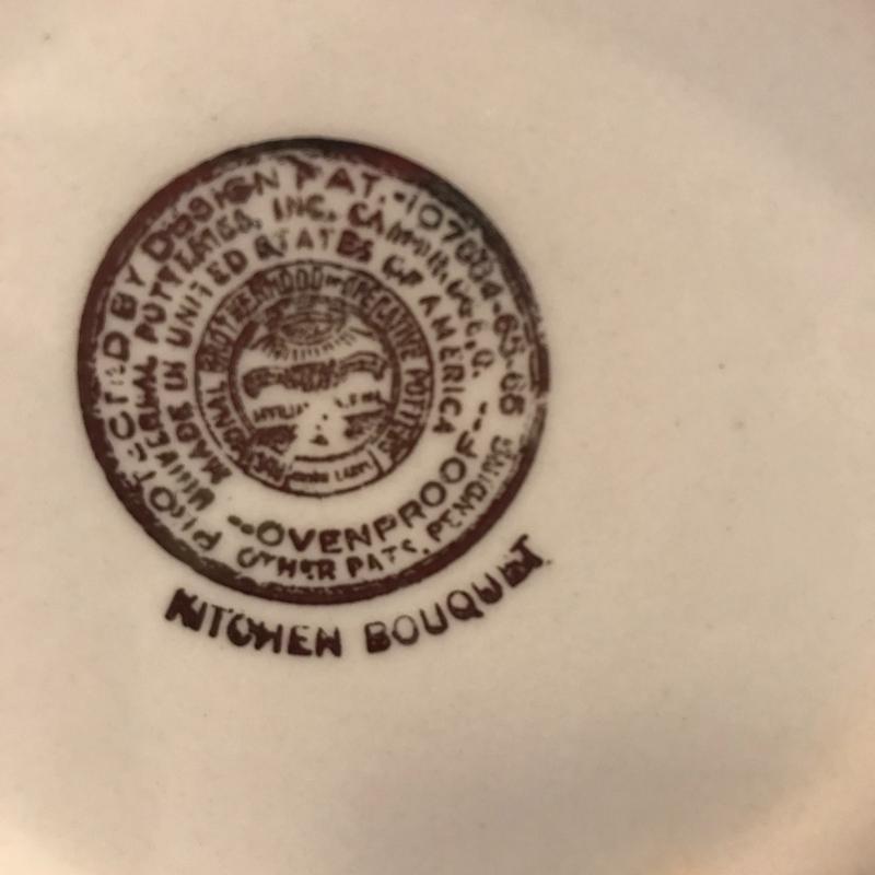 Cream colored with red edging and floral designs. This is not a set but pieces compliment one another. Everbrite, Bake Oven, Oven Serve and Kitchen Boutique are the makers of most pieces. There is some crackling in glazing (see pics). Lot is available for shipping or local pick up in Asheville, NC.