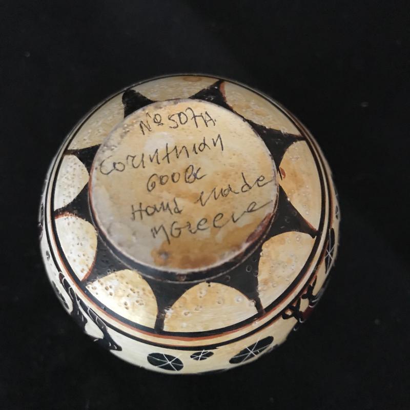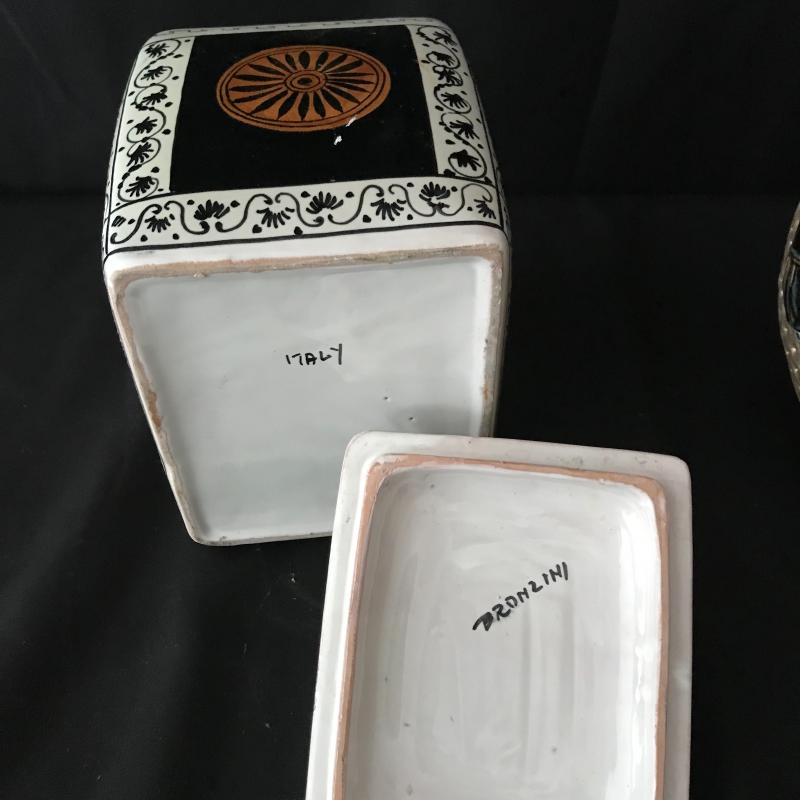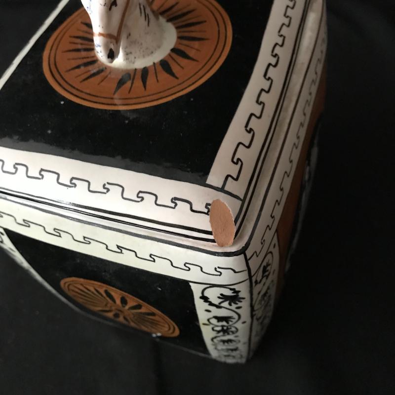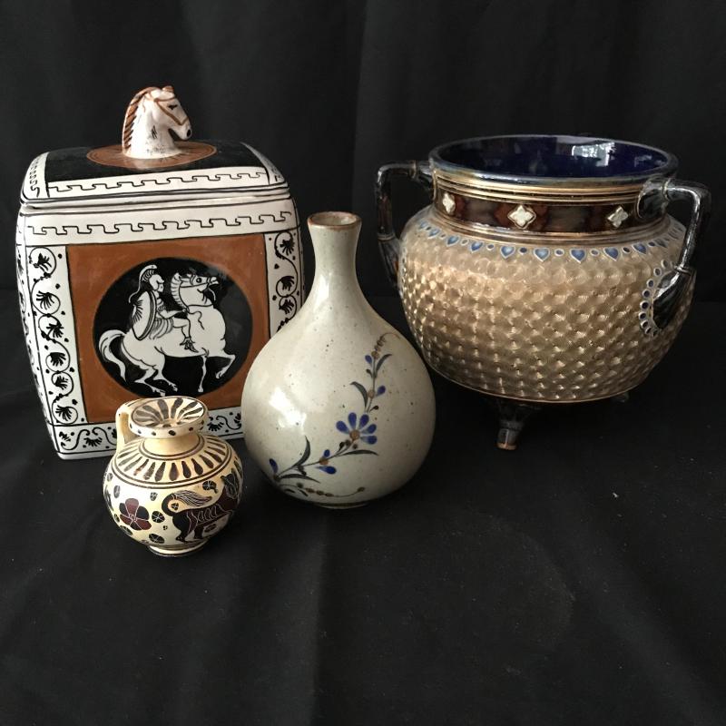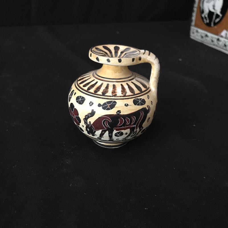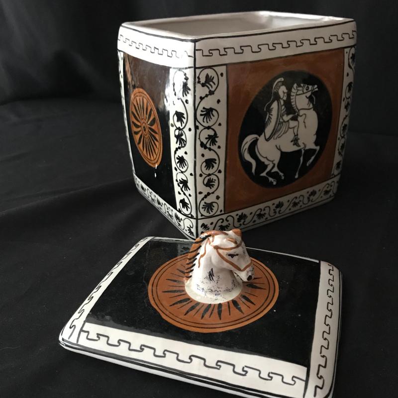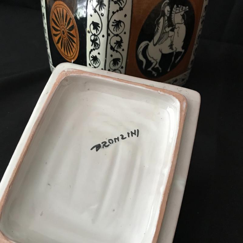 Collection of astonishing pottery includes a Greek Corinthian pot, appears to have No 50th near signature, see photo. The mid-century box with a horse bust handle and Roman motif is signed Bronzini under the lid and Italy on the bottom of box. Small chip in lid, see photos. Lastly, two taller round pots apparently do not have signatures. See the ornate details on both. Shipping available.