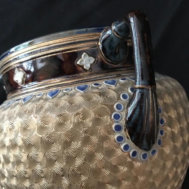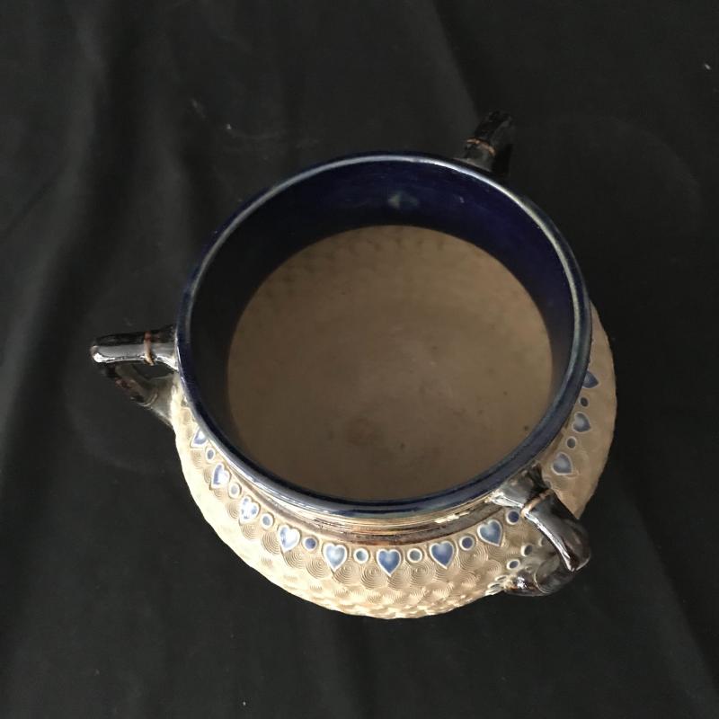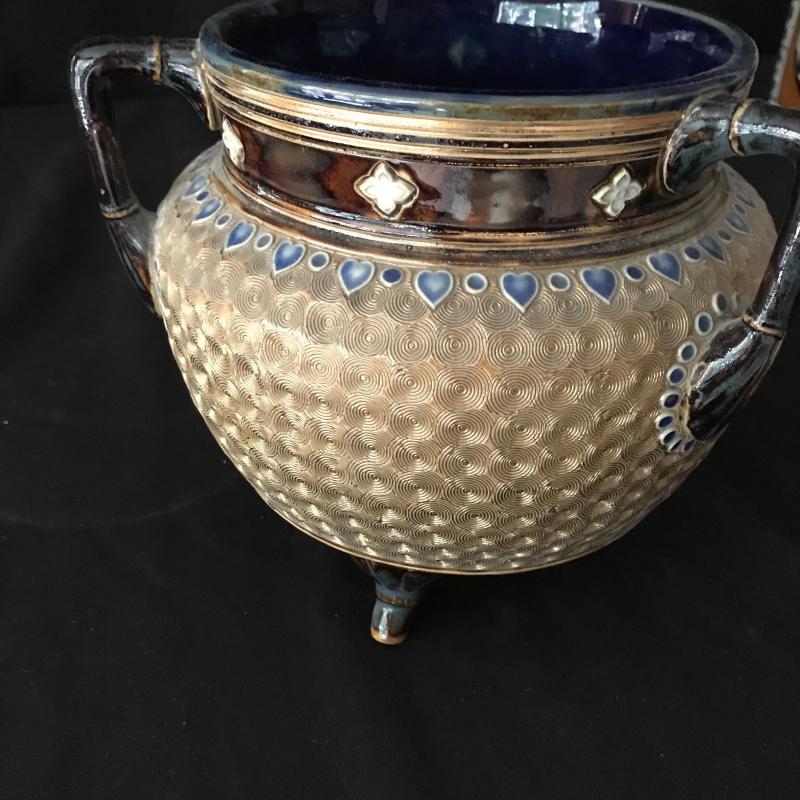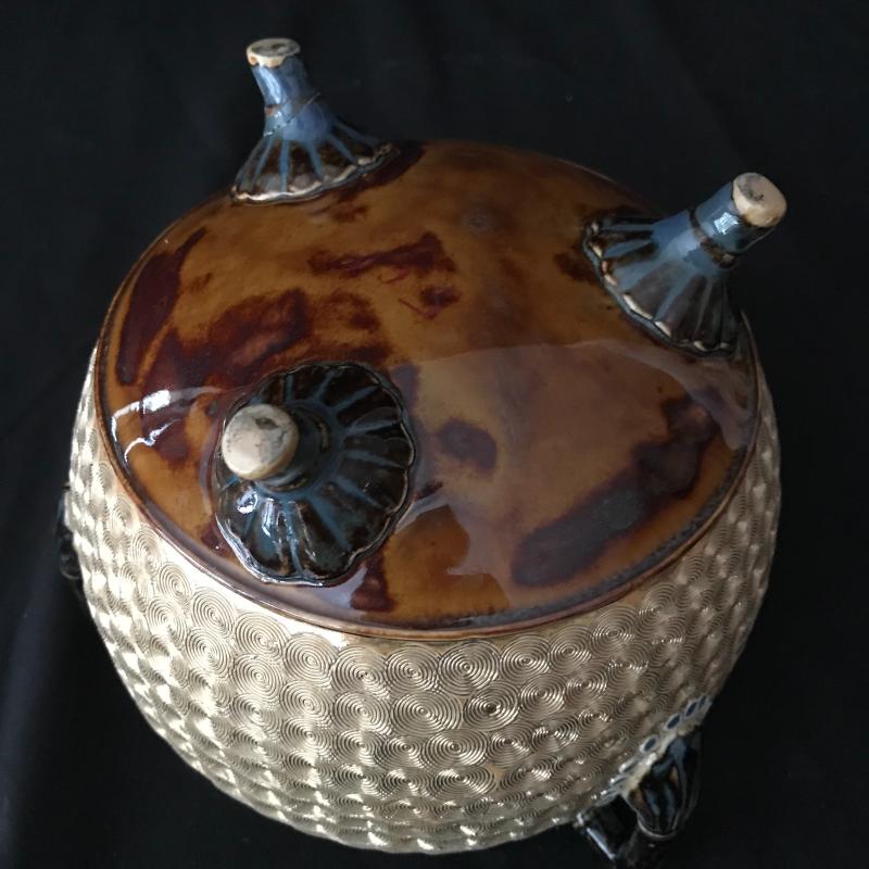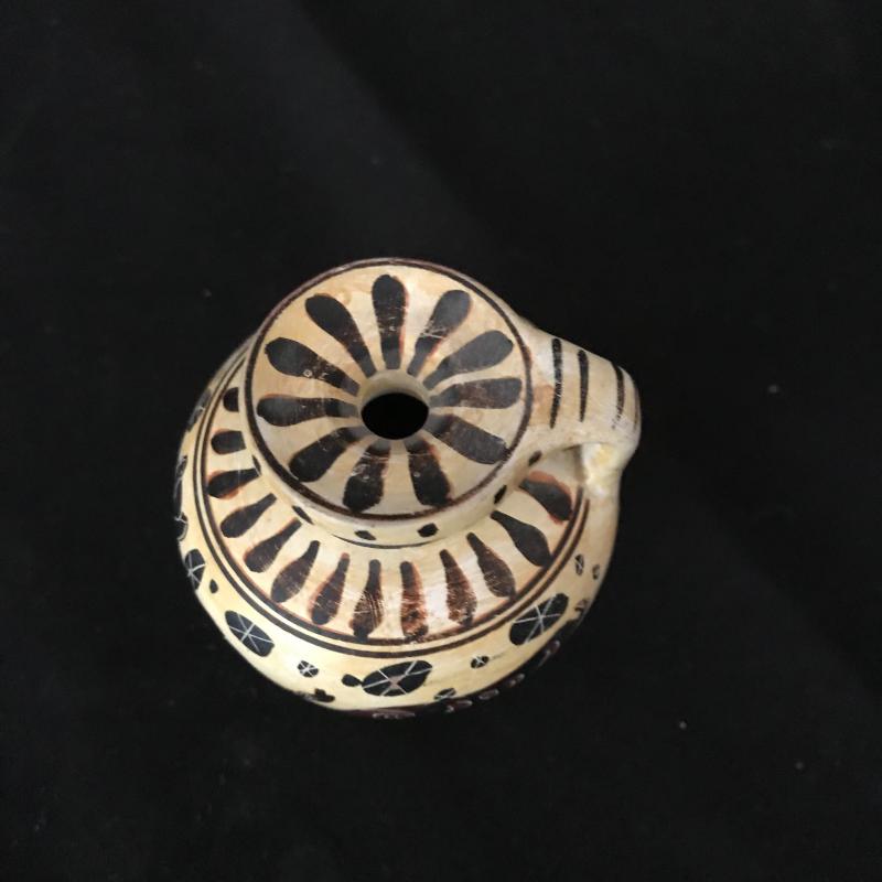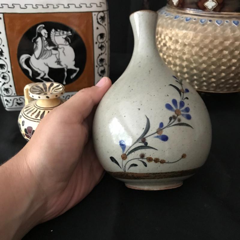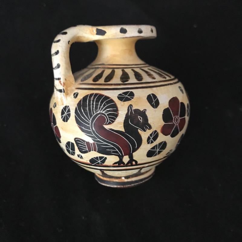 Collection of astonishing pottery includes a Greek Corinthian pot, appears to have No 50th near signature, see photo. The mid-century box with a horse bust handle and Roman motif is signed Bronzini under the lid and Italy on the bottom of box. Small chip in lid, see photos. Lastly, two taller round pots apparently do not have signatures. See the ornate details on both. Shipping available.