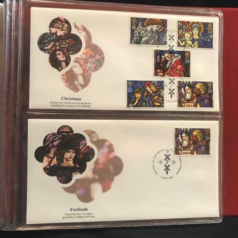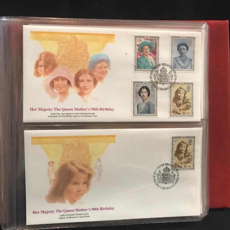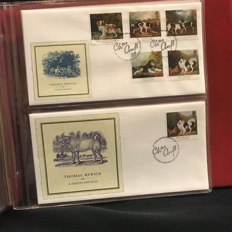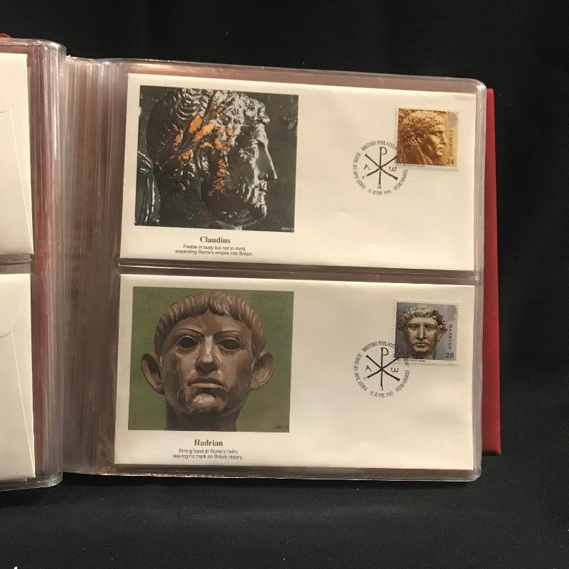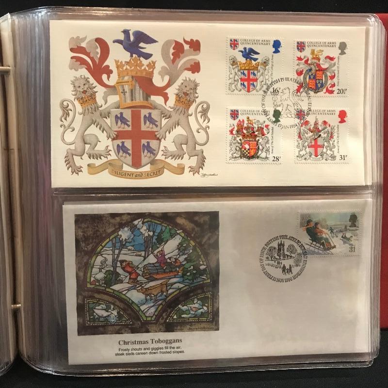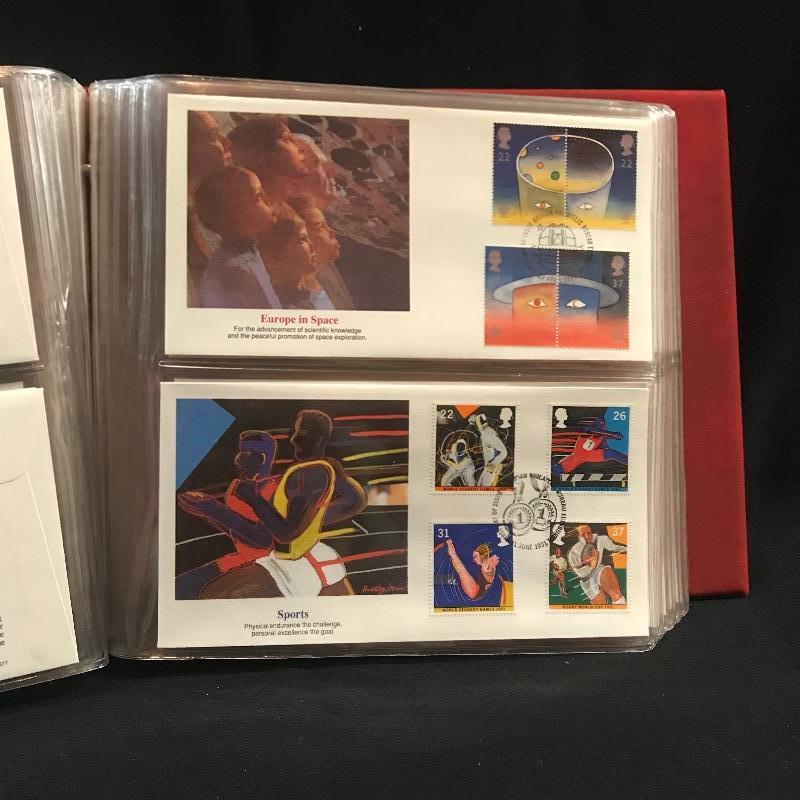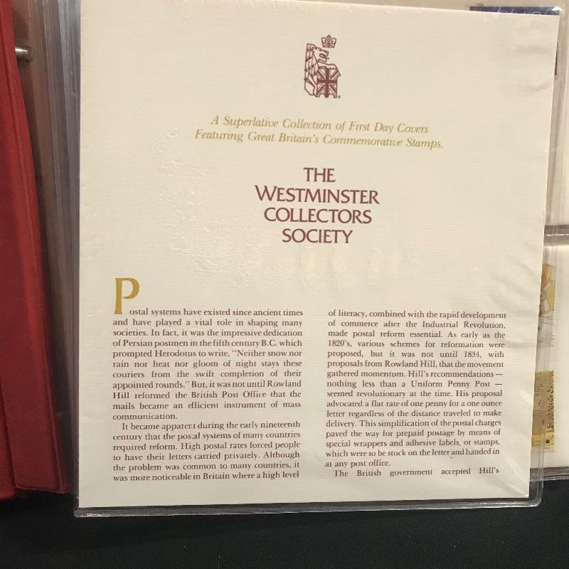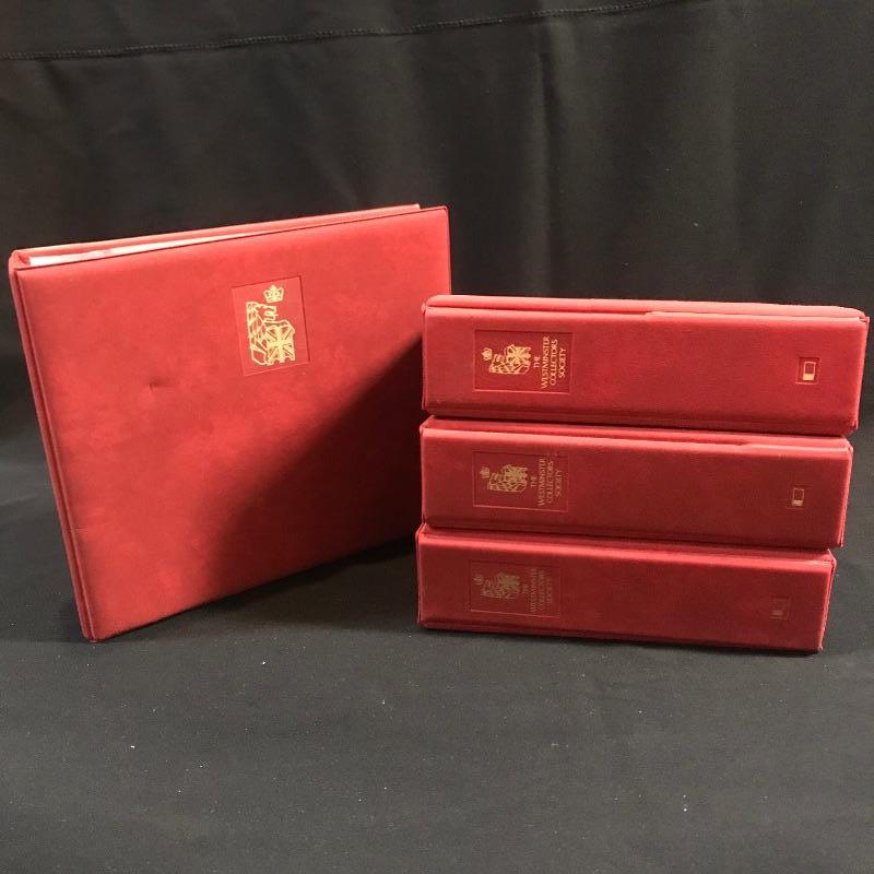 Four leather-like red binders from The Westminster Collectors Society with cancelled 1st day covers. Genres range across the board, mostly from the 1990s, a couple found from the 1970s. Each binder has just under 30 pages with 2 covers each. Title page shown in photos is in each binder.